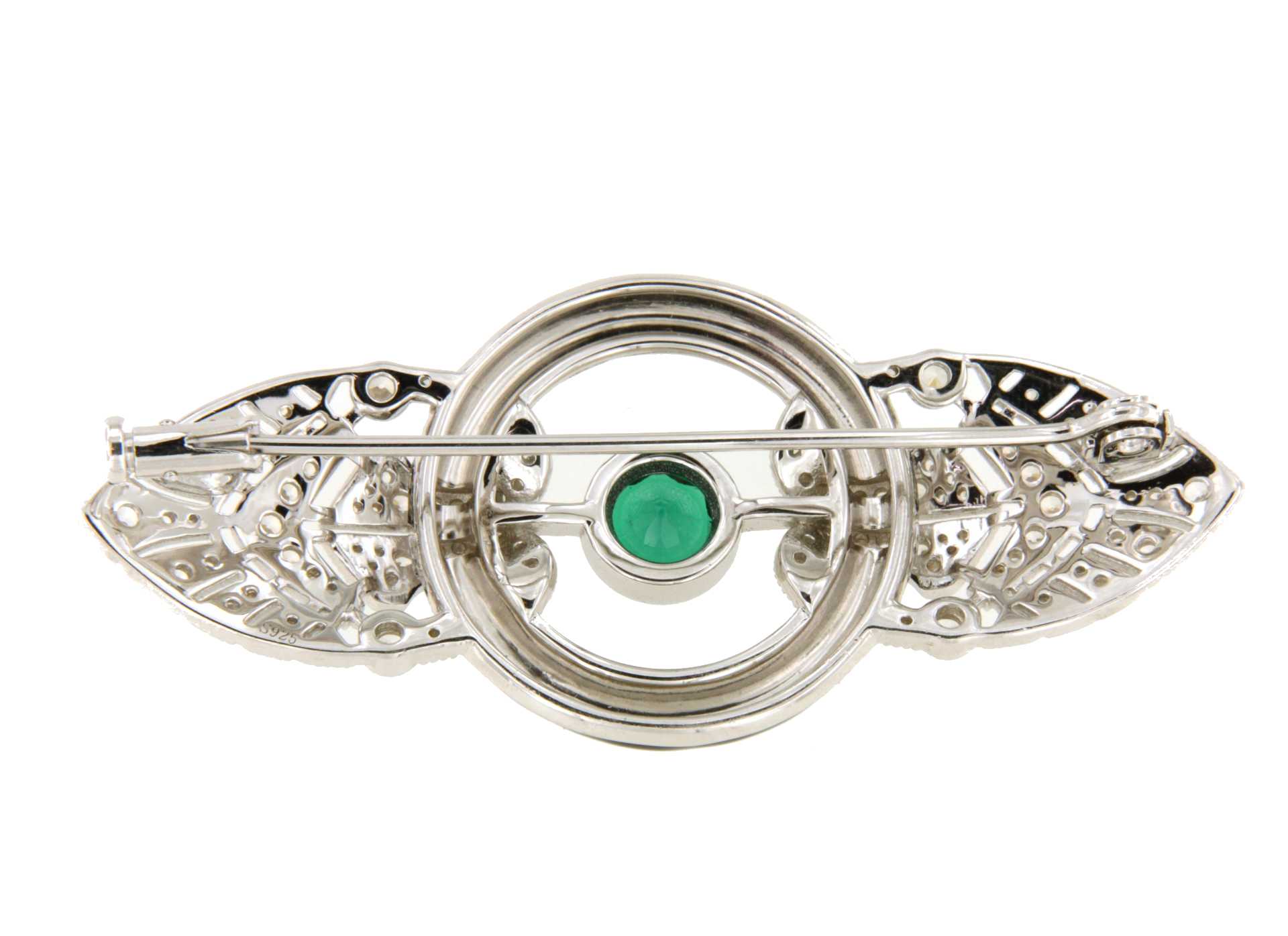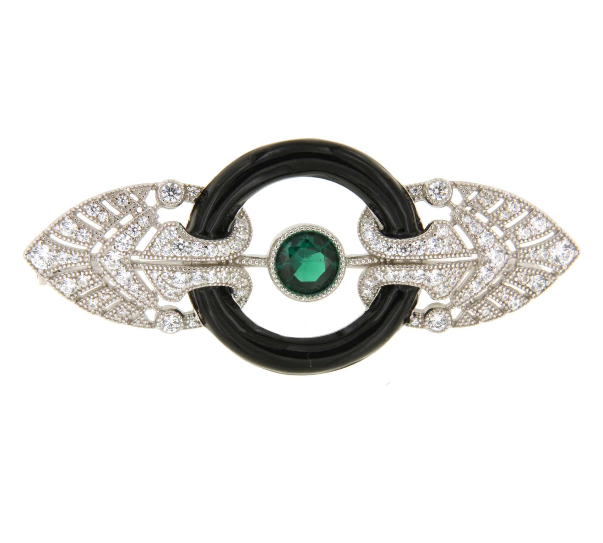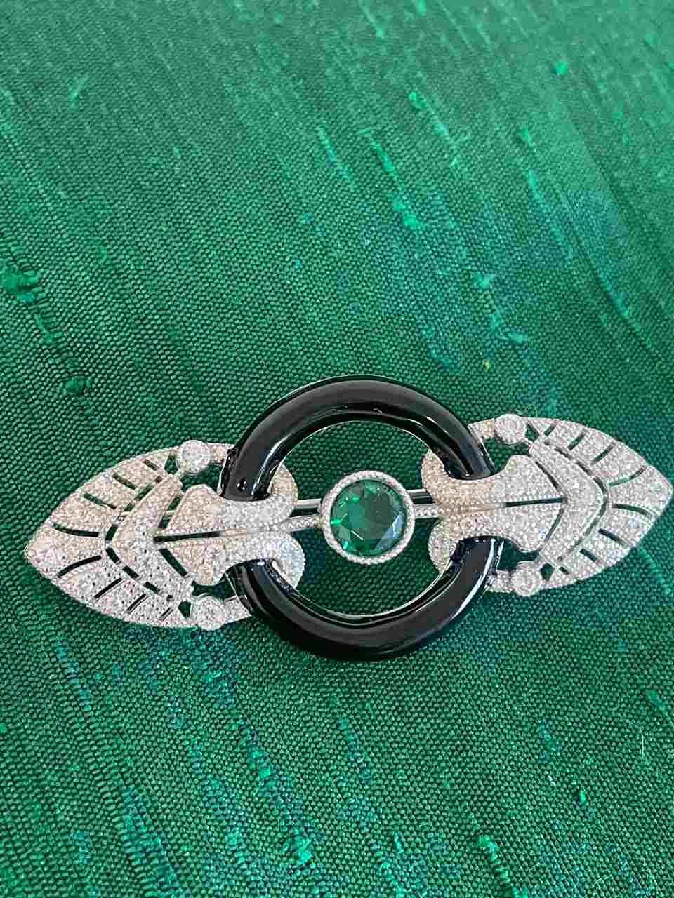 POSEIDON , a beautiful 925 sterling silver brooch in the art deco style with cubic zirconia and details in synthetic emerald -colored stones, surrounded by a piece of enamel imitating onyx.