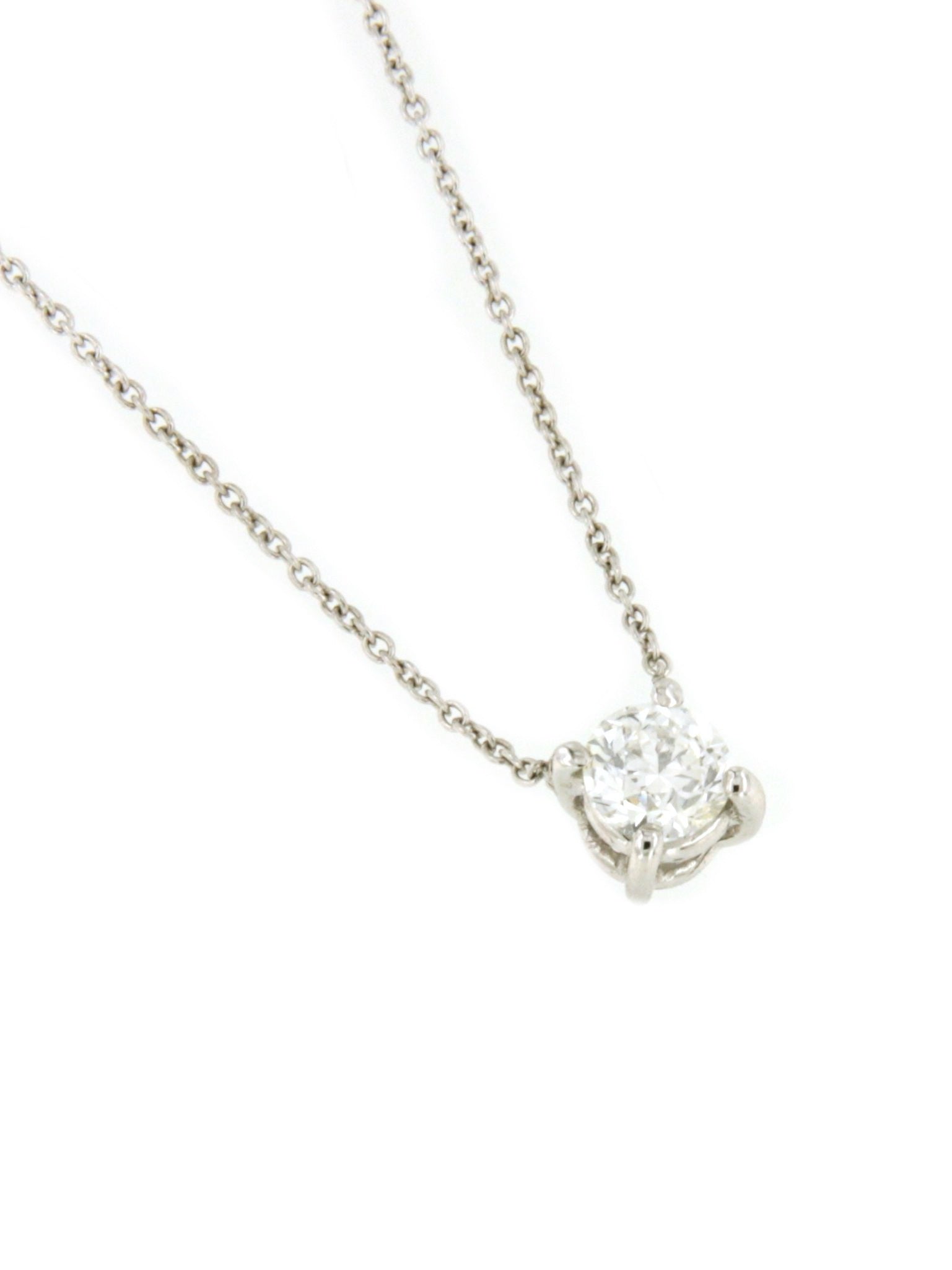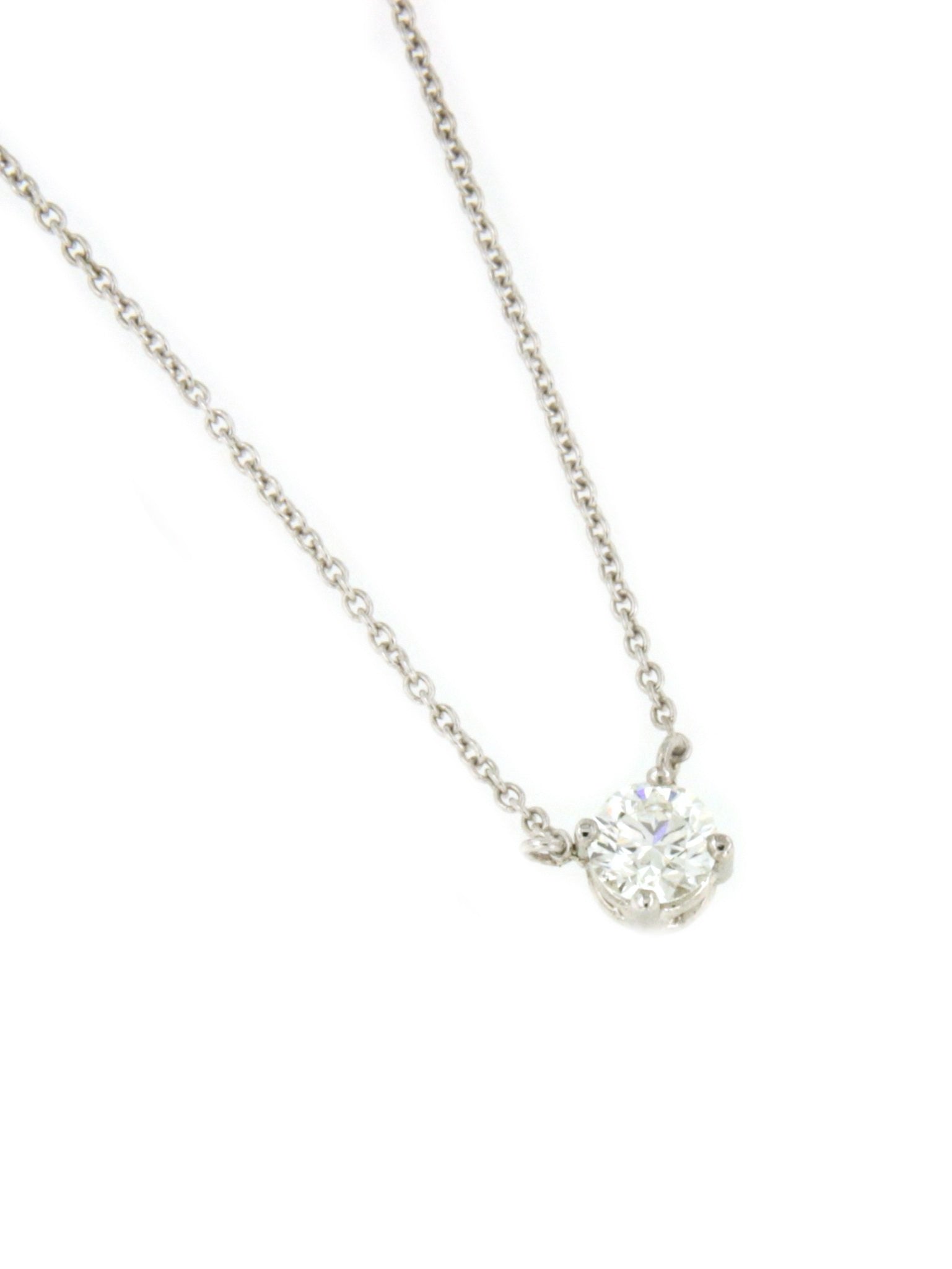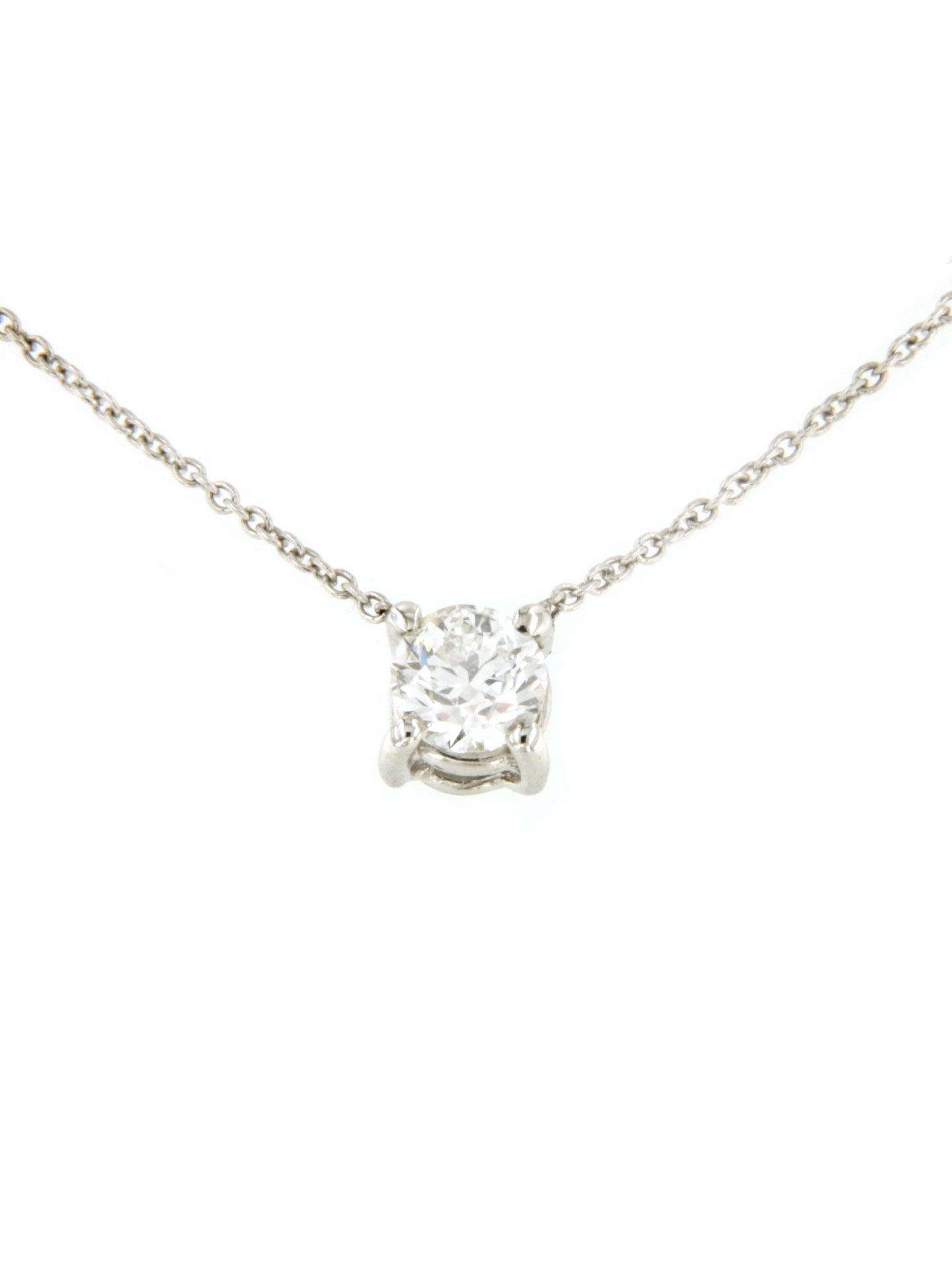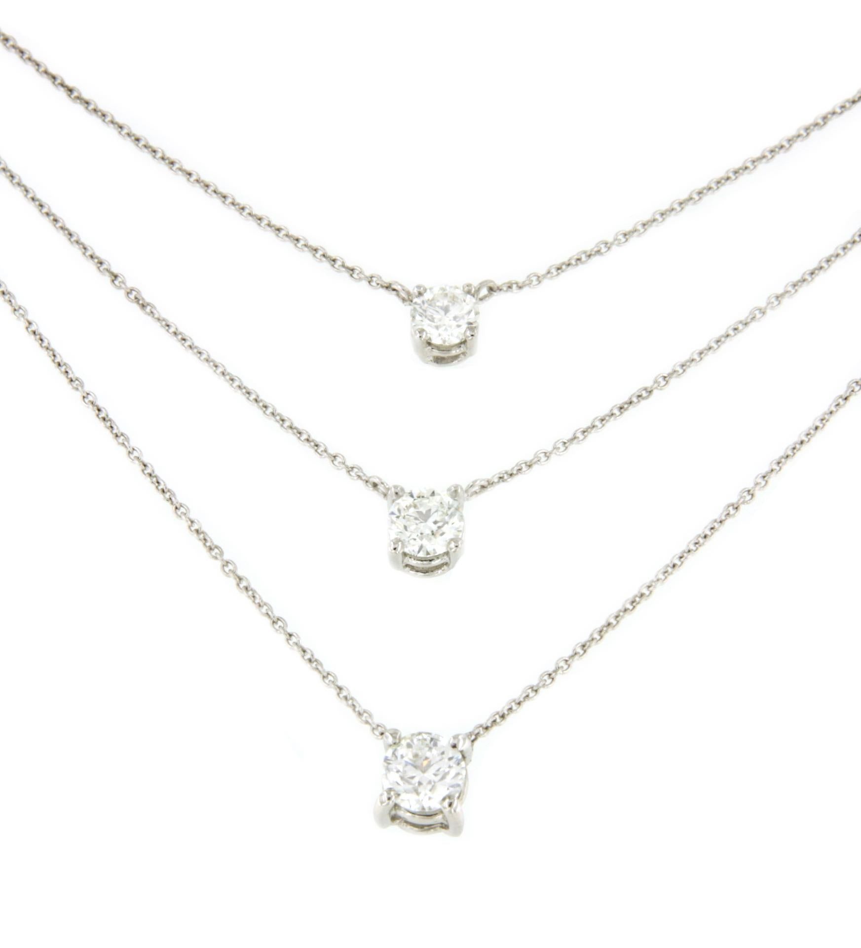 The chain measures 42 cm, adjustable to 40 cm (0.30 and 0.40 carats) and a fixed 42 cm (0.50 carats). The diamond centers measure 4.15, 4.65, and 5.25 mm (0.30, 0.40, and 0.50 carats) in diameter and are finished with a classic savonette clasp.
