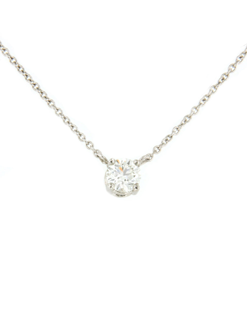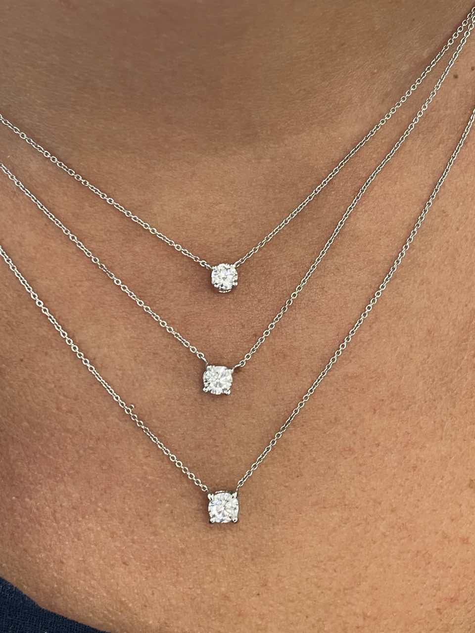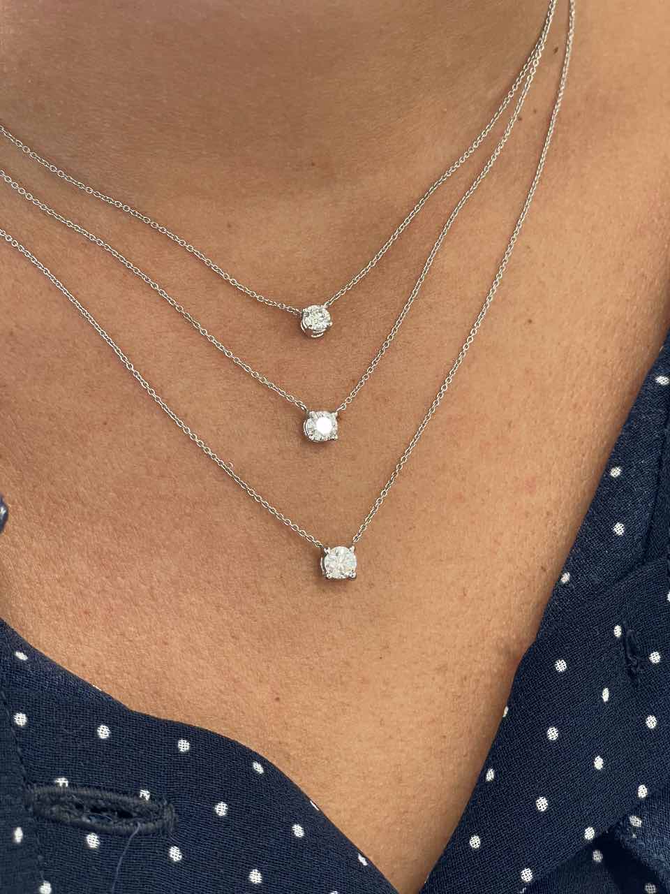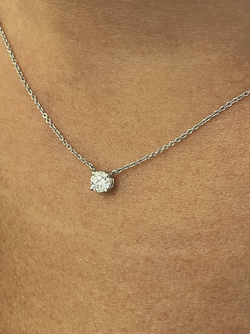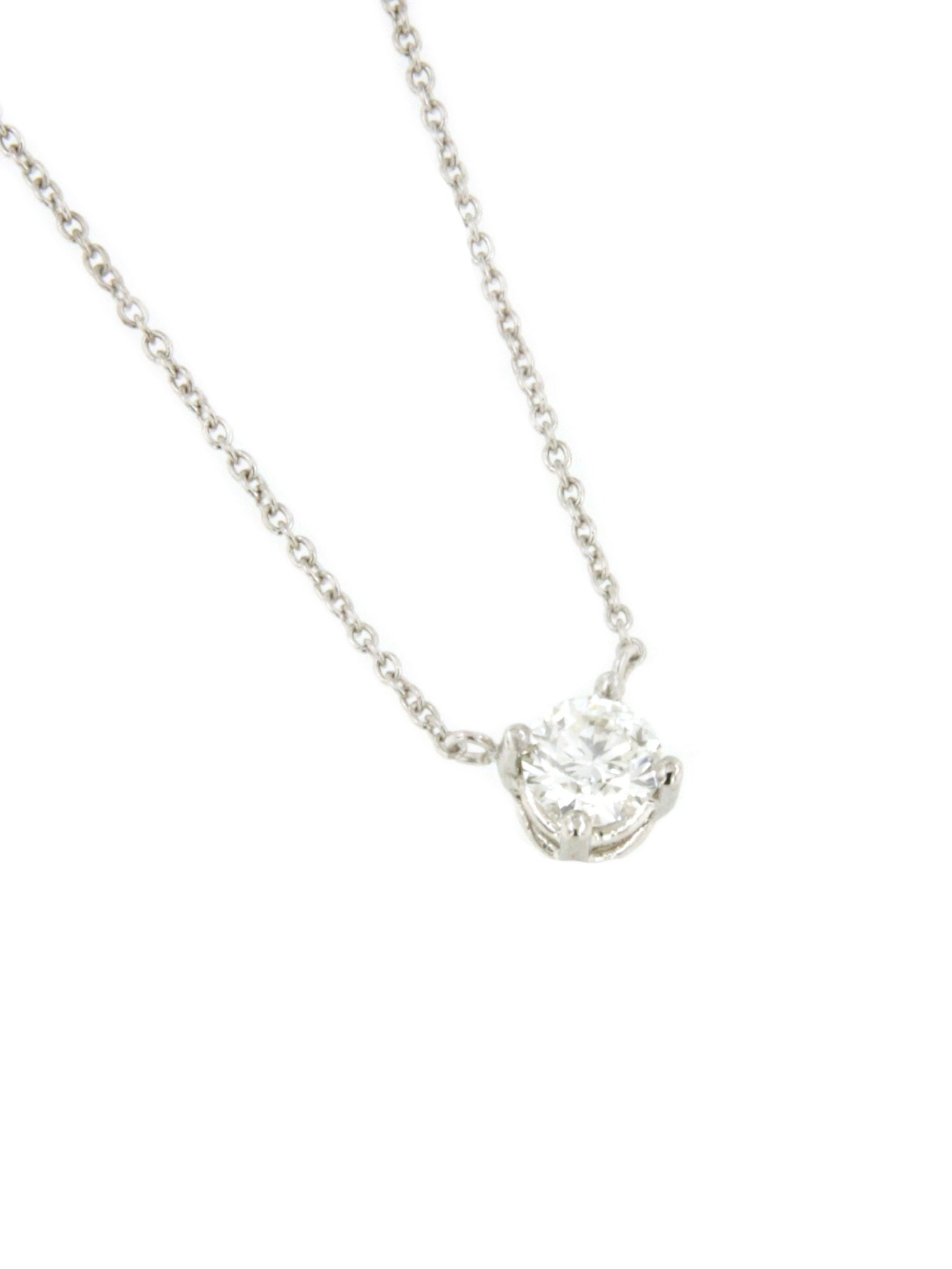The chain measures 42 cm, adjustable to 40 cm (0.30 and 0.40 carats) and a fixed 42 cm (0.50 carats). The diamond centers measure 4.15, 4.65, and 5.25 mm (0.30, 0.40, and 0.50 carats) in diameter and are finished with a classic savonette clasp.