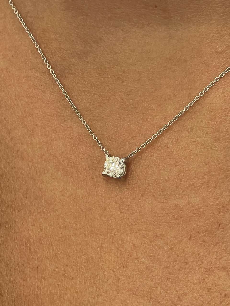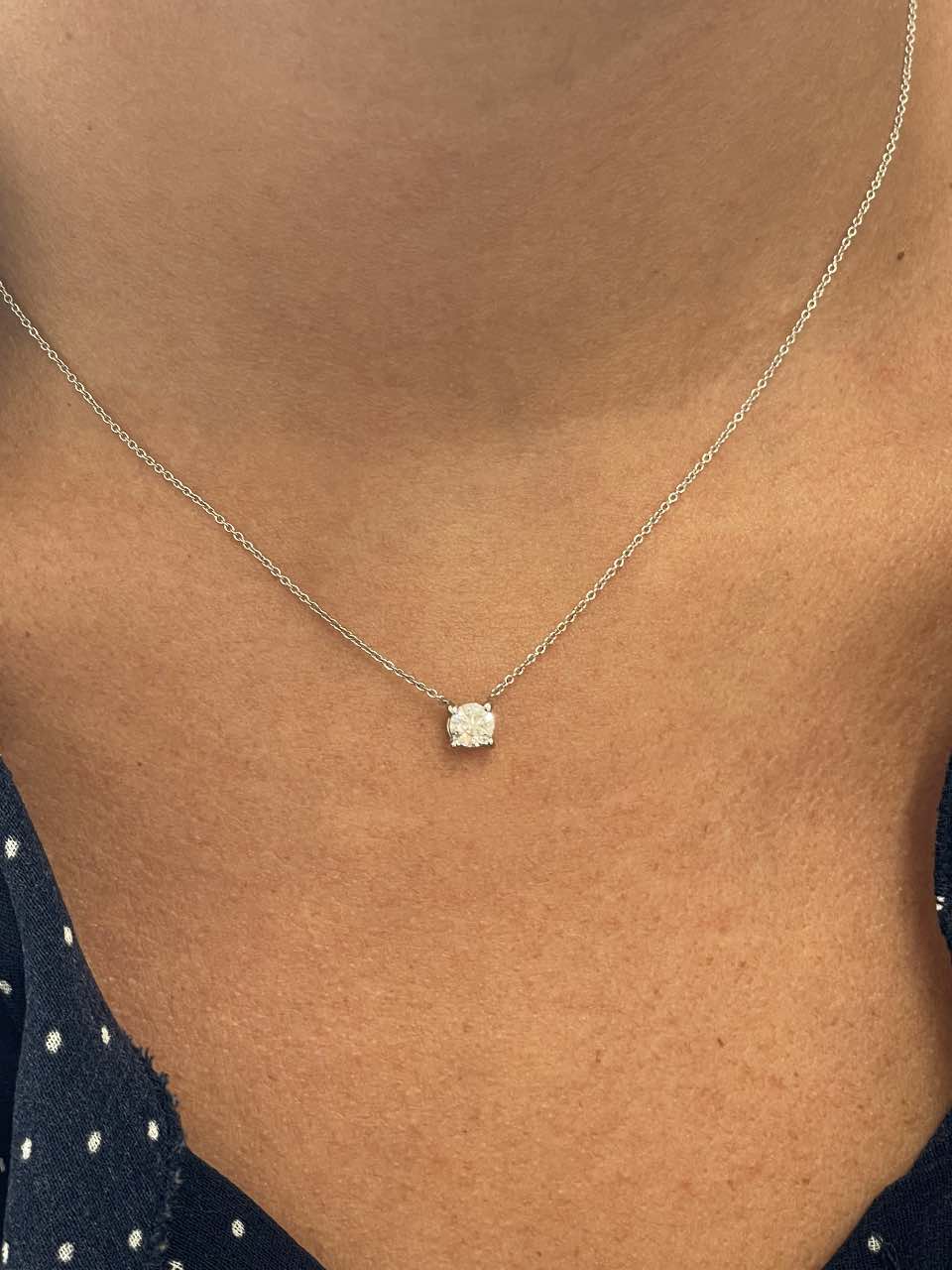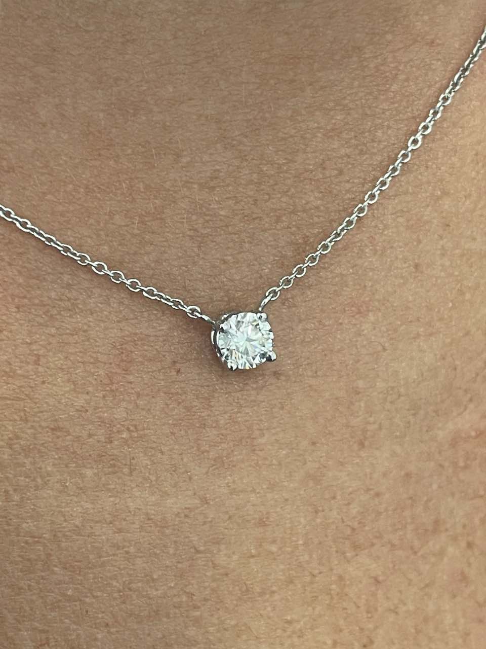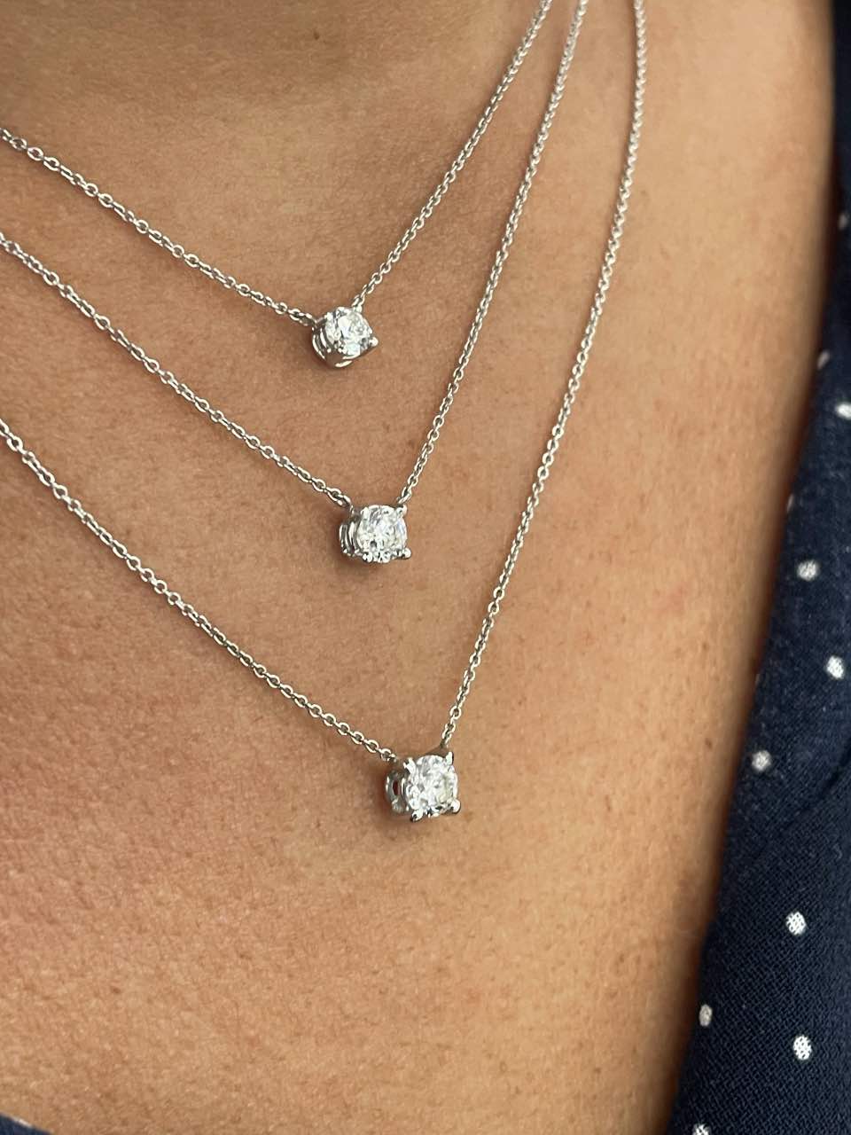 The chain measures 42 cm, adjustable to 40 cm (0.30 and 0.40 carats) and a fixed 42 cm (0.50 carats). The diamond centers measure 4.15, 4.65, and 5.25 mm (0.30, 0.40, and 0.50 carats) in diameter and are finished with a classic savonette clasp.