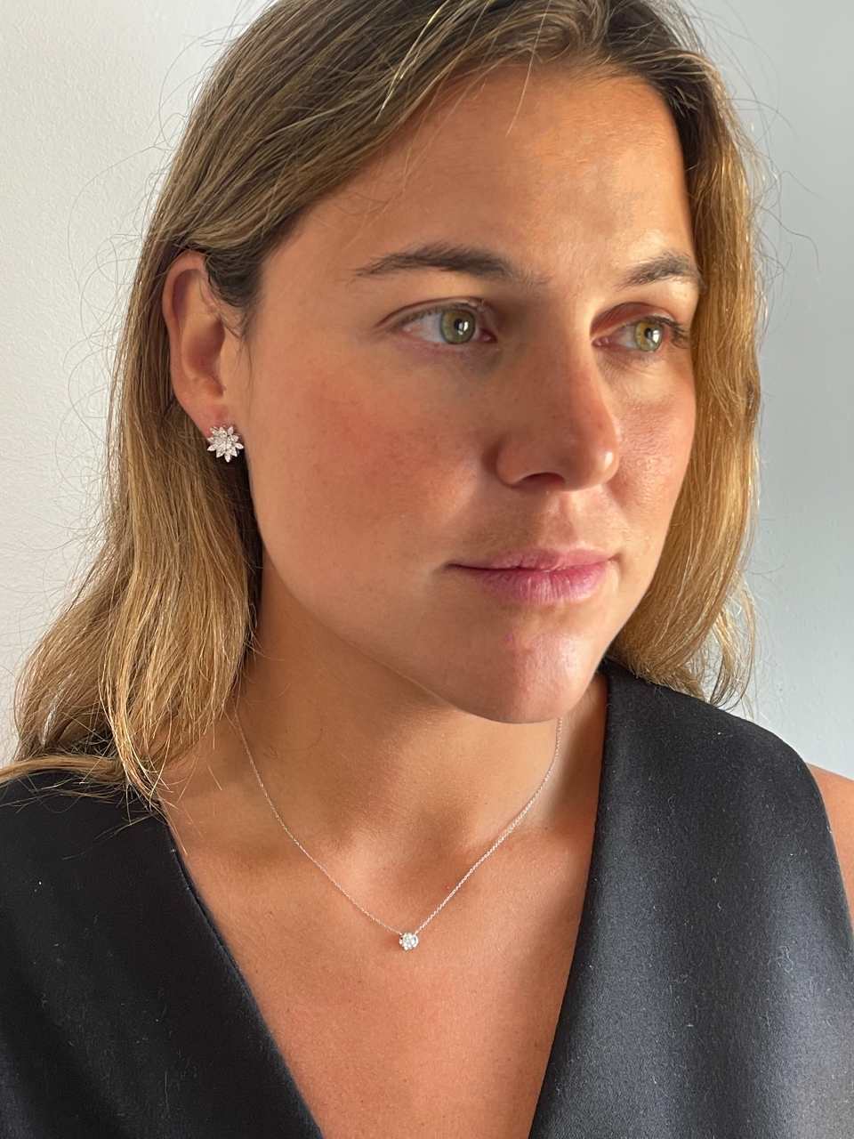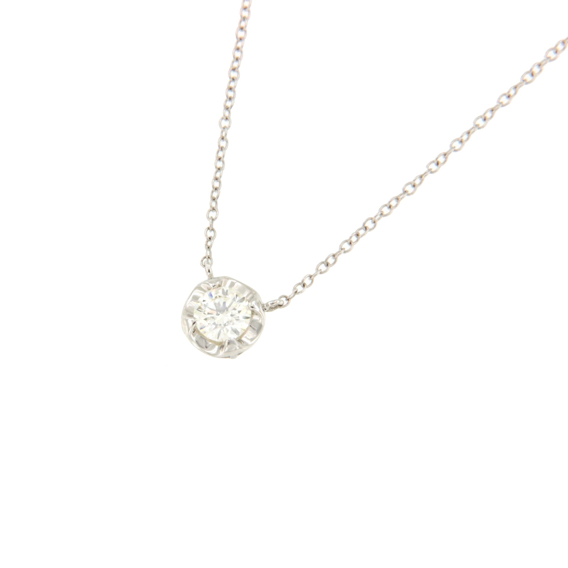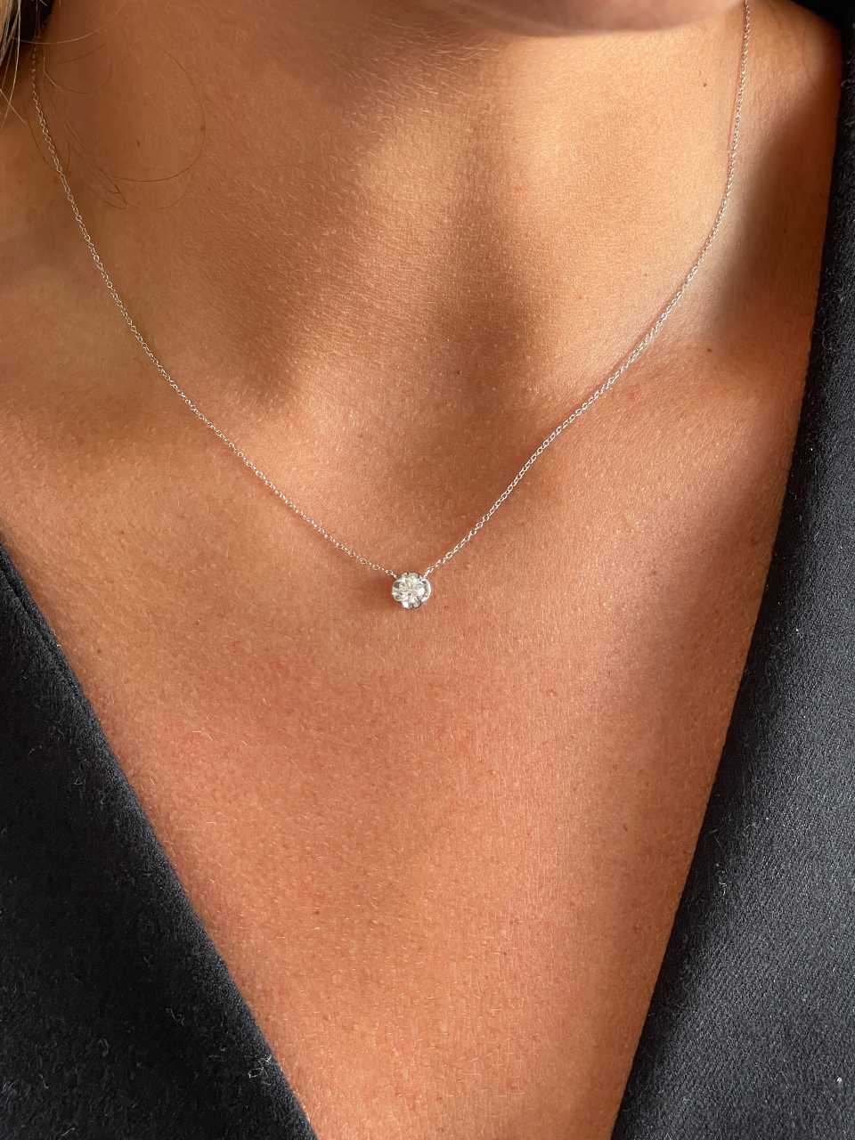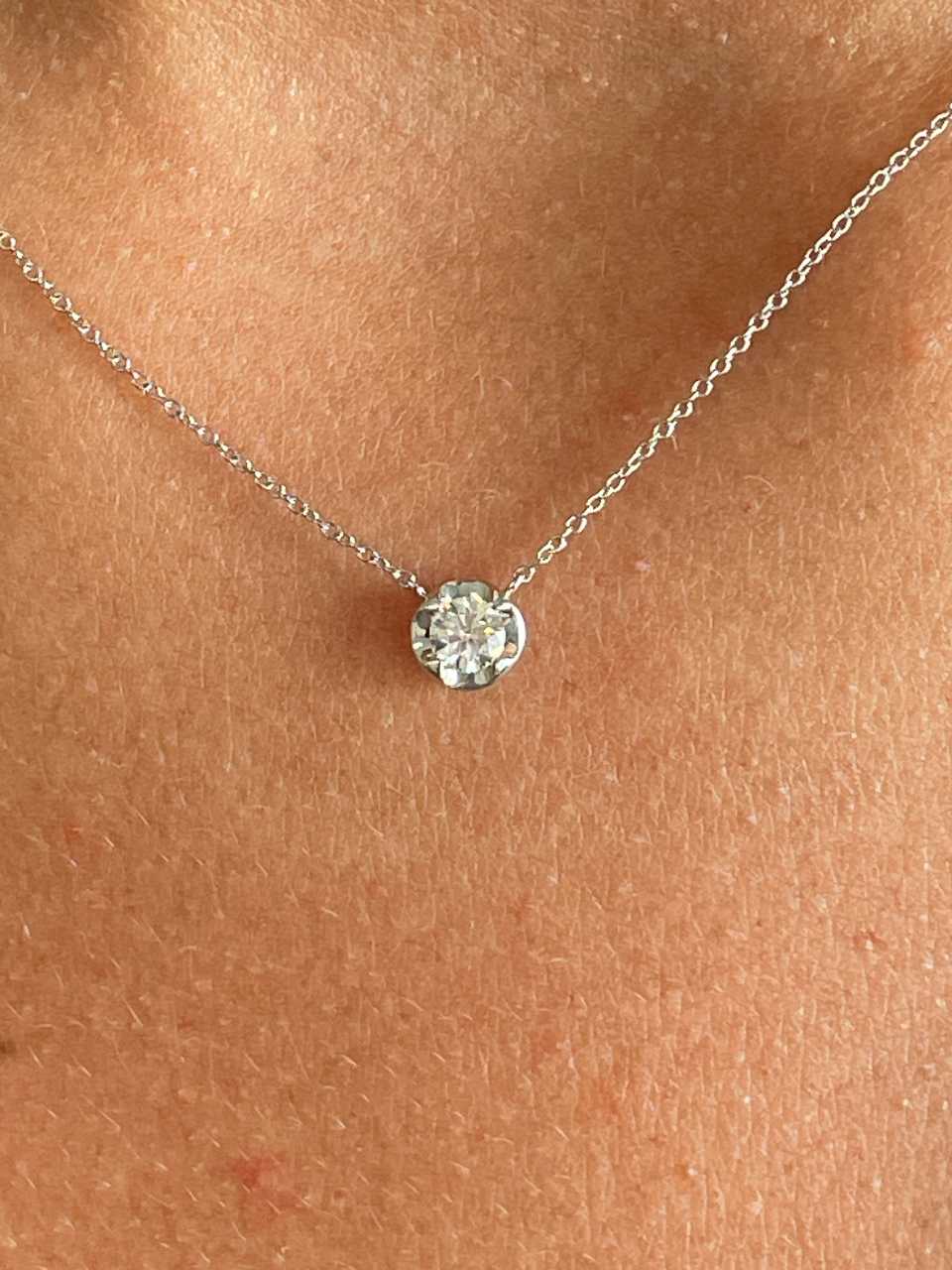 Rowan , a single diamond pendant set in four prongs, surrounded by an illusion setting that enhances its beauty. Crafted in 18-karat white gold . Perfect for everyday wear!