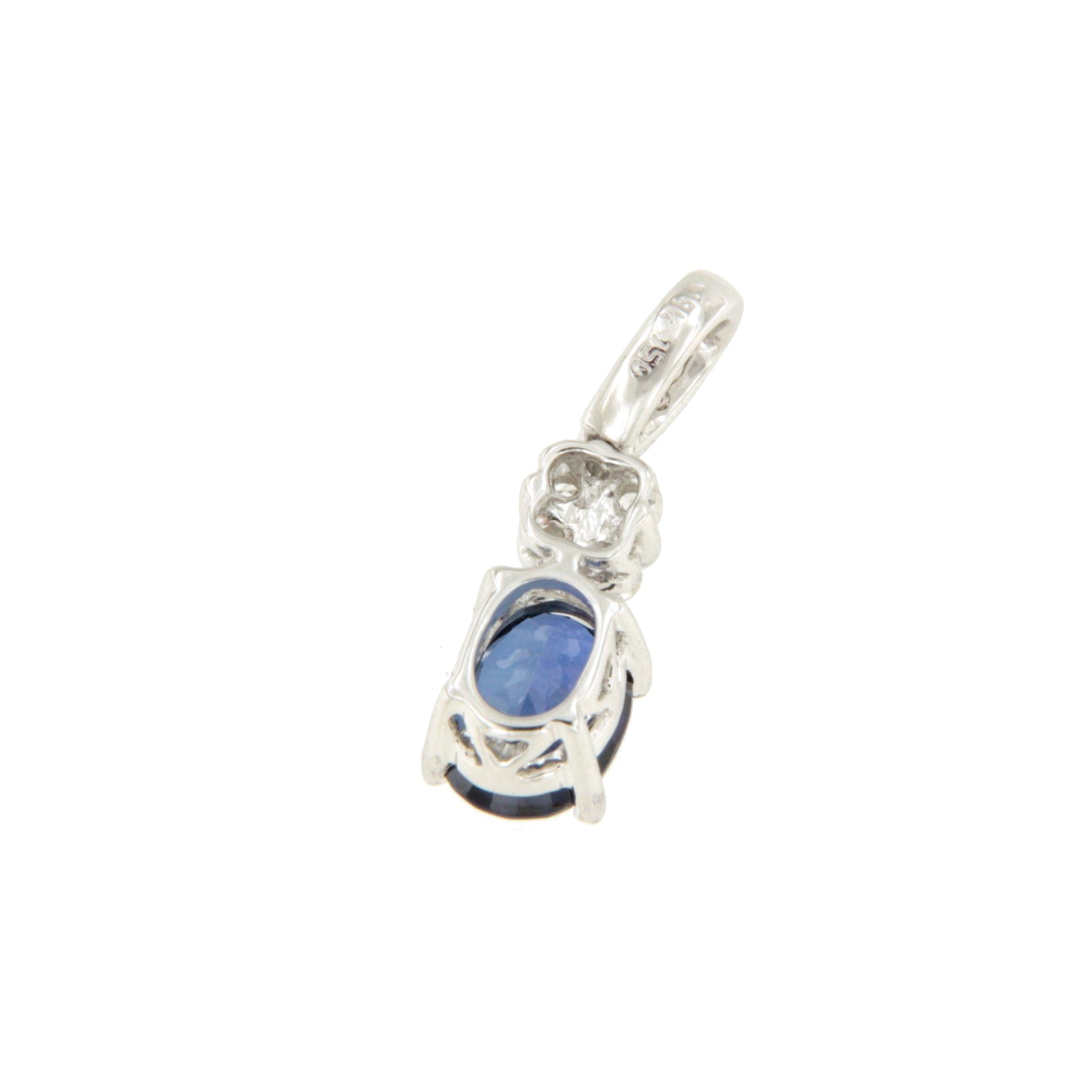 BUDONI is a pendant made of 18k white gold . The pendant features a central oval sapphire hanging from a bail with a diamond center. Chain not included in the price.