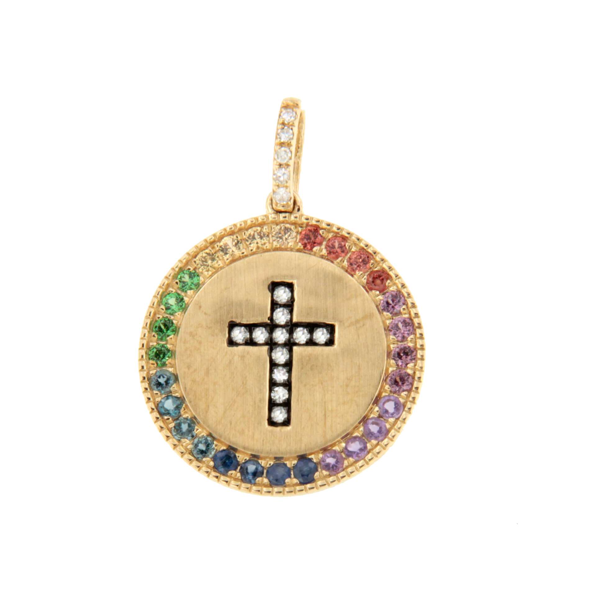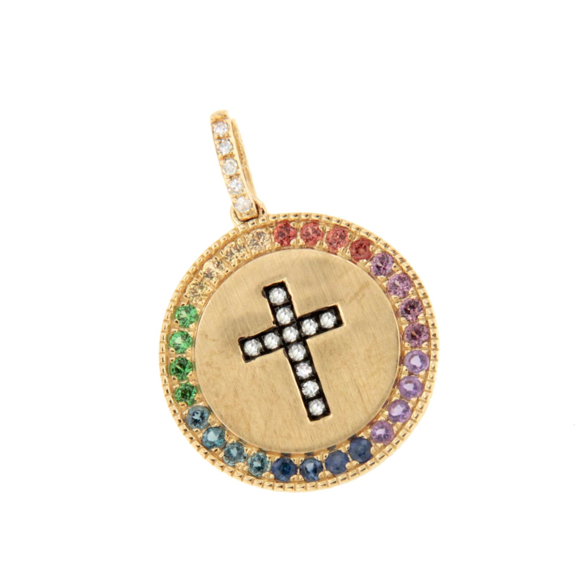 MIRELA is a 14-karat yellow gold medal with a central diamond cross and a border of sapphires and colored gemstones. Ideal as a gift for a First Communion or christening.