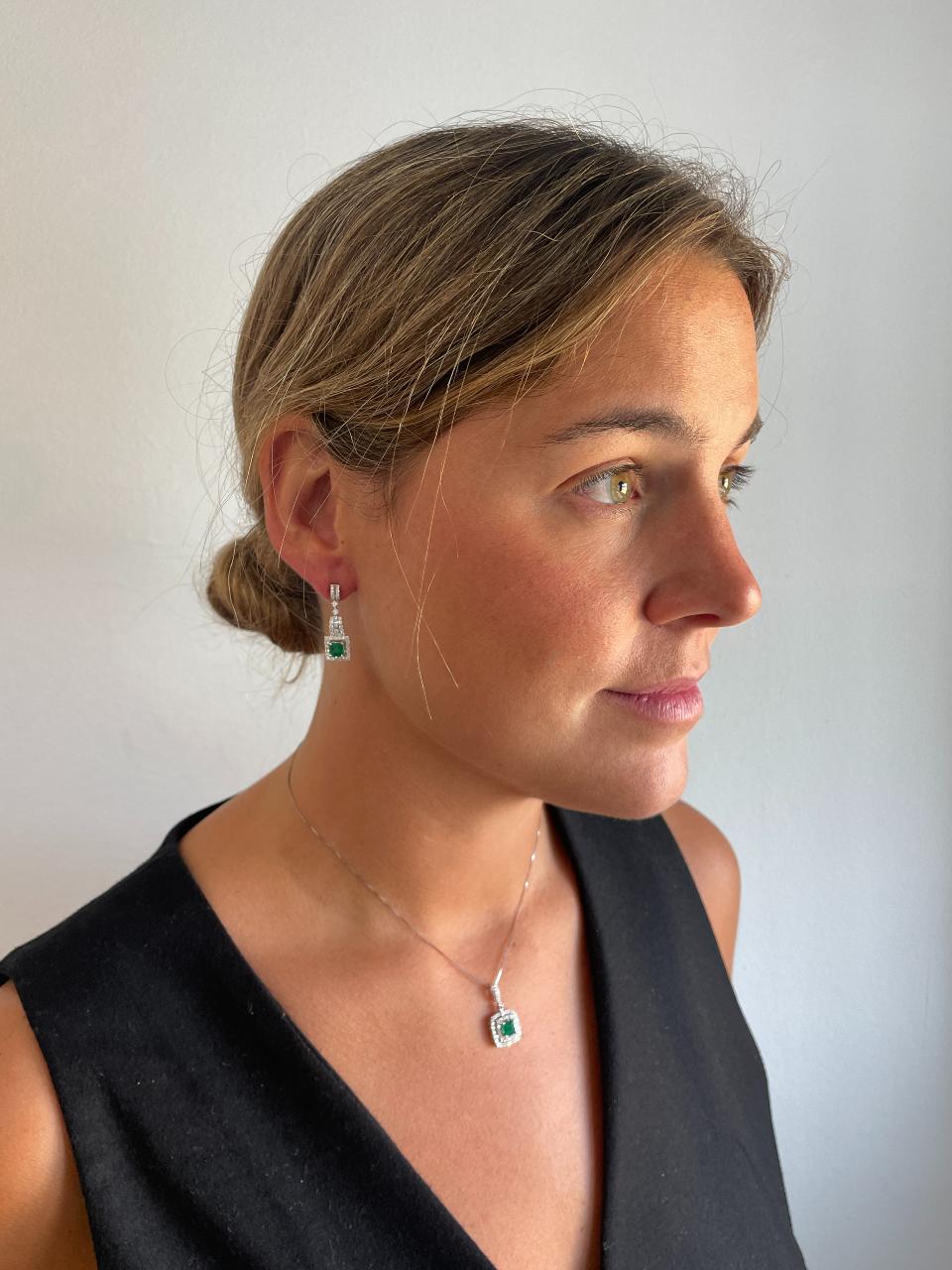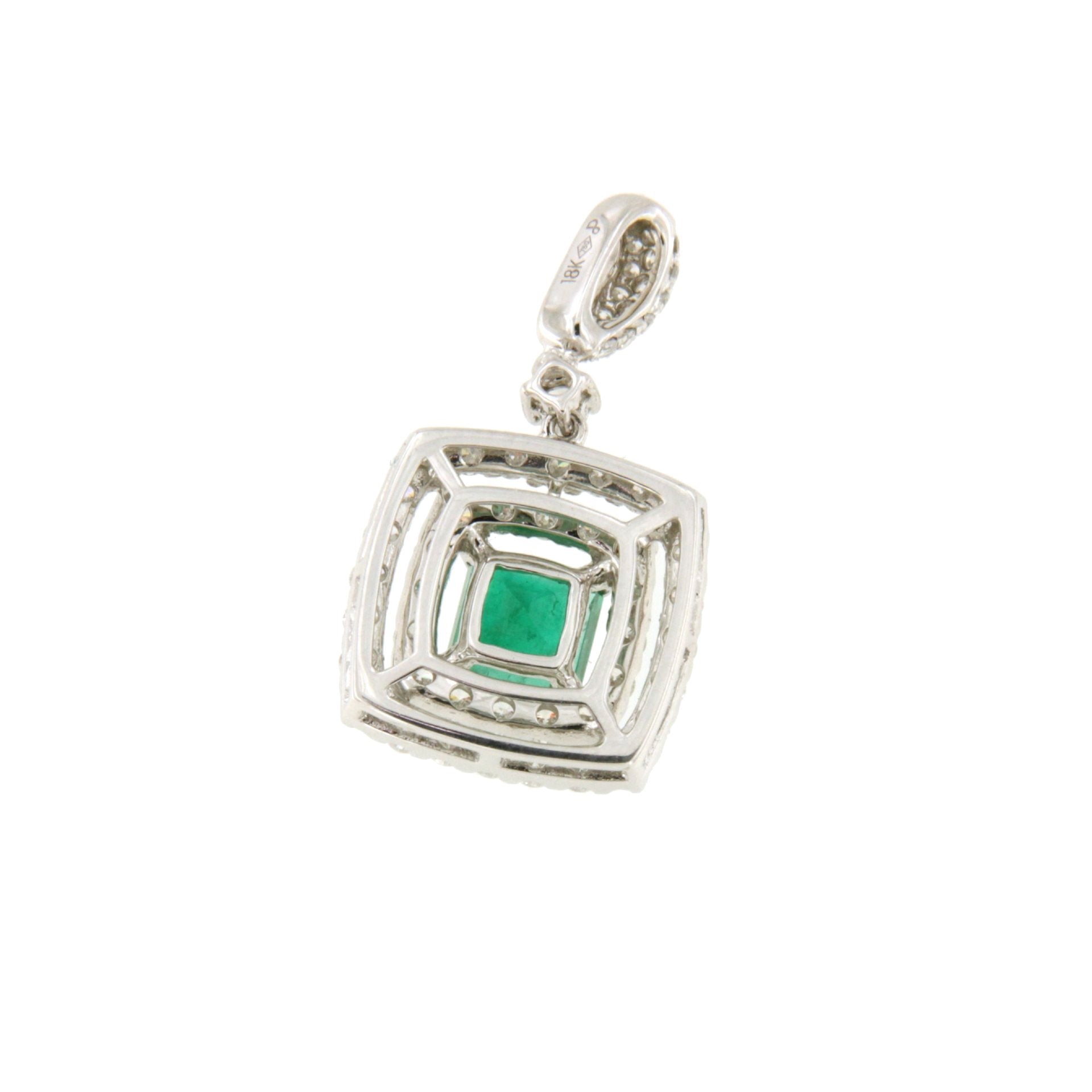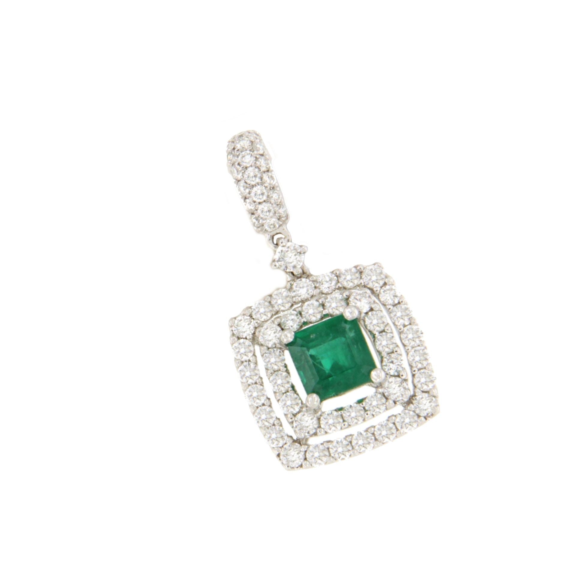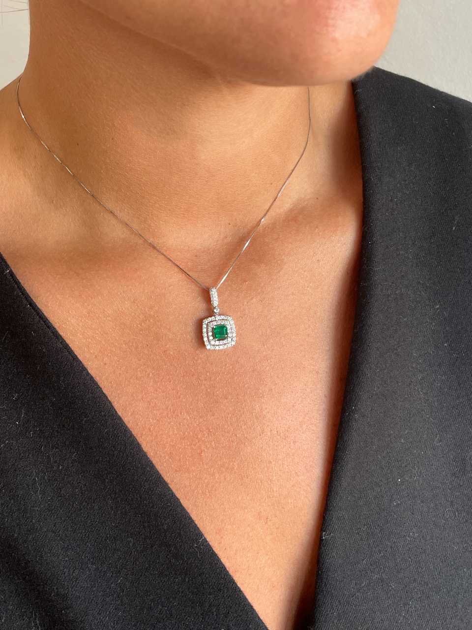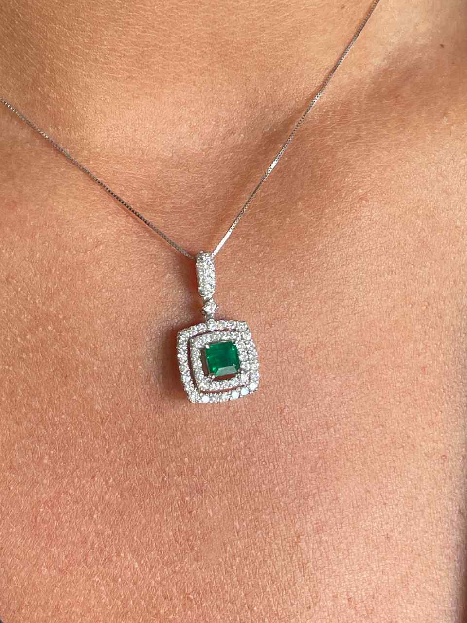 TOMATILLO is a pendant , made of 18k white gold , the The pendant features a central Colombian emerald surrounded by two halos of diamonds, with a diamond bail . Chain not included in the price.
