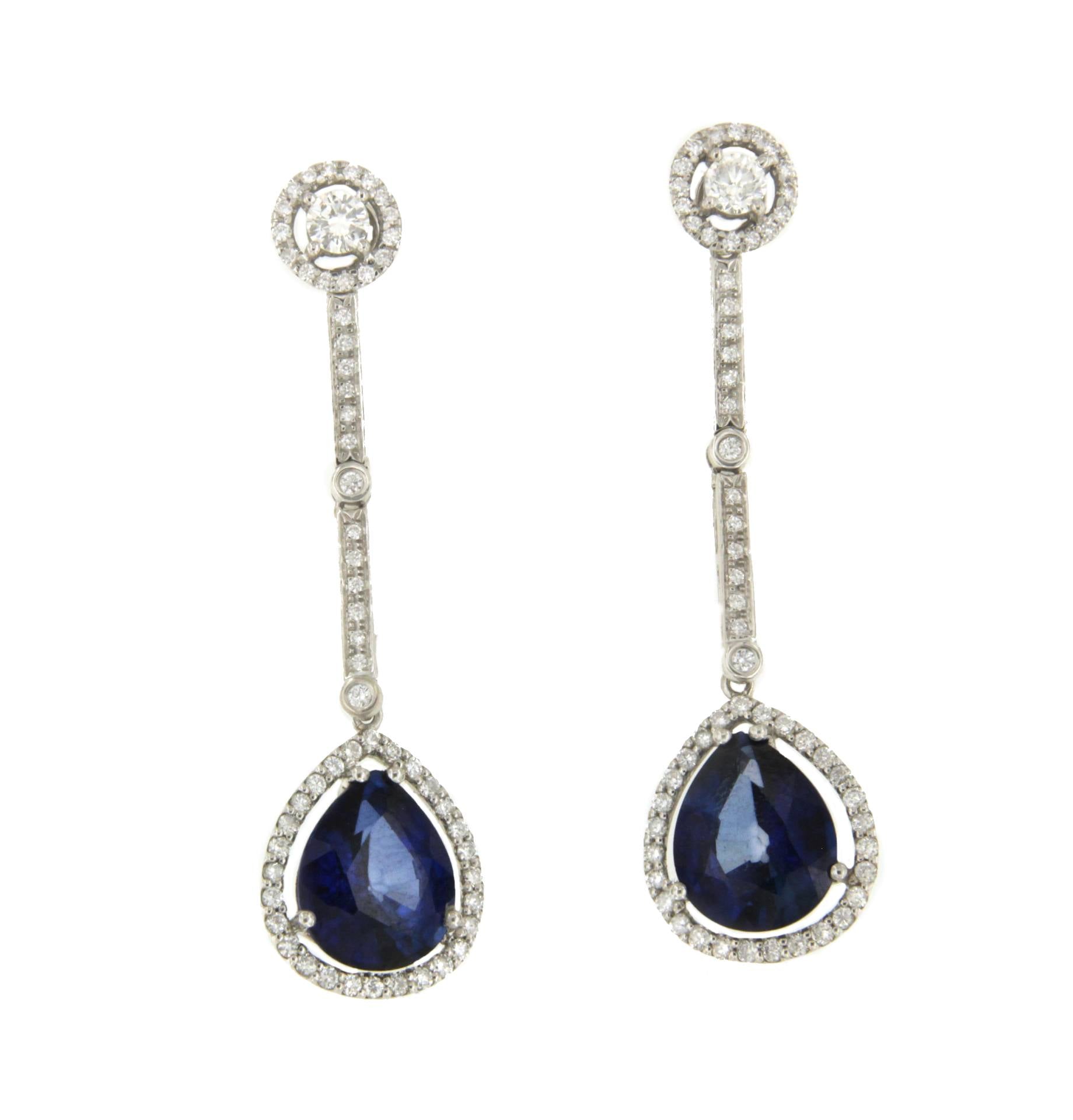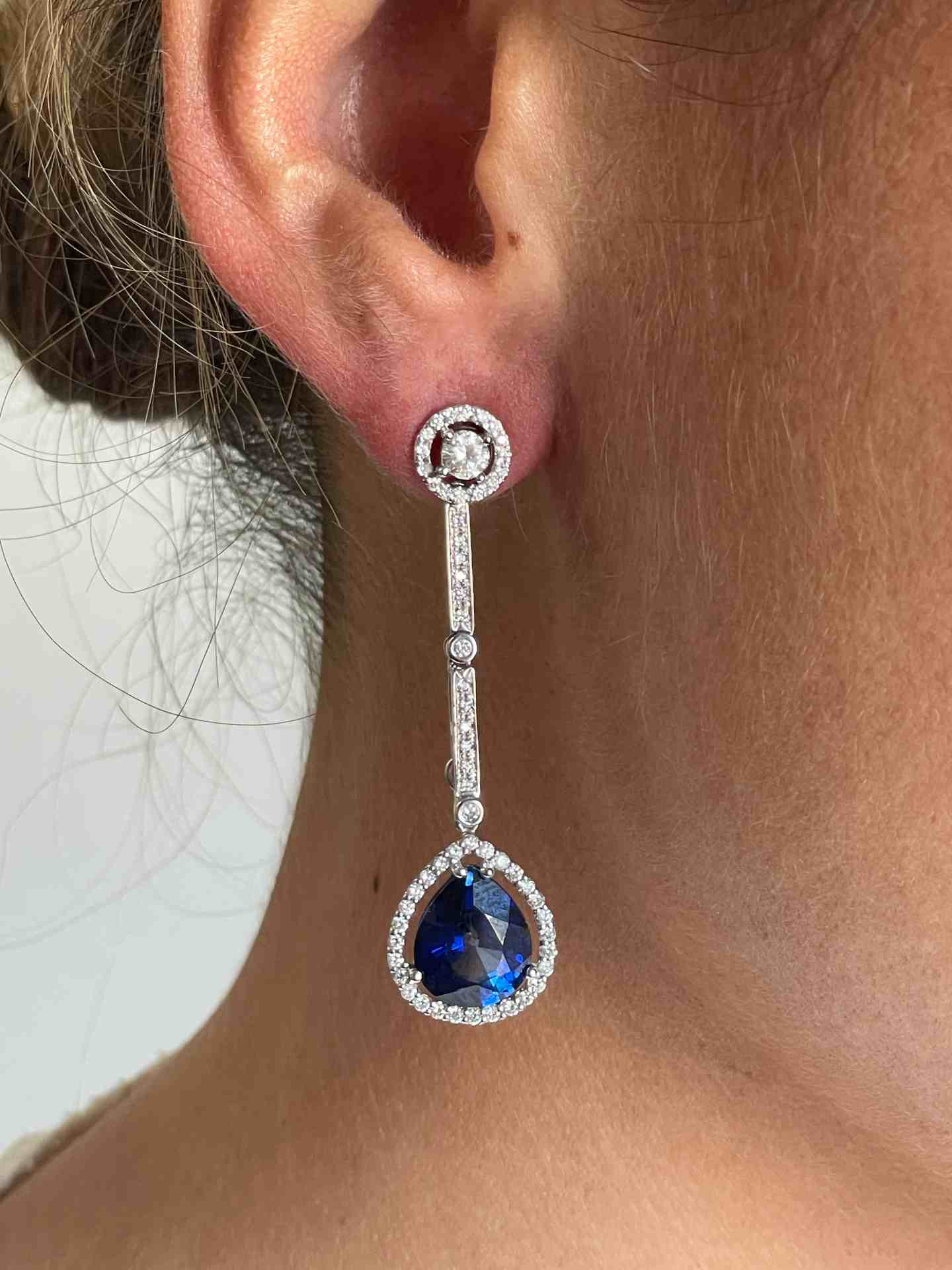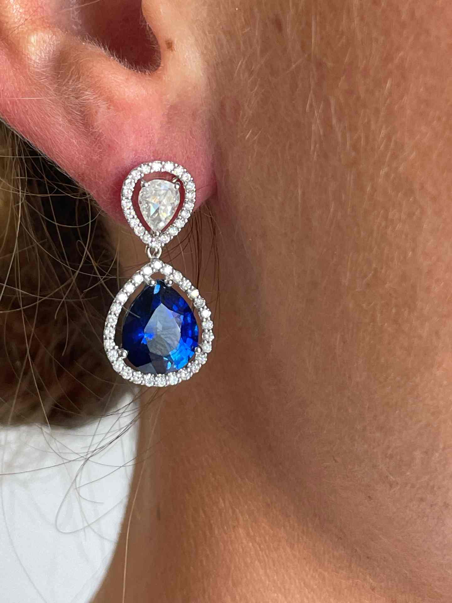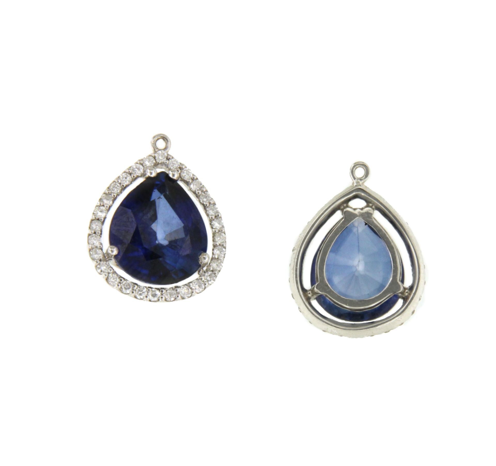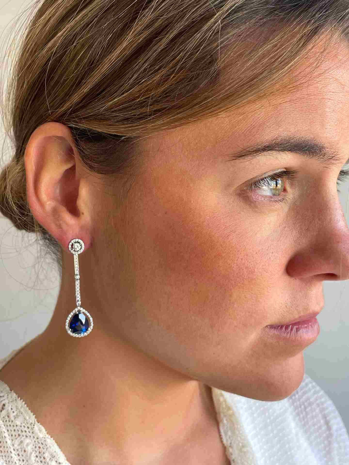 AZURE are sapphire pear- shaped studs that are perfect to pair with our detachable earrings. Crafted in 18-karat white gold , they are delicately set with a halo of diamonds.