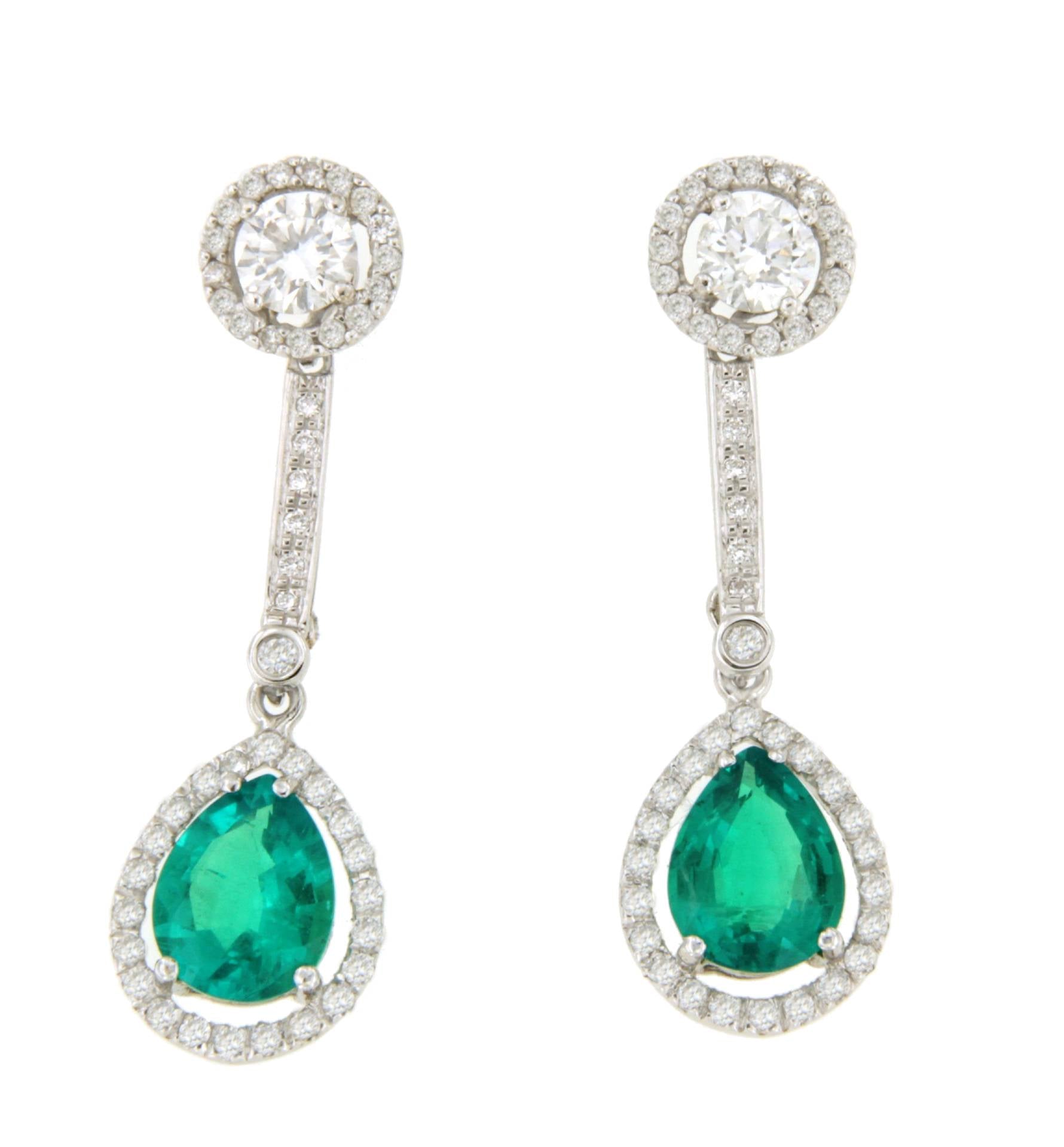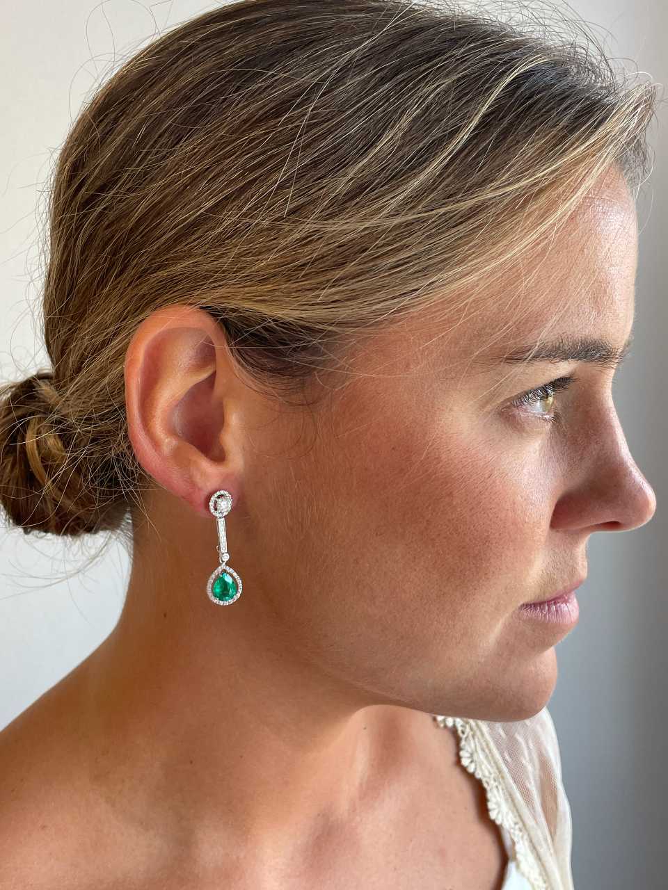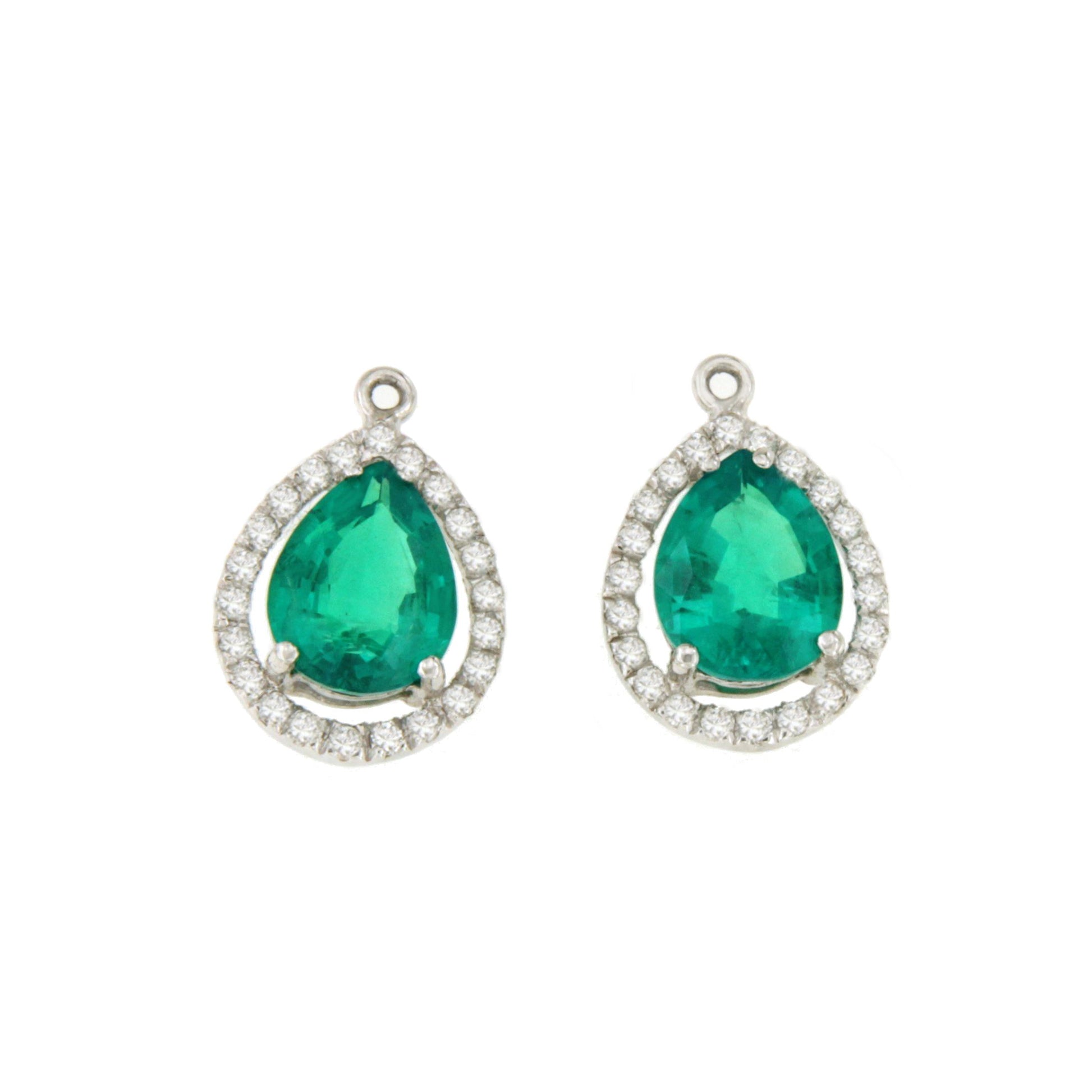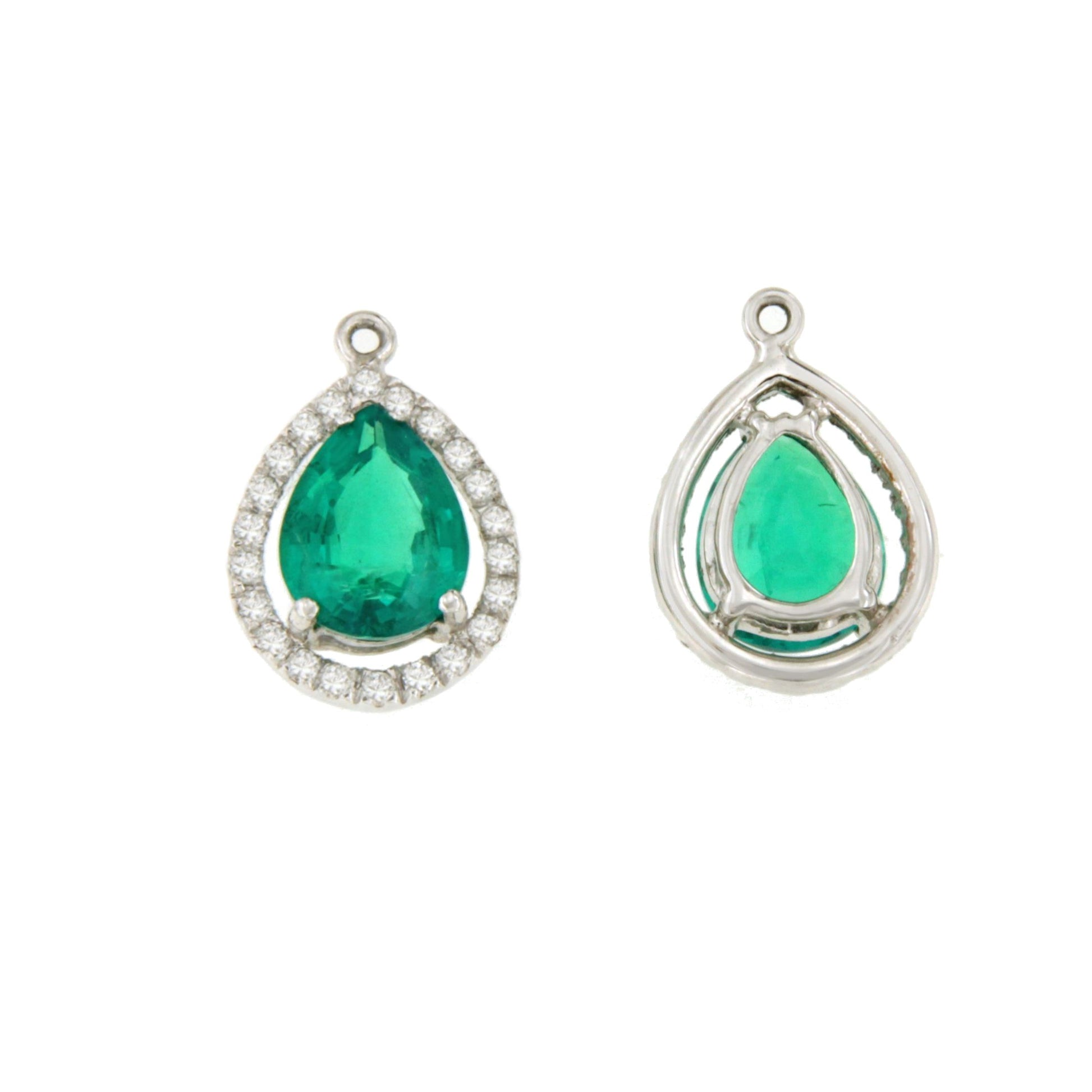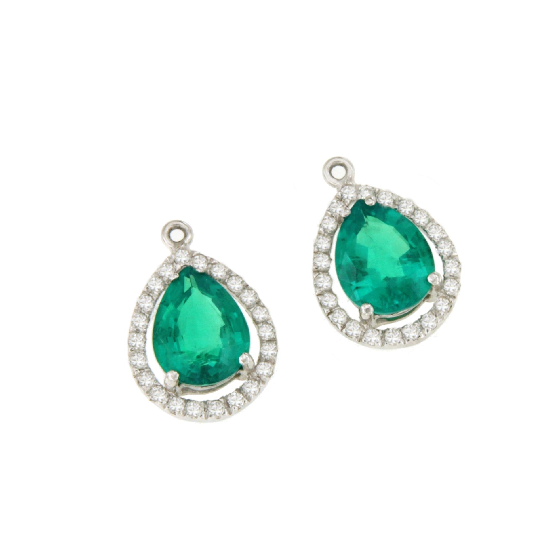 CARTAGENA pendants perfectly complement our detachable earrings. Crafted in 18-karat white gold , they feature teardrop-cut emeralds , carefully surrounded by a halo of brilliant diamonds that enhance their beauty and color.