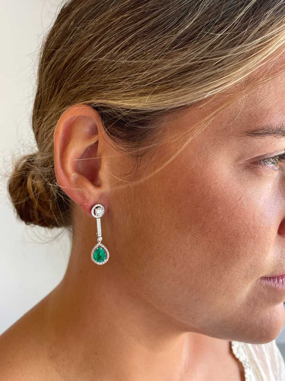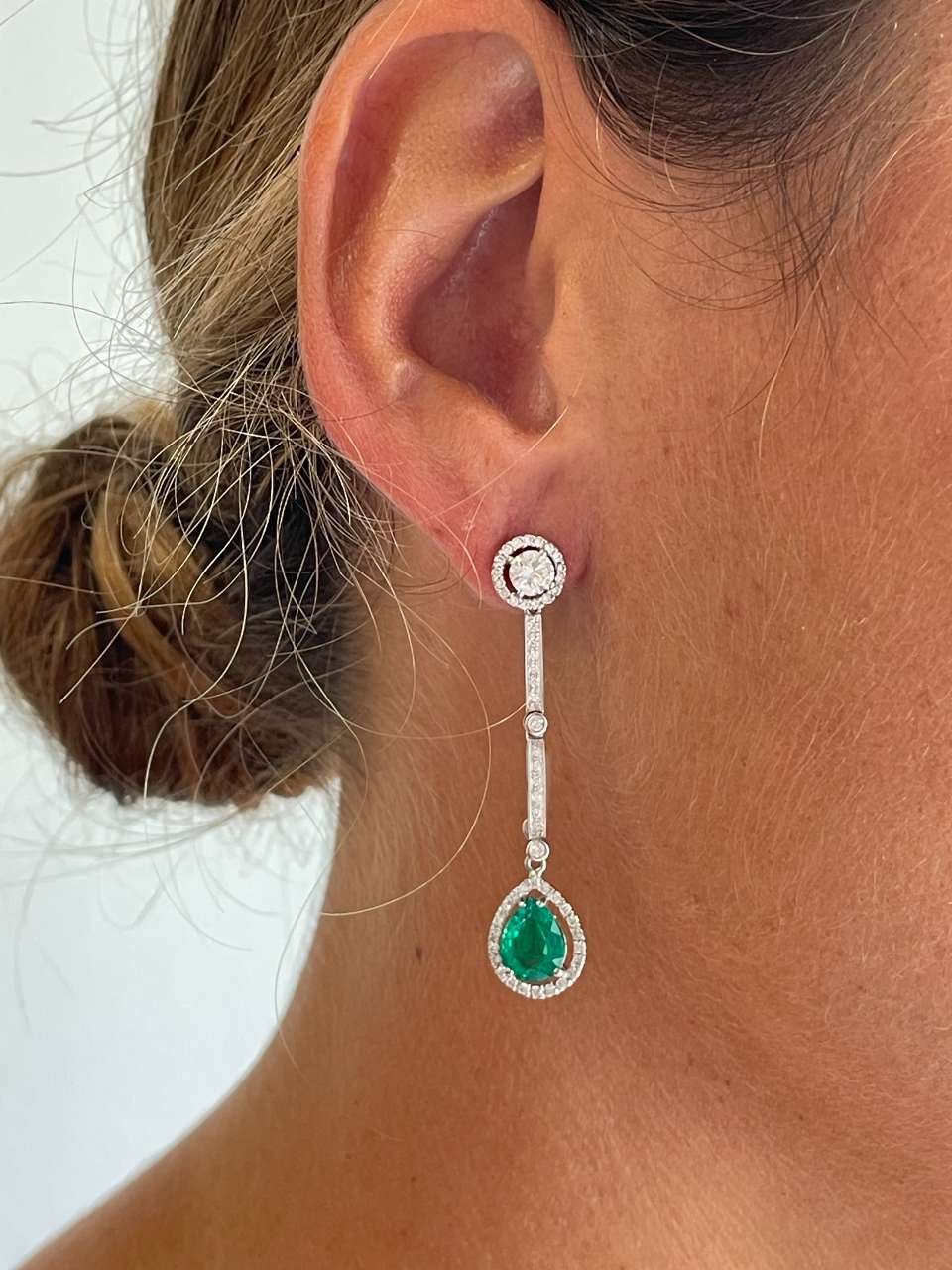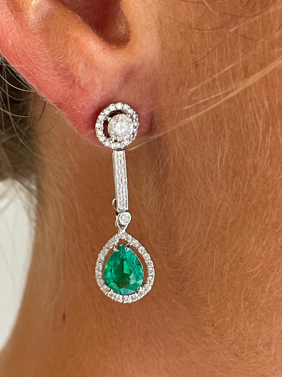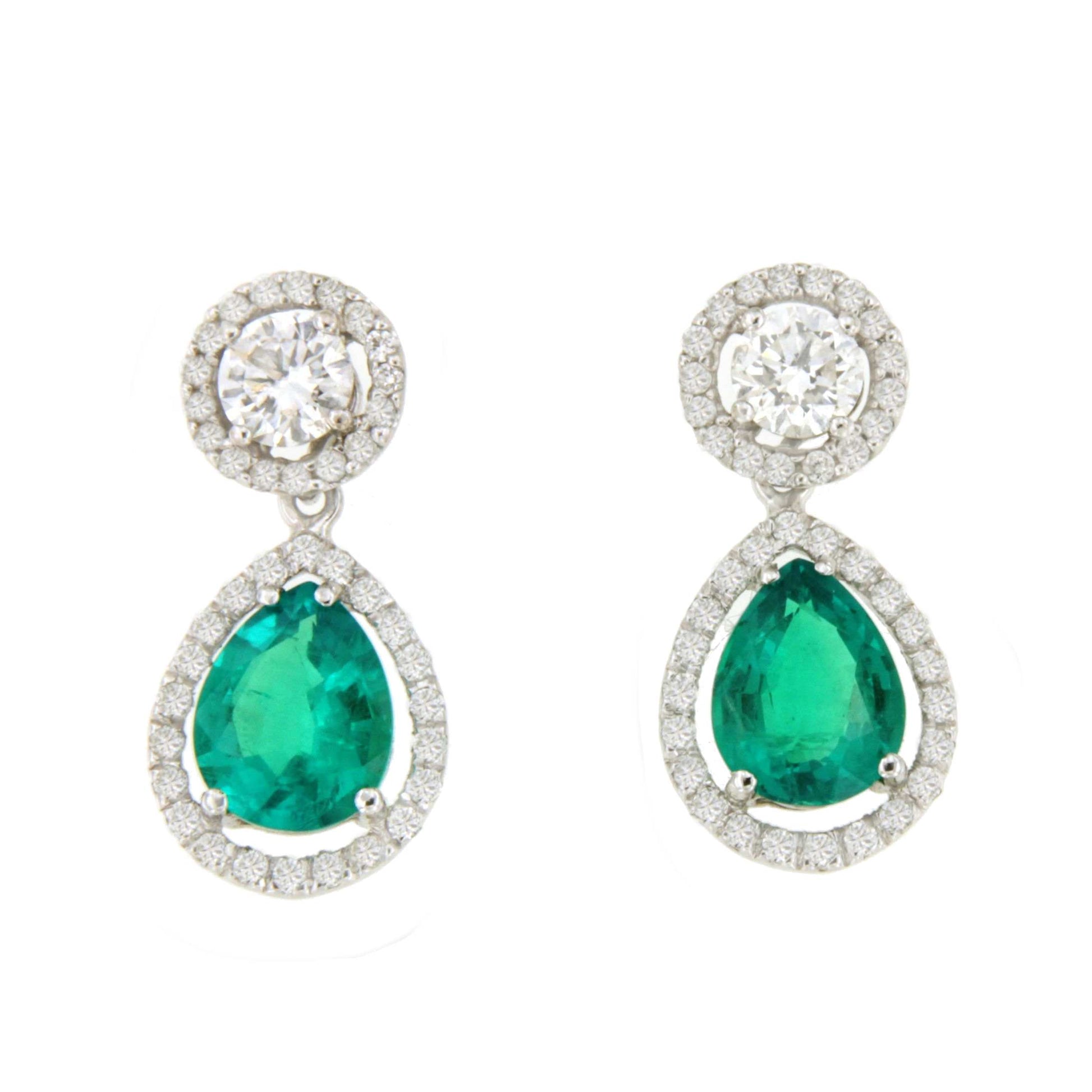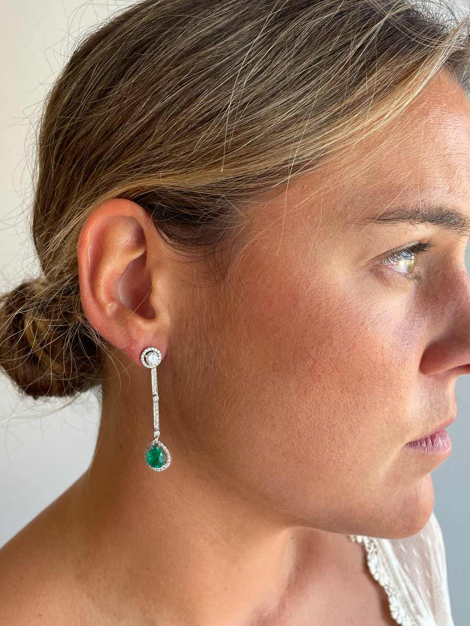 CARTAGENA pendants perfectly complement our detachable earrings. Crafted in 18-karat white gold , they feature teardrop-cut emeralds , carefully surrounded by a halo of brilliant diamonds that enhance their beauty and color.