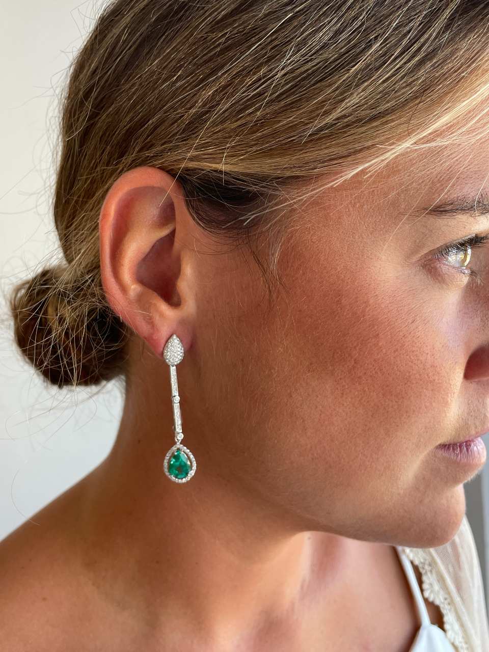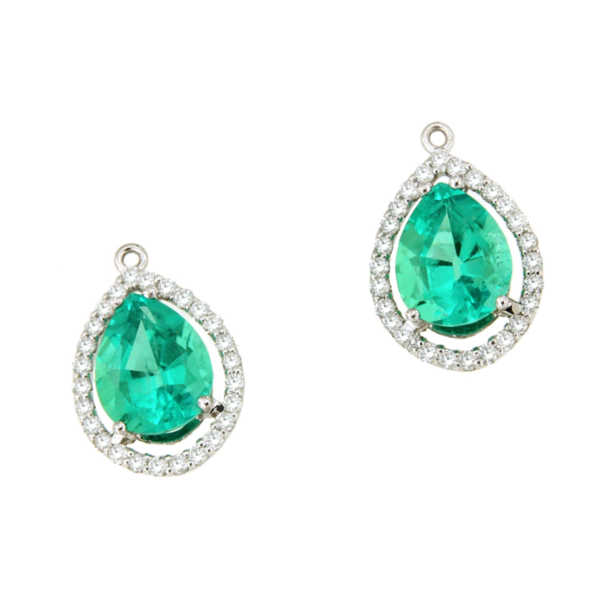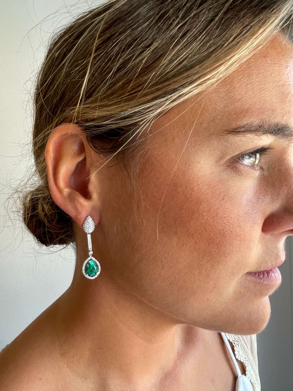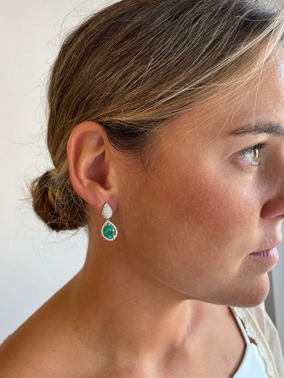 The BOGOTA pendants are a unique jewel that perfectly complements our detachable earrings. Crafted in 18-karat white gold , they feature teardrop-cut emeralds , carefully surrounded by a halo of brilliant diamonds that enhance their beauty and color.