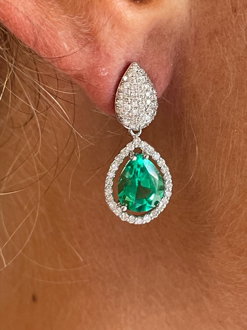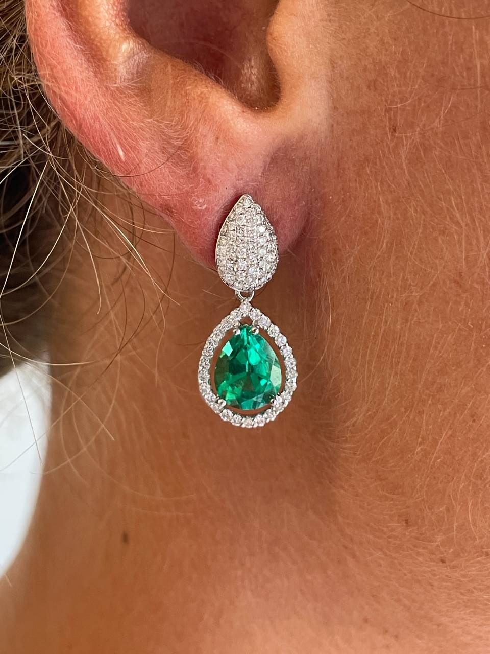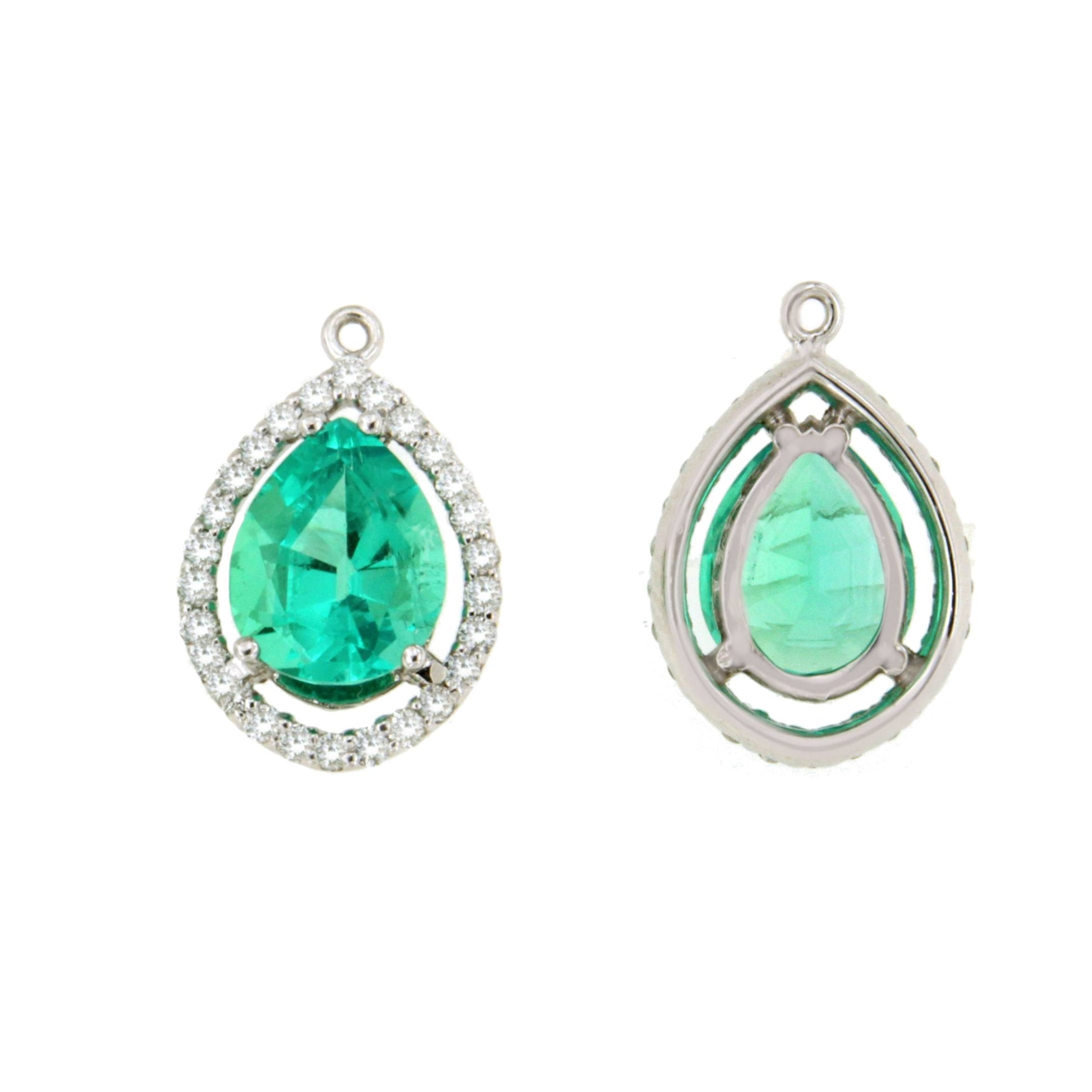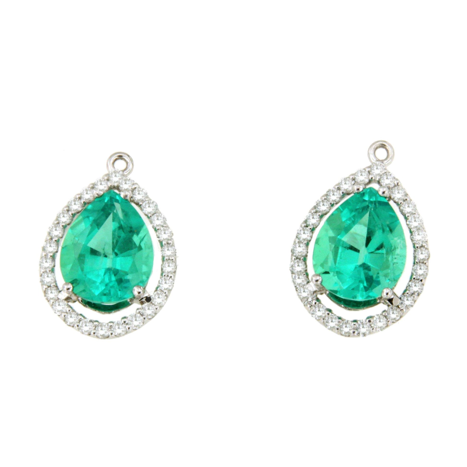 The BOGOTA pendants are a unique jewel that perfectly complements our detachable earrings. Crafted in 18-karat white gold , they feature teardrop-cut emeralds , carefully surrounded by a halo of brilliant diamonds that enhance their beauty and color.