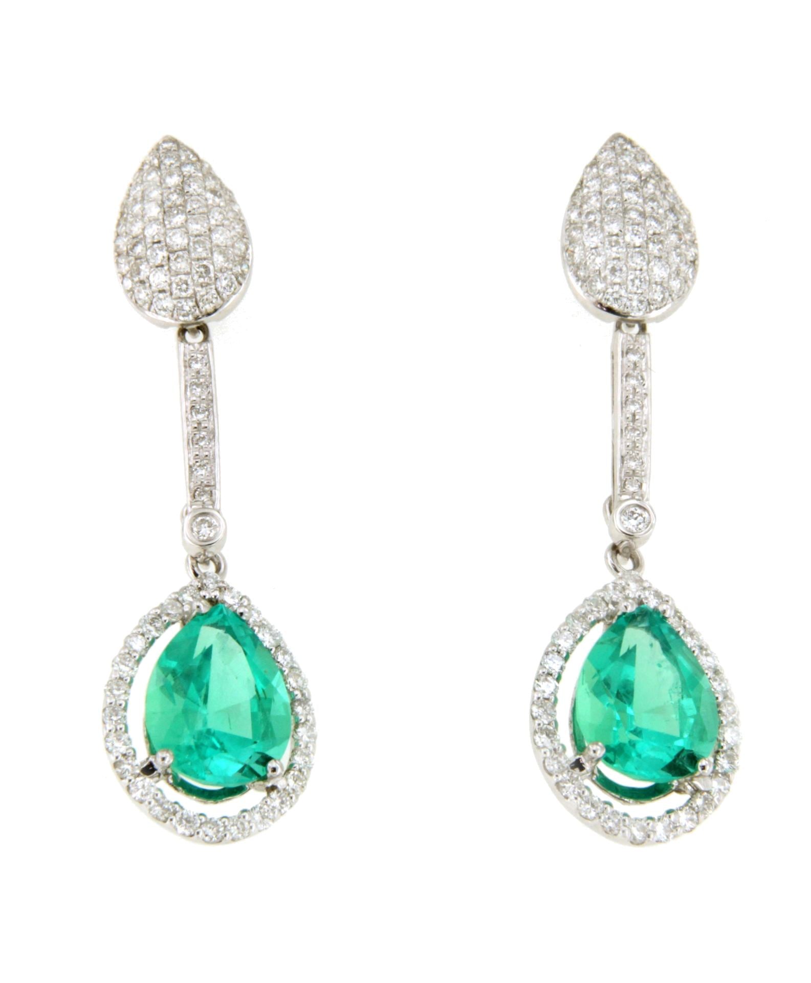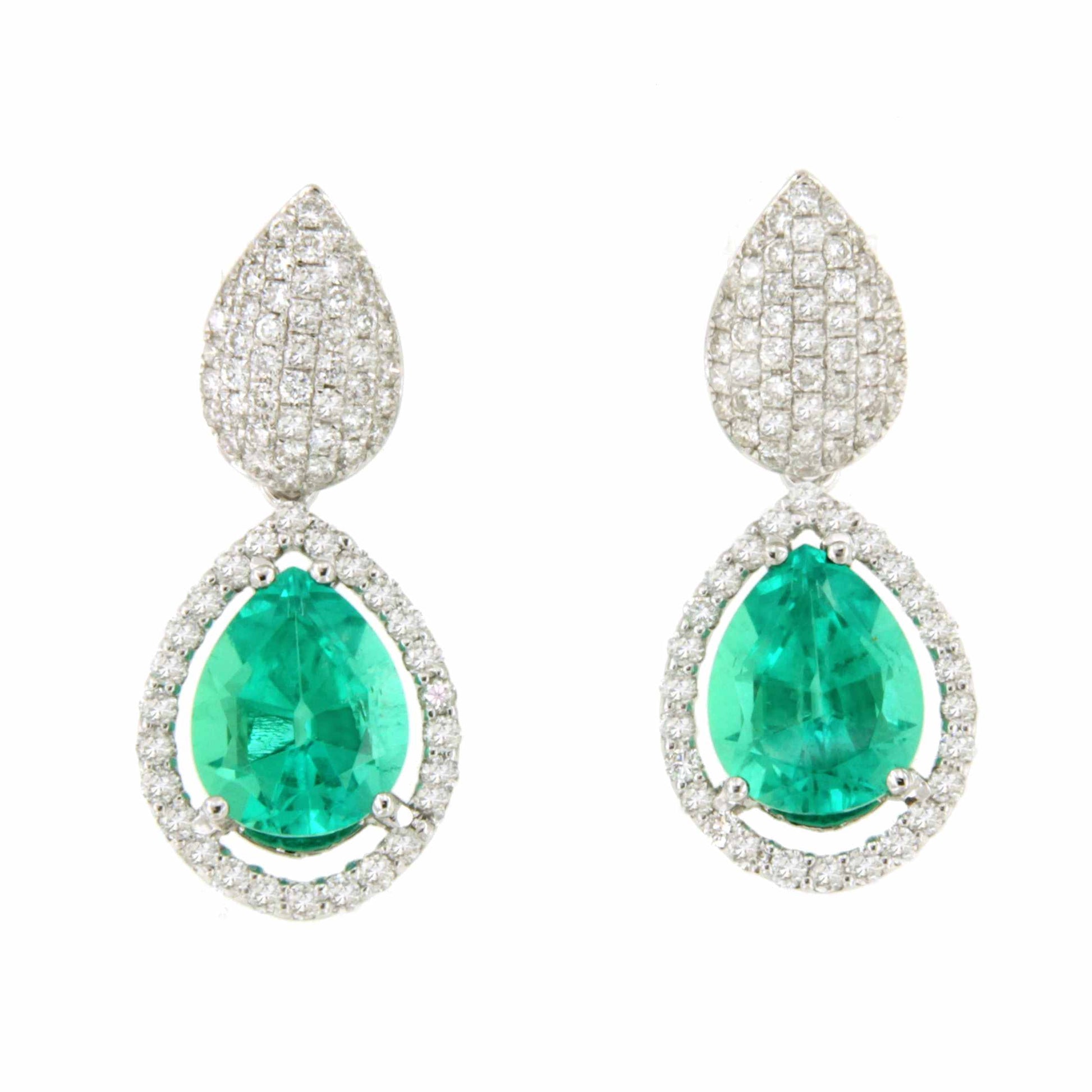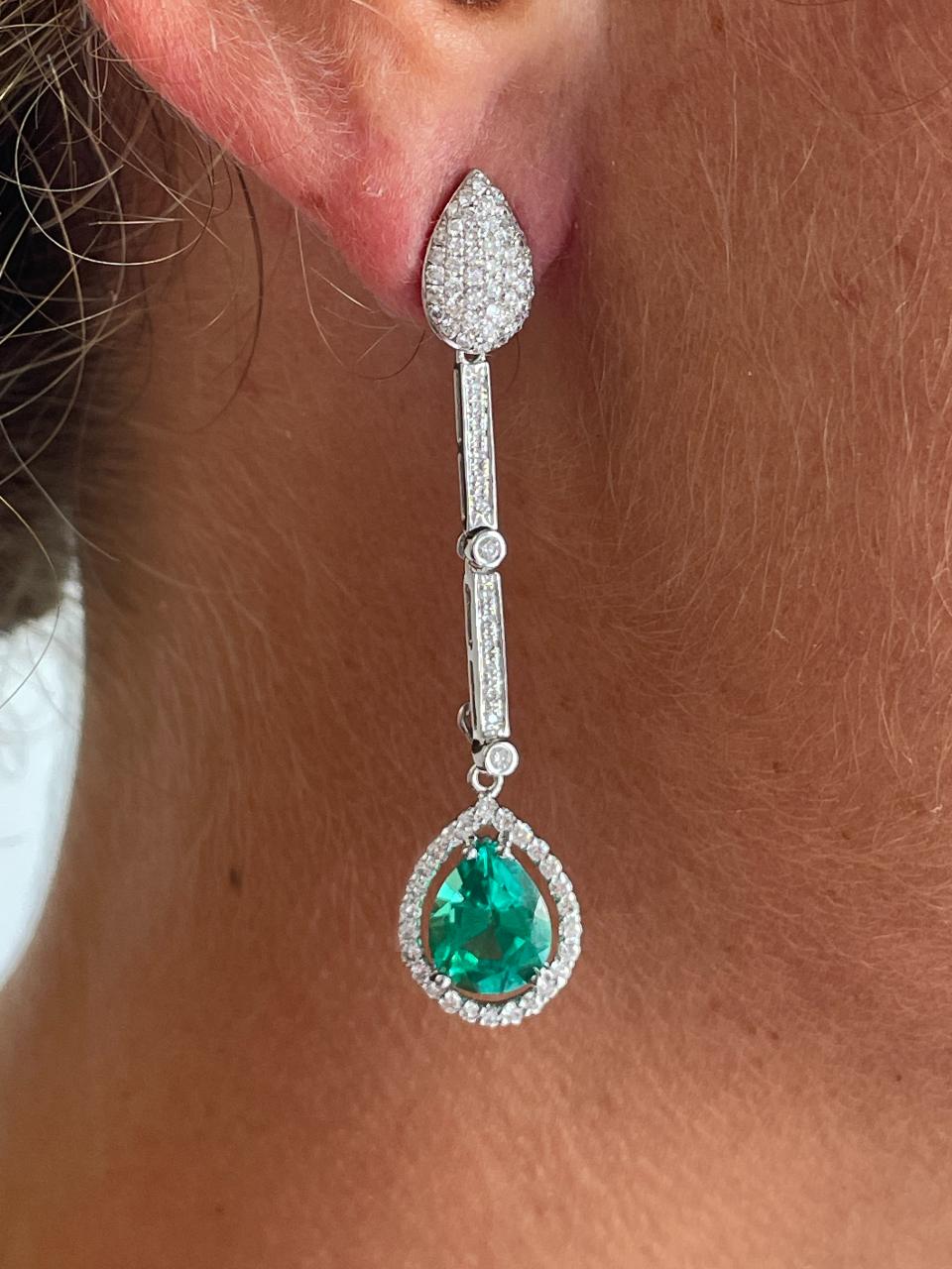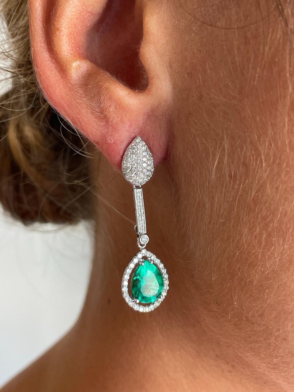 The BOGOTA pendants are a unique jewel that perfectly complements our detachable earrings. Crafted in 18-karat white gold , they feature teardrop-cut emeralds , carefully surrounded by a halo of brilliant diamonds that enhance their beauty and color.