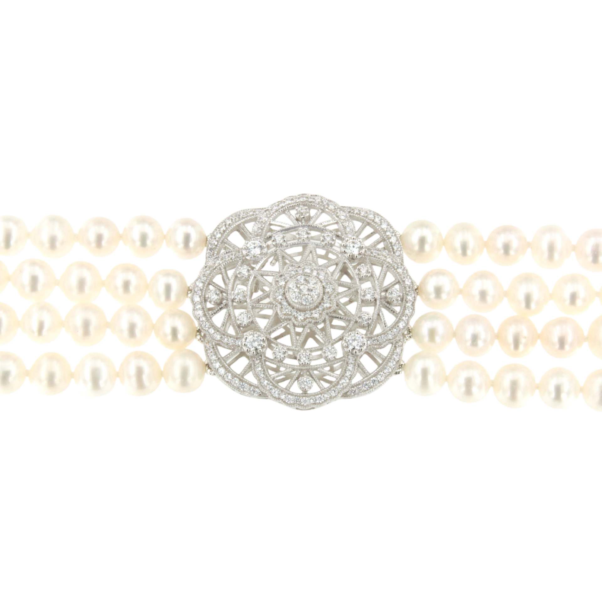 Precious gem: Cubic zirconias and Chinese freshwater pearls 6.50-7 mm (4 turns) and 7.5-8 mm (3 turns) elongated.