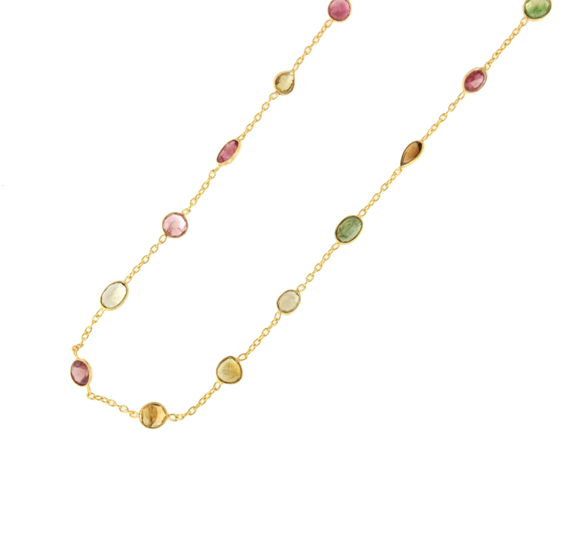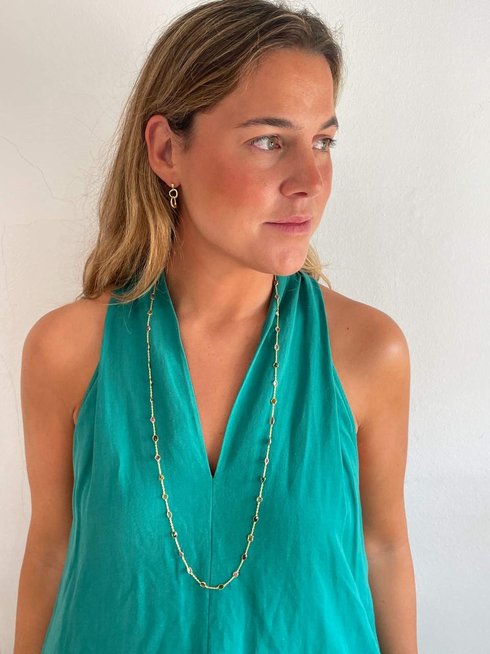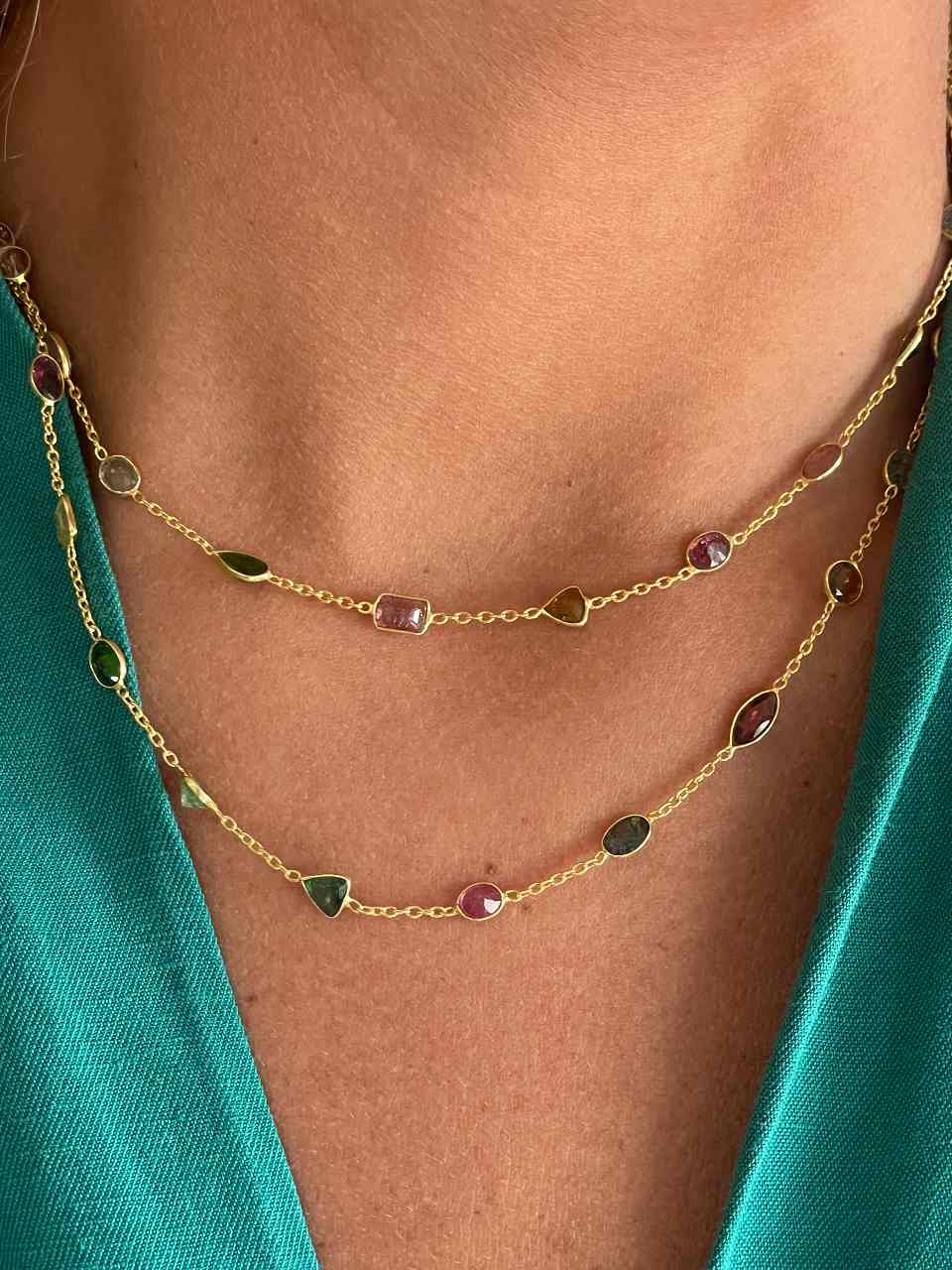 HUESITO , a long necklace that is a pure explosion of color. Crafted in sterling silver with an 18-karat gold plating, it is composed of a vibrant succession of tourmalines in different tones , shapes, and shades, filling the piece with life and energy.