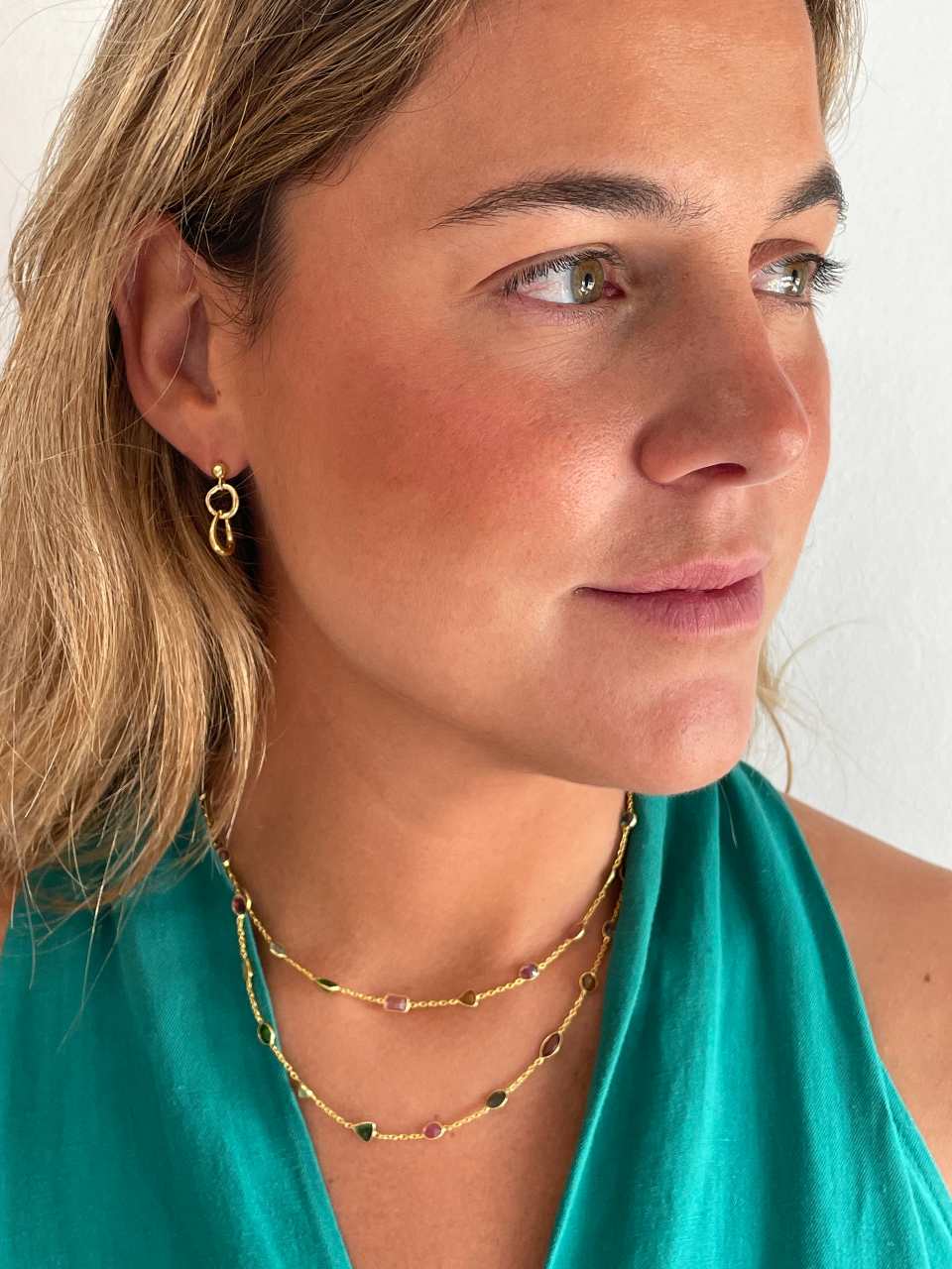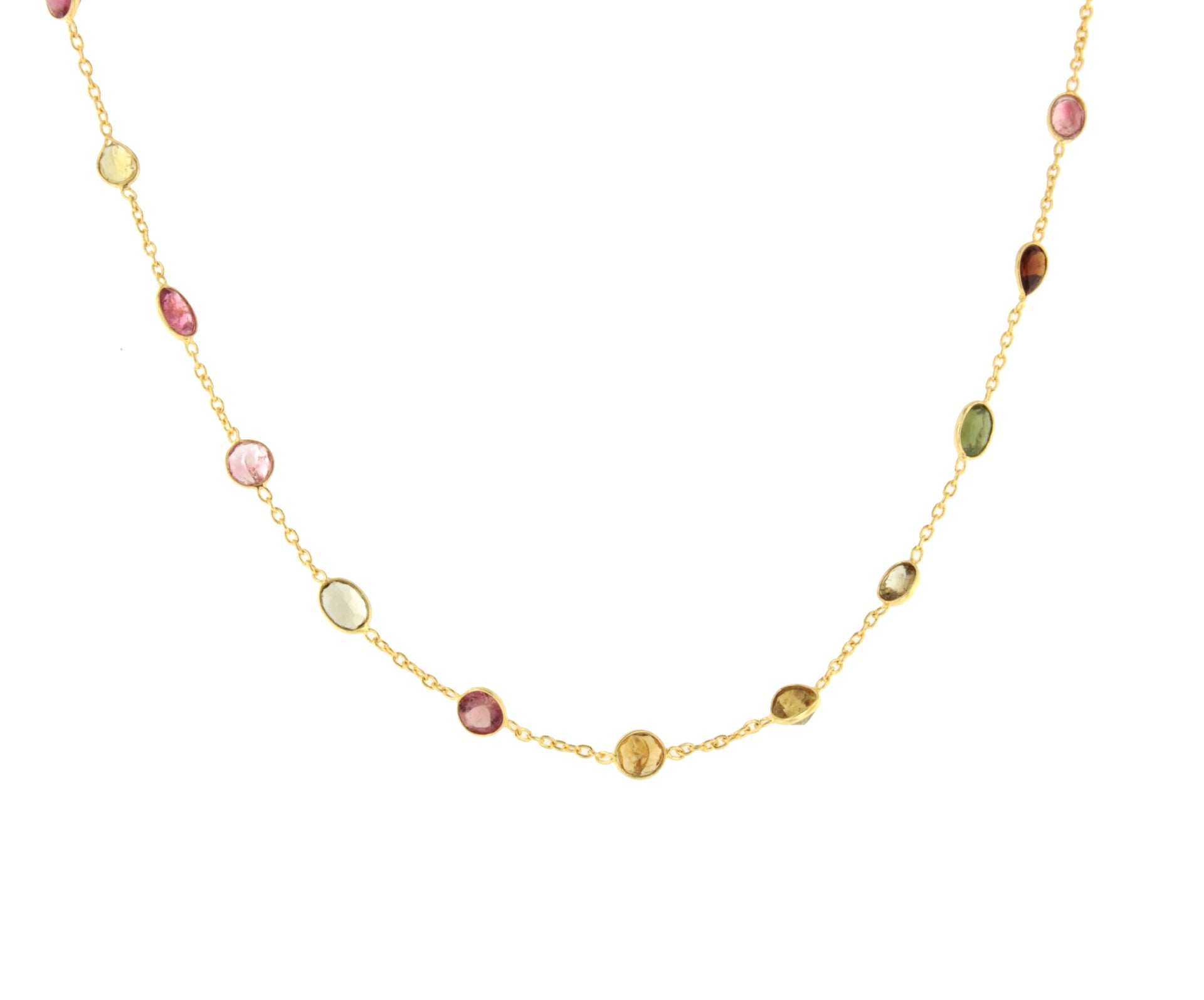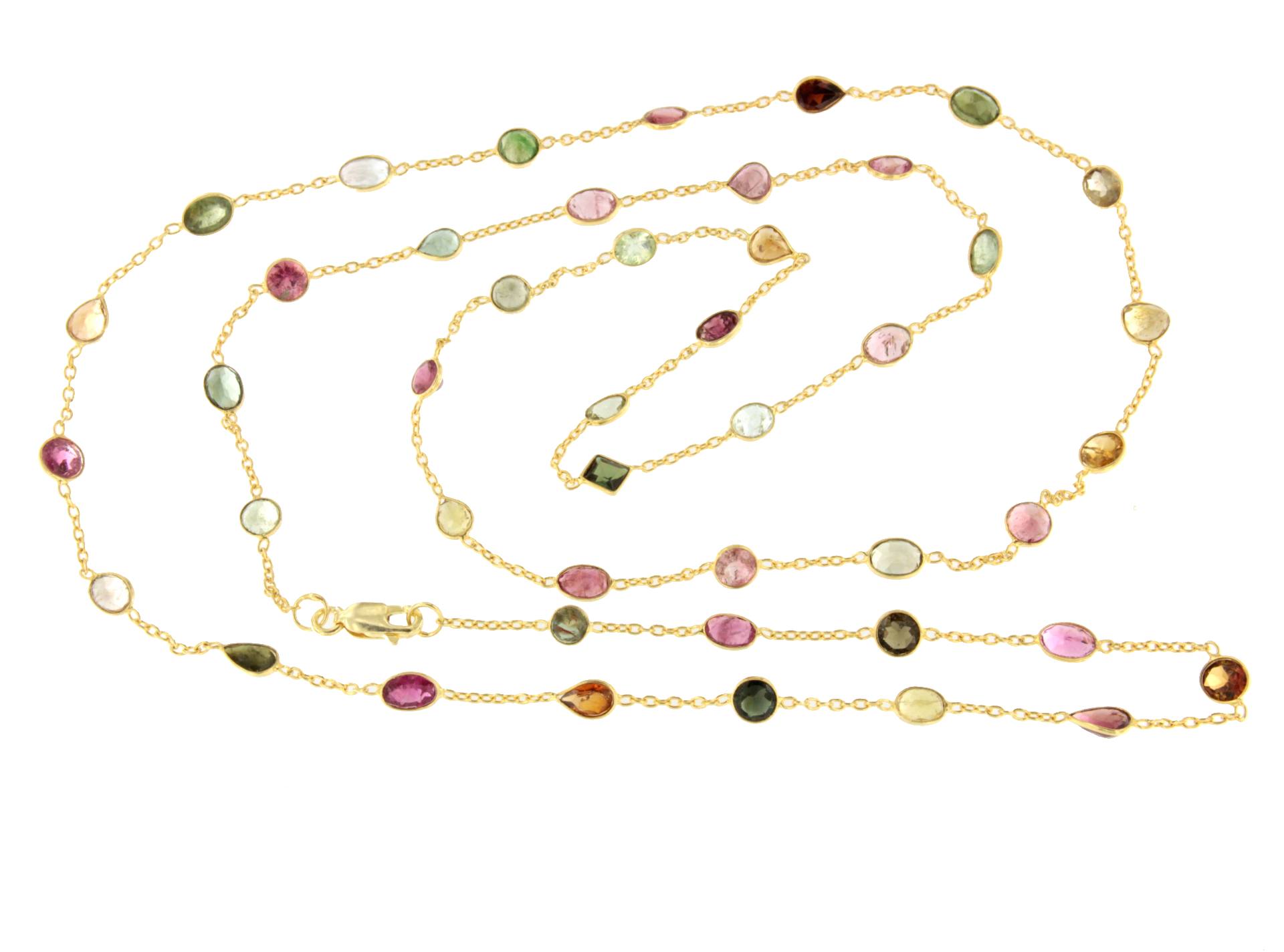 HUESITO , a long necklace that is a pure explosion of color. Crafted in sterling silver with an 18-karat gold plating, it is composed of a vibrant succession of tourmalines in different tones , shapes, and shades, filling the piece with life and energy.