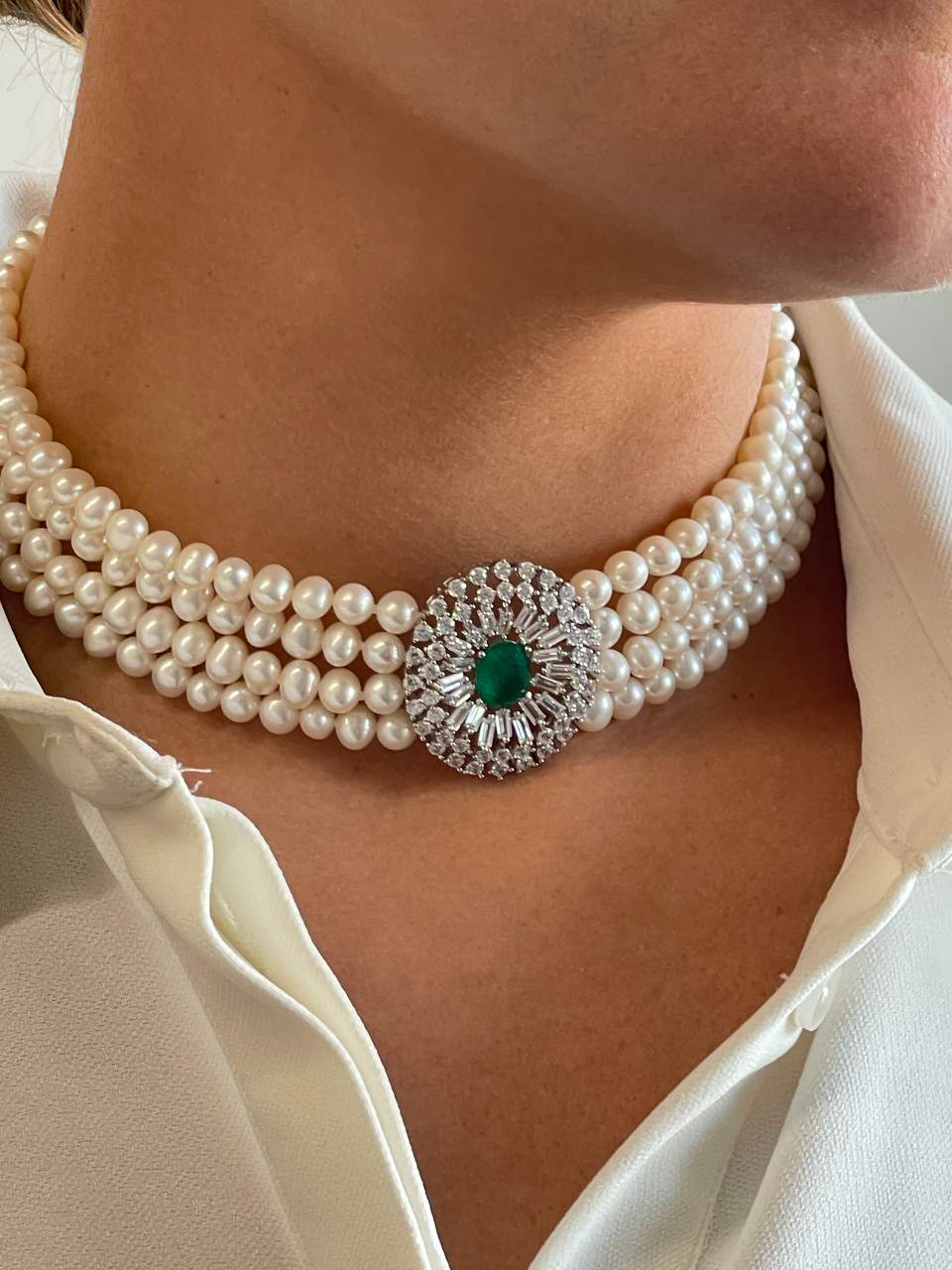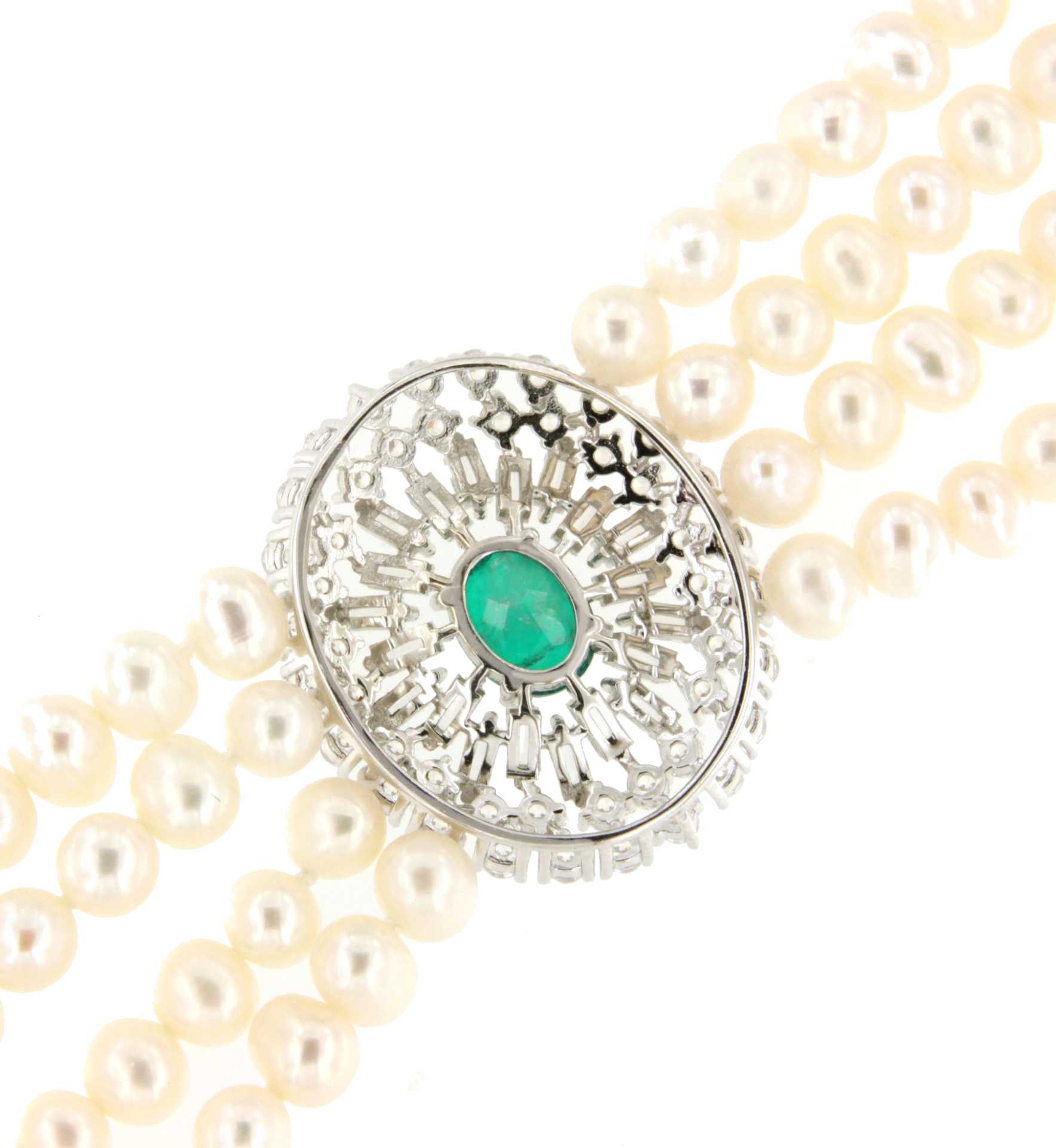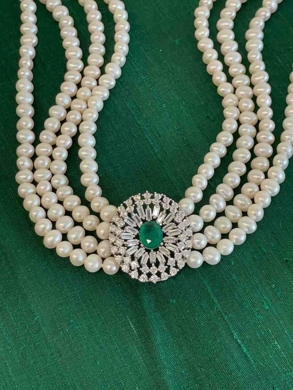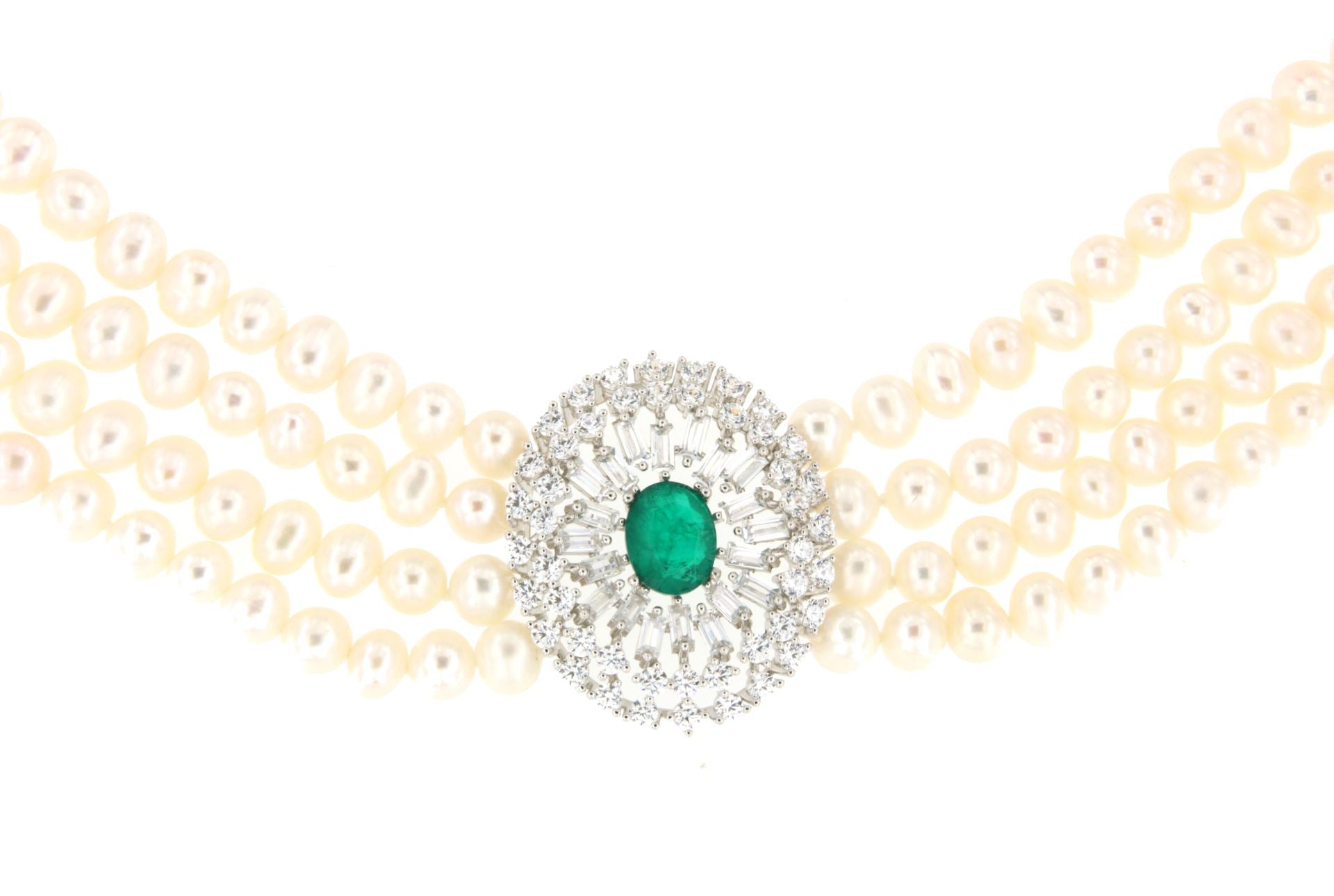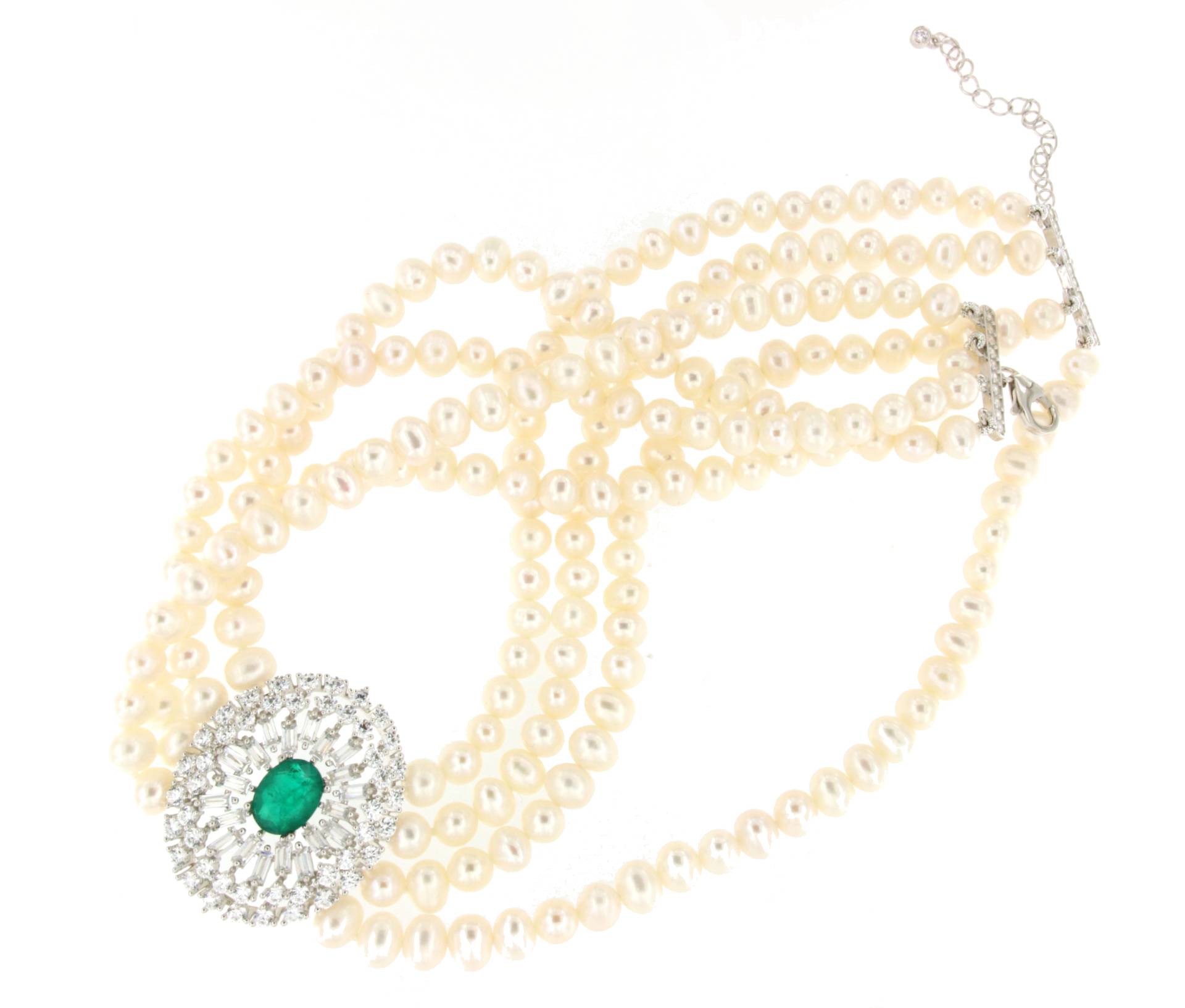 MAESTRIA is a necklace of Chinese freshwater pearls , with a very beautiful oriental design, with a 925 silver center and clasp with oval emerald-type quartz cubic zirconia.