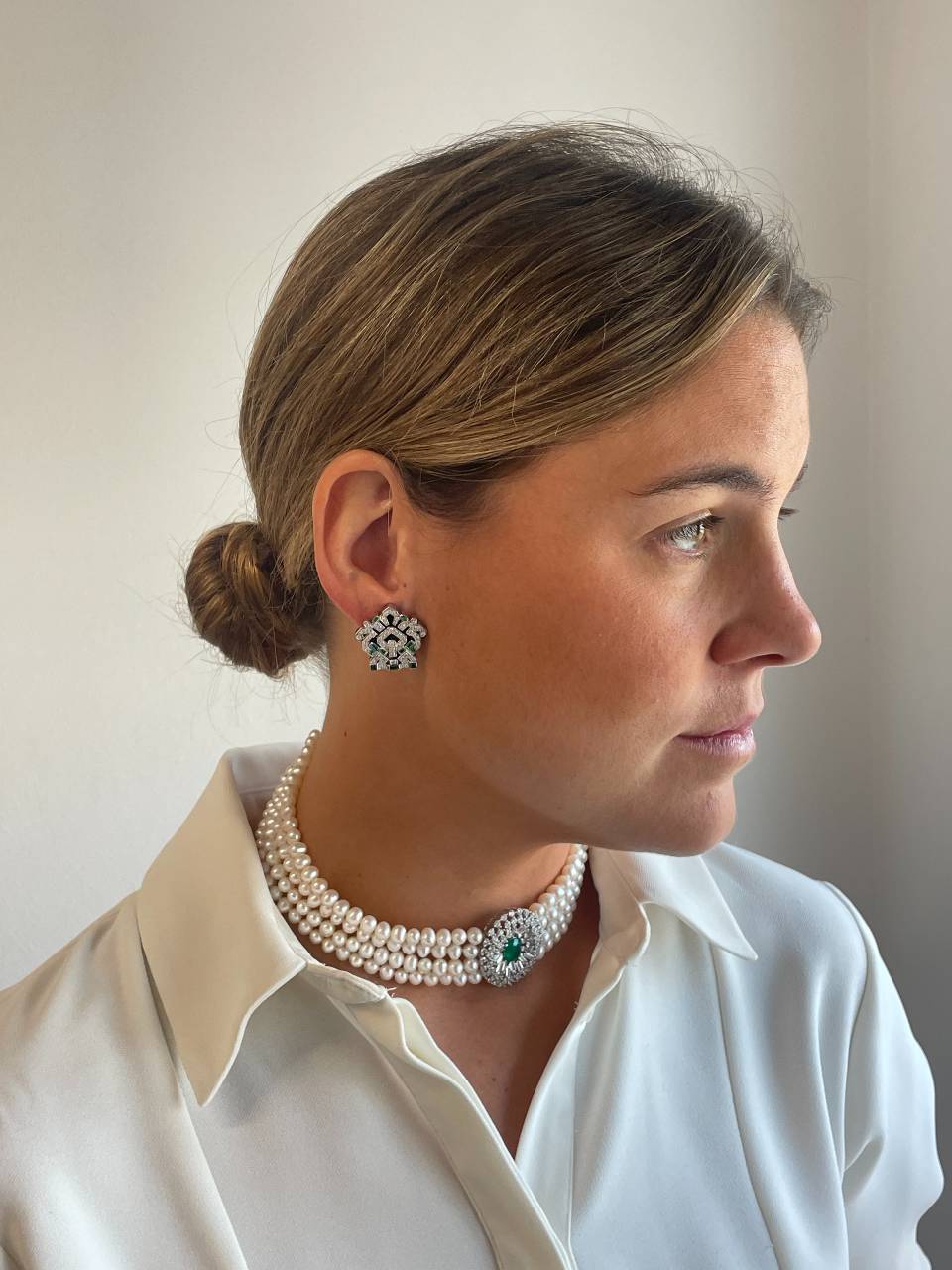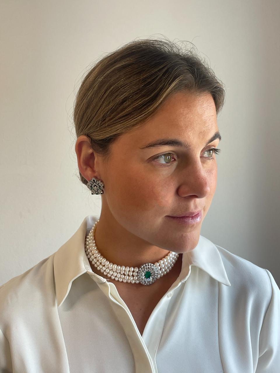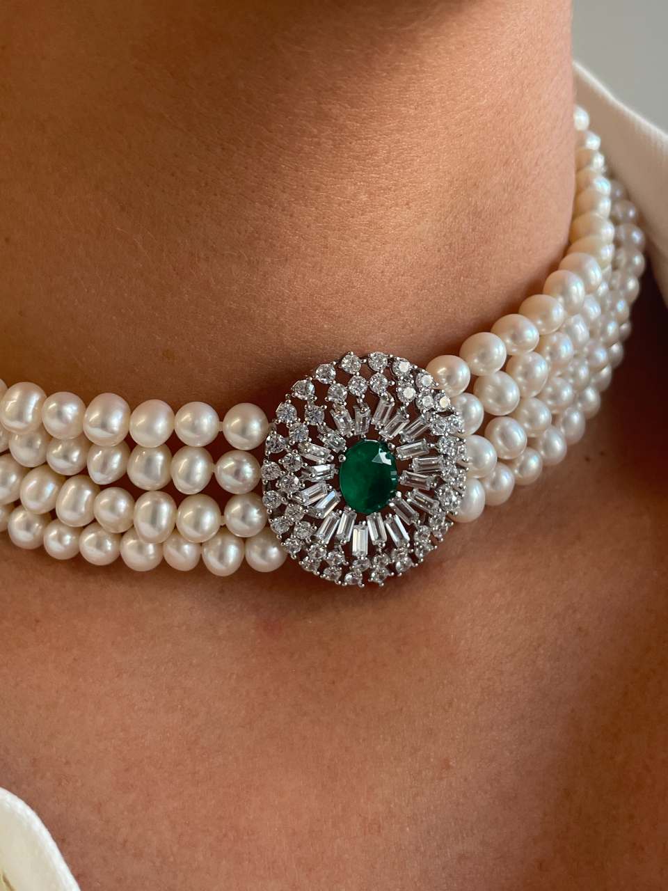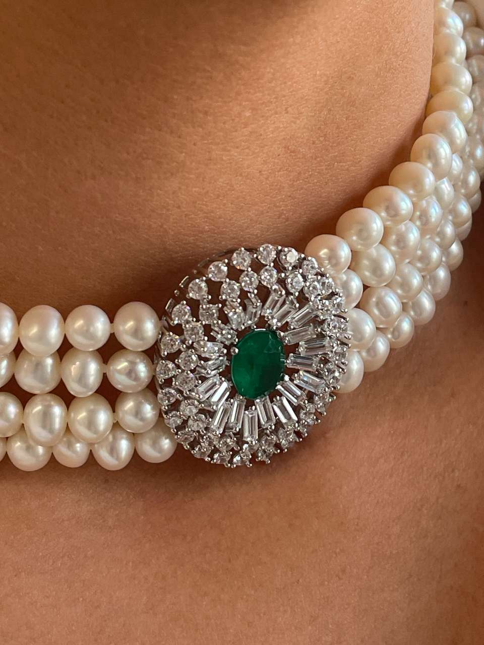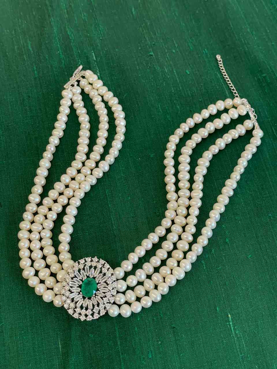 MAESTRIA is a necklace of Chinese freshwater pearls , with a very beautiful oriental design, with a 925 silver center and clasp with oval emerald-type quartz cubic zirconia.