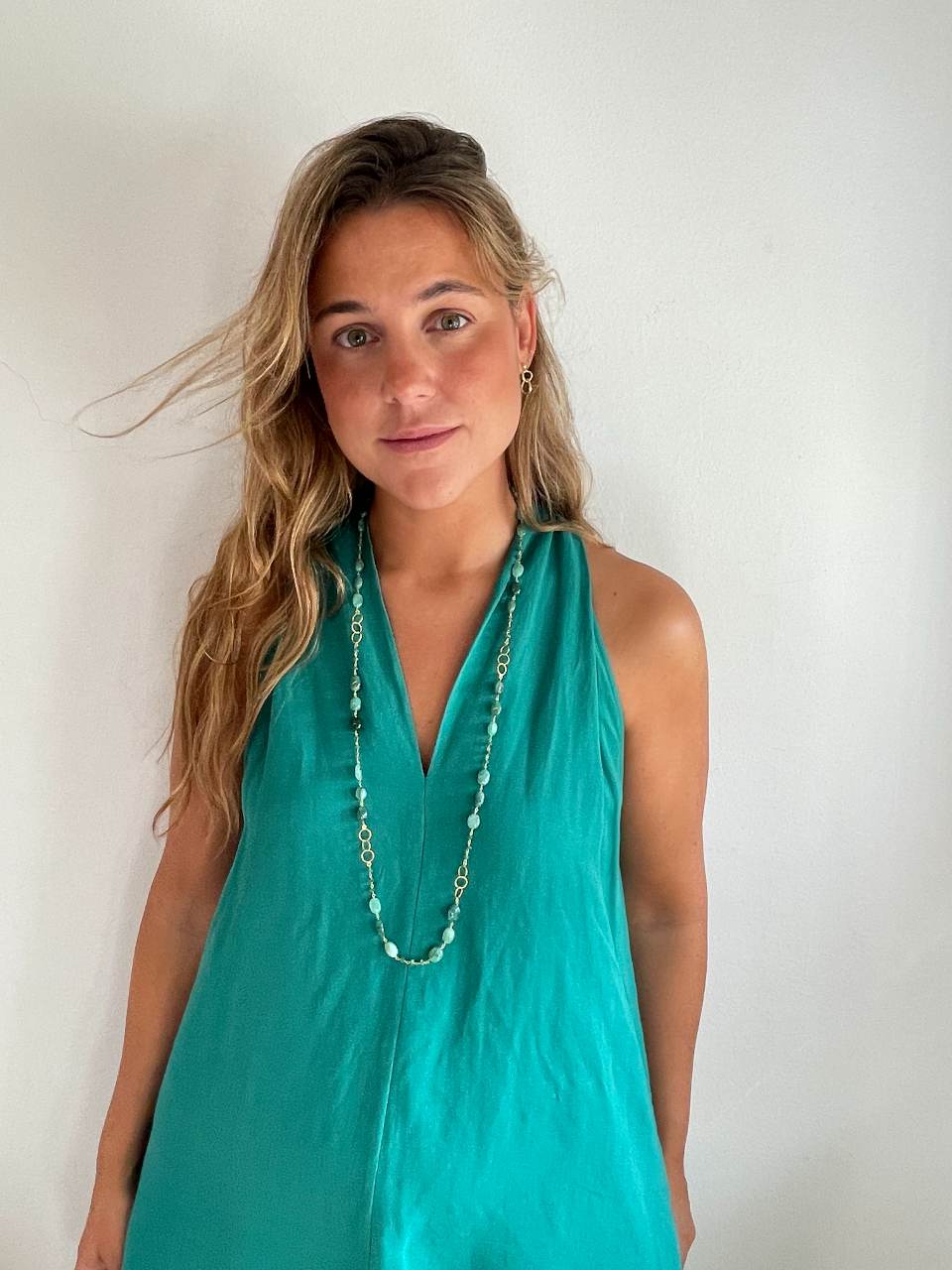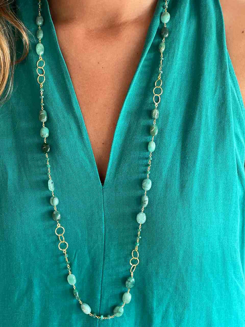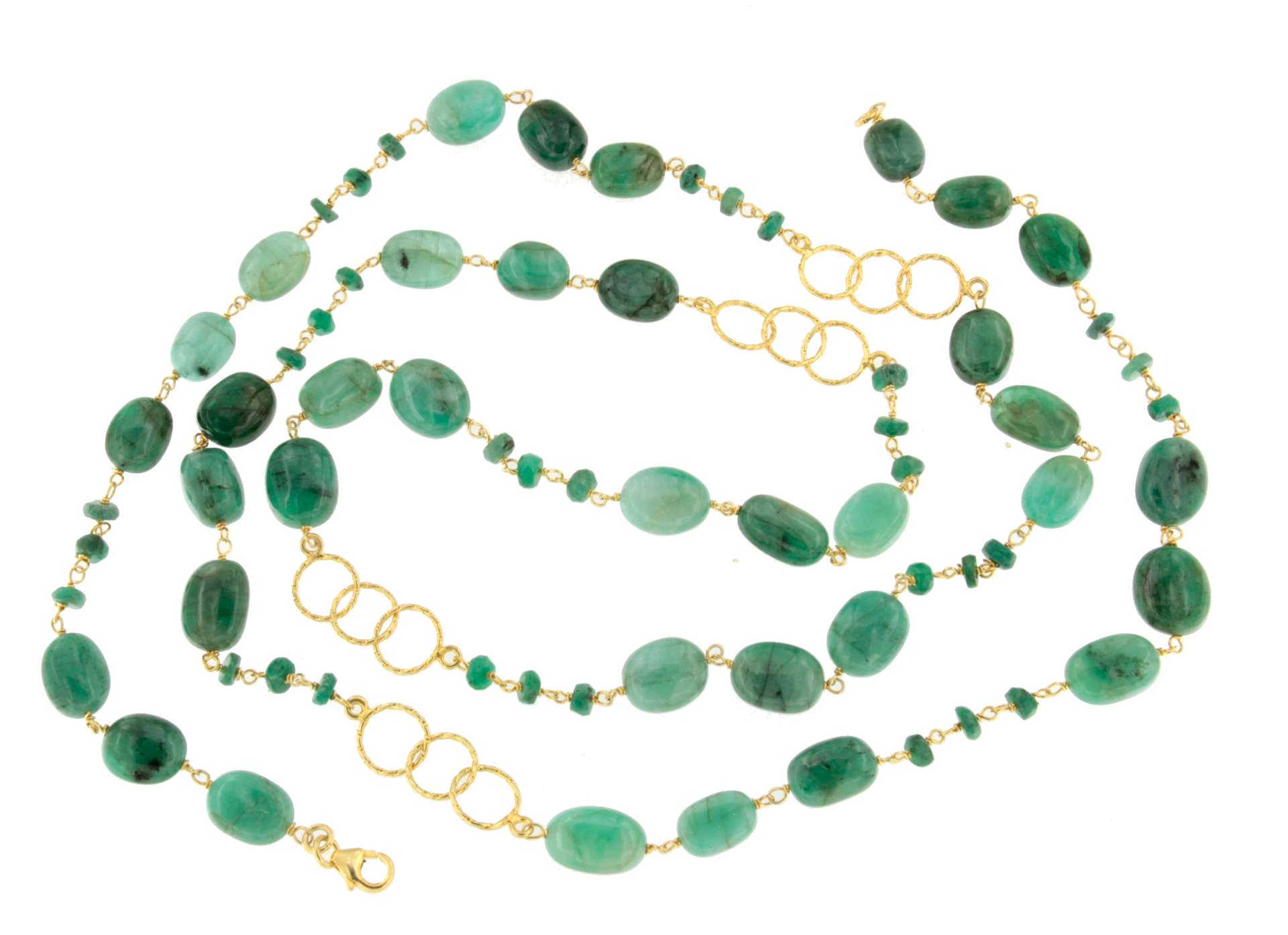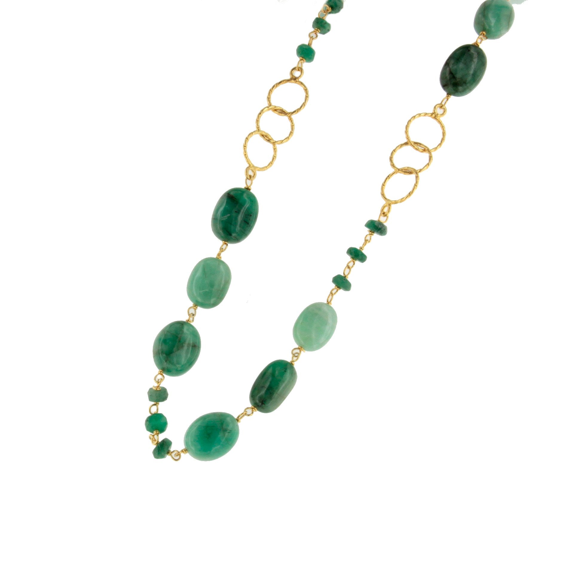 MELON , A long necklace that evokes the juicy freshness of a chilled melon in summer. It is crafted in sterling silver with an 18-karat gold plating and adorned with emeralds of varying sizes, complemented by delicate hammered gold links.