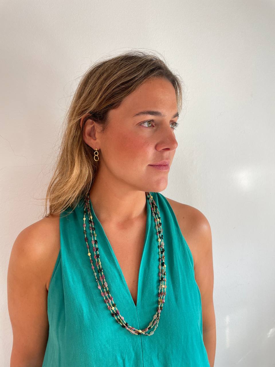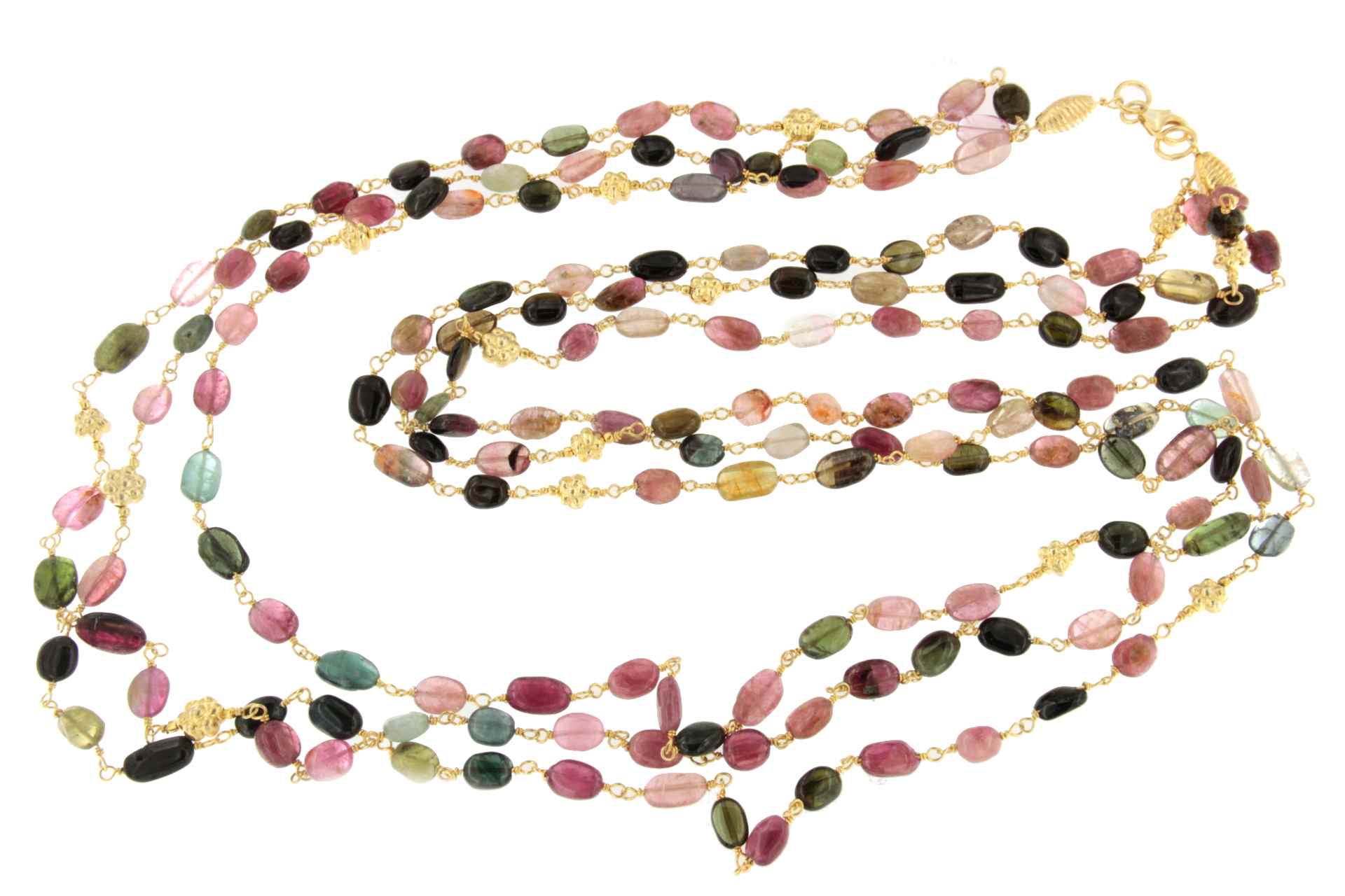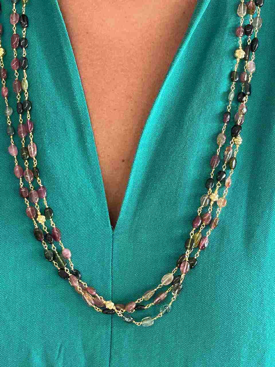 OSITO evokes the explosion of colors of classic gummy bears. A long necklace crafted in sterling silver plated with 18-karat gold , featuring a design composed of three rows of carefully combined multicolored tourmalines .