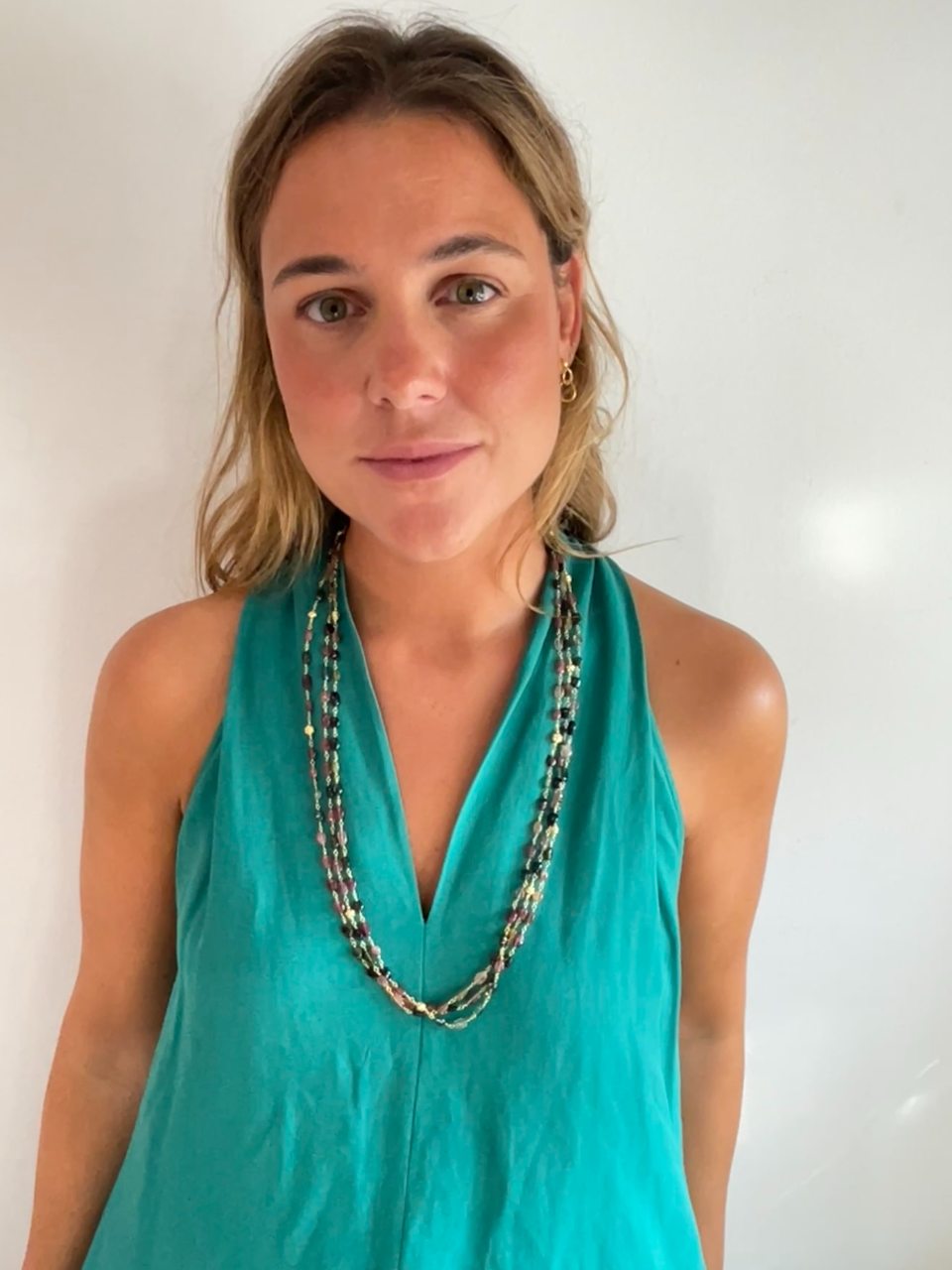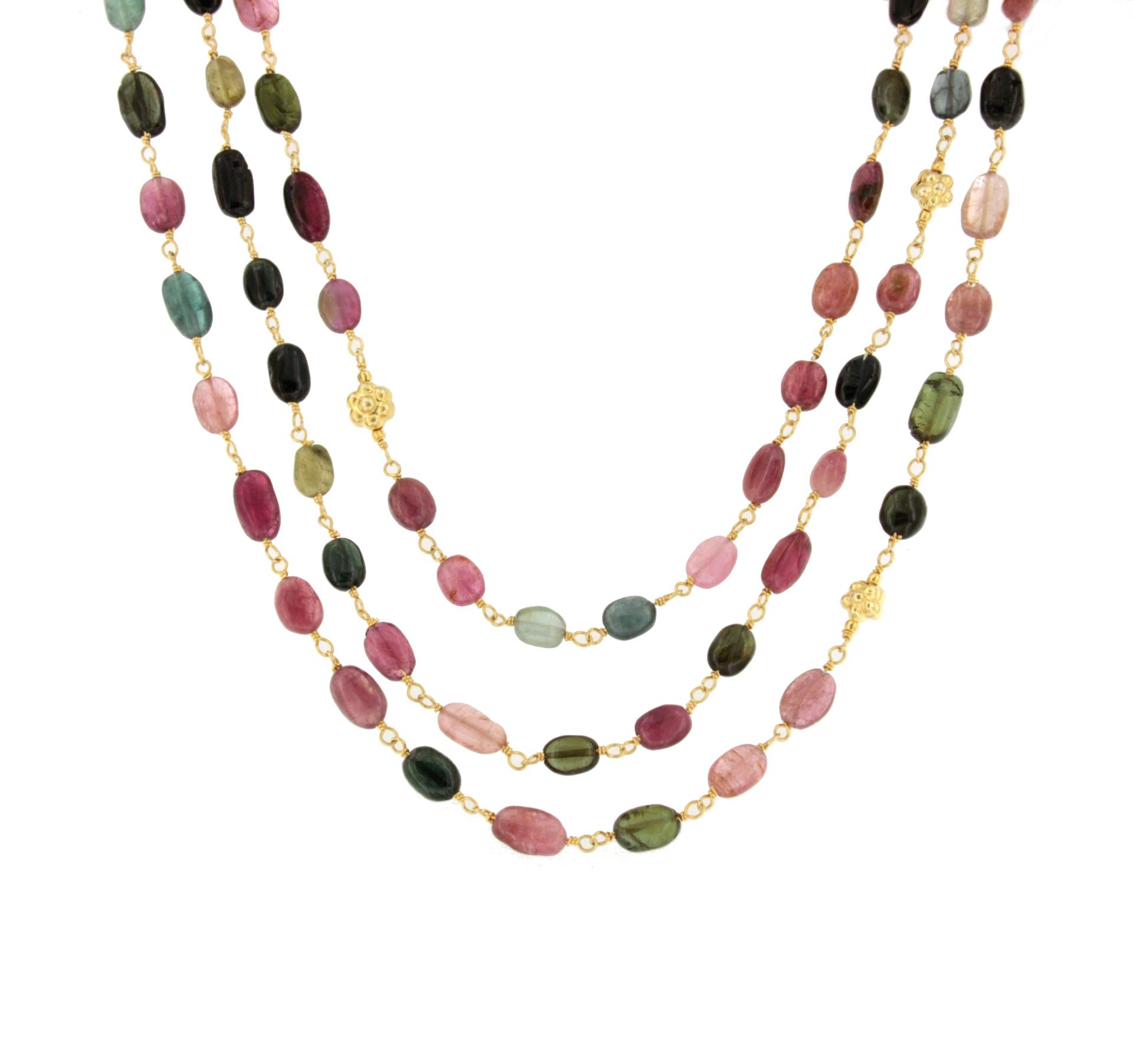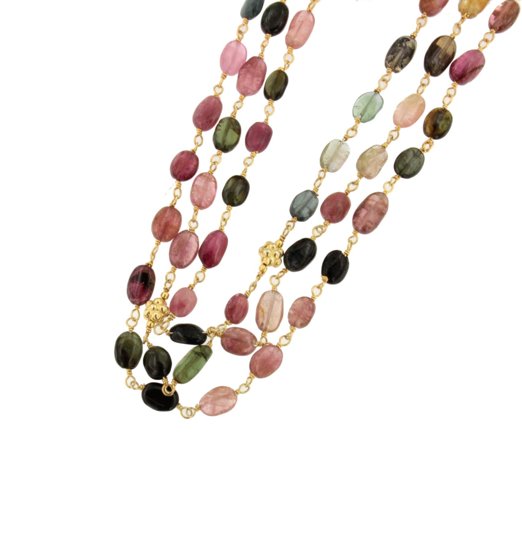 OSITO evokes the explosion of colors of classic gummy bears. A long necklace crafted in sterling silver plated with 18-karat gold , featuring a design composed of three rows of carefully combined multicolored tourmalines .