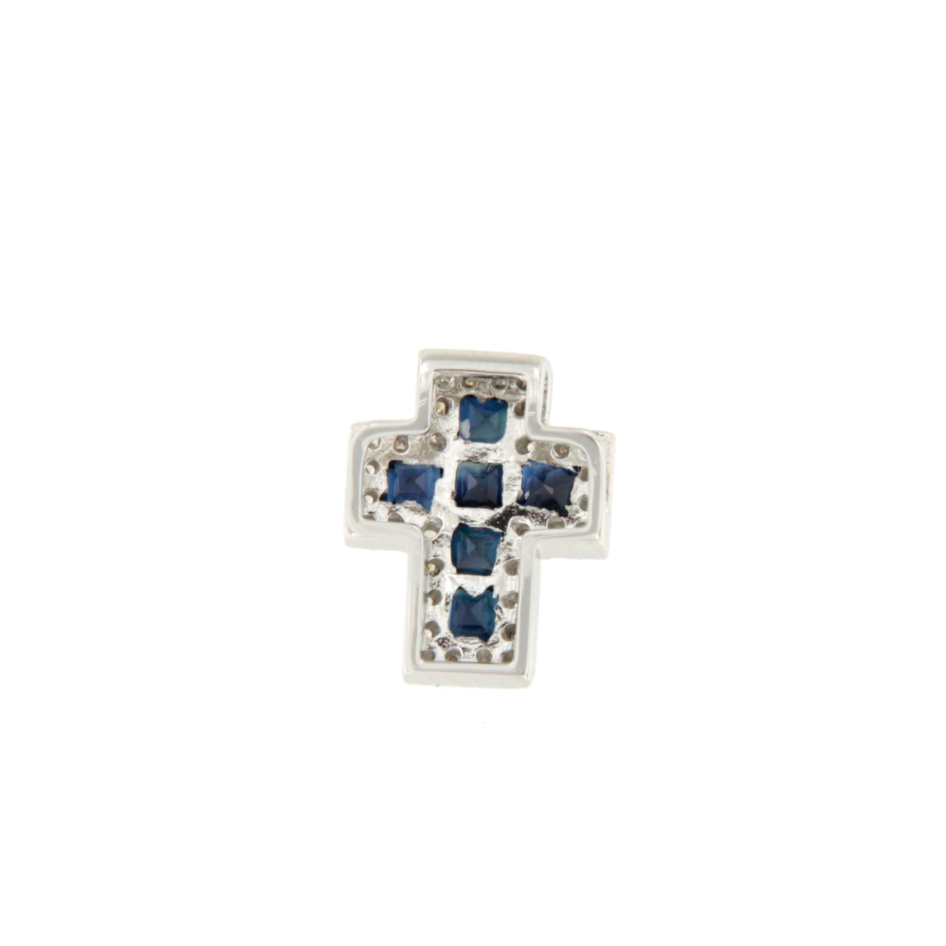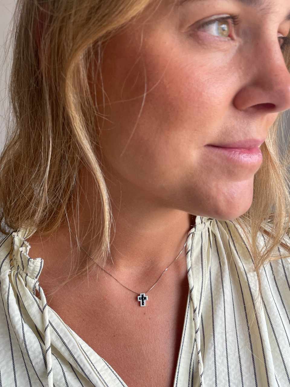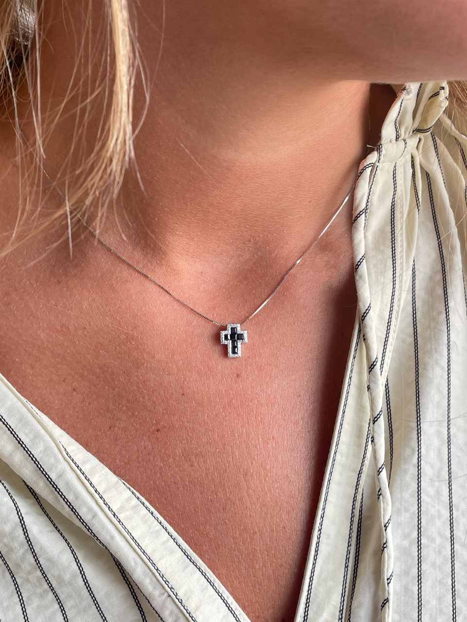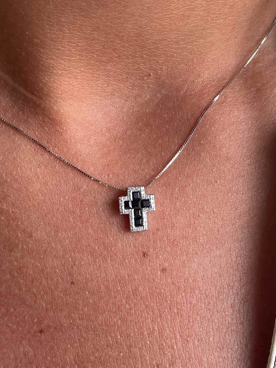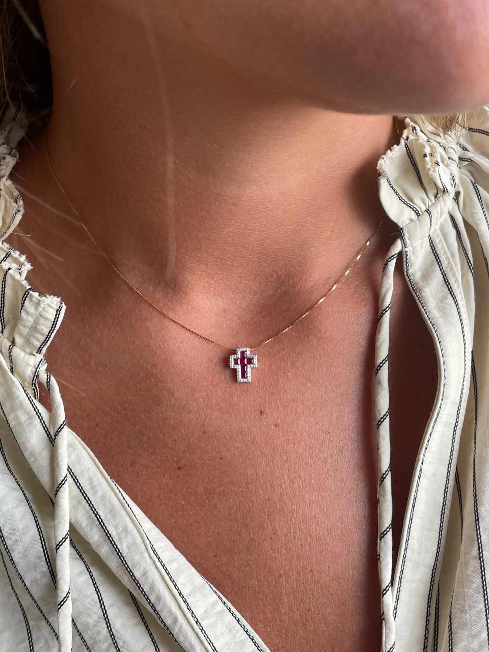 AUREZA is a small cross crafted in 14-karat rose/white gold, depending on the gemstone. Its elegant design combines sapphires/rubies with diamonds, adding a touch of sparkle to the neckline.