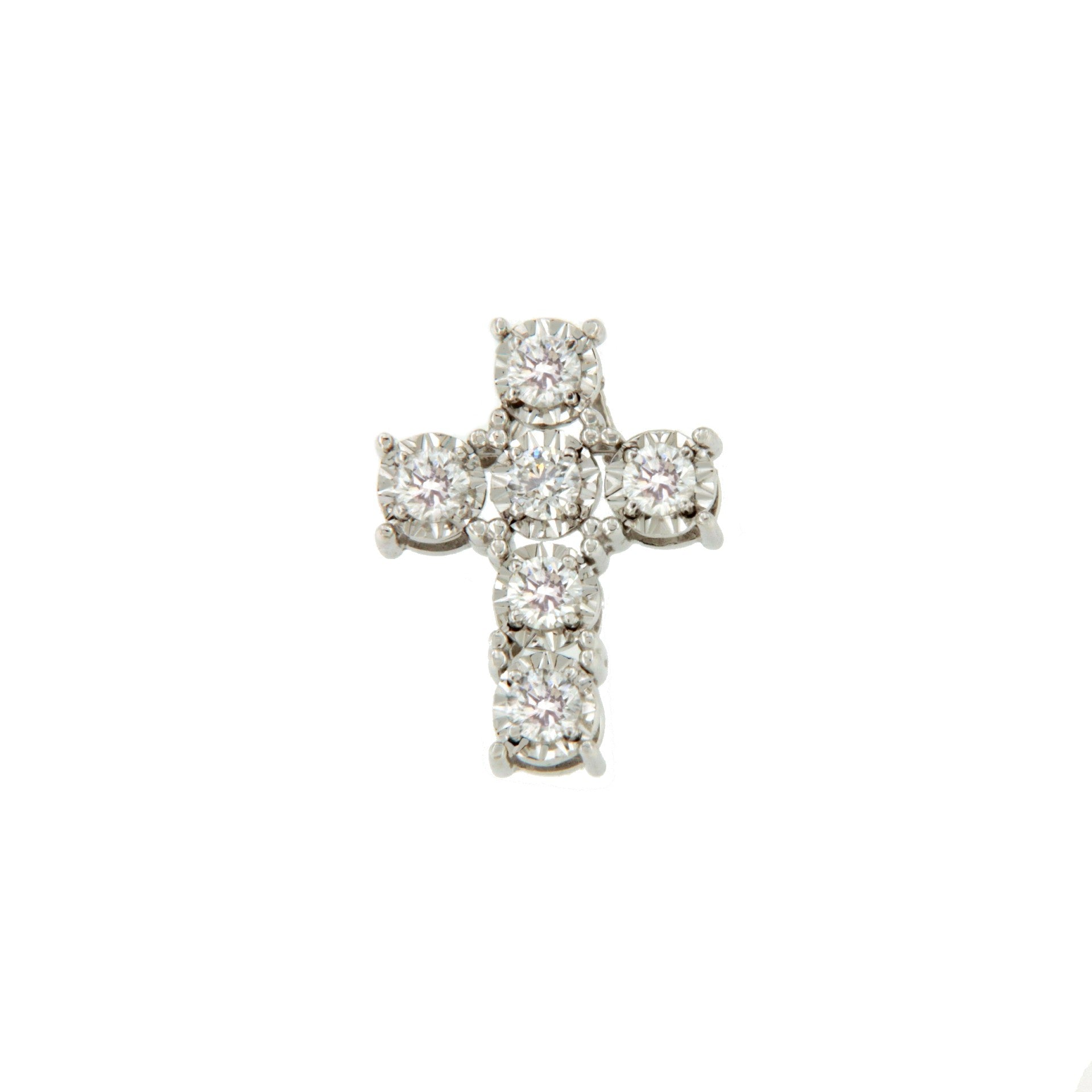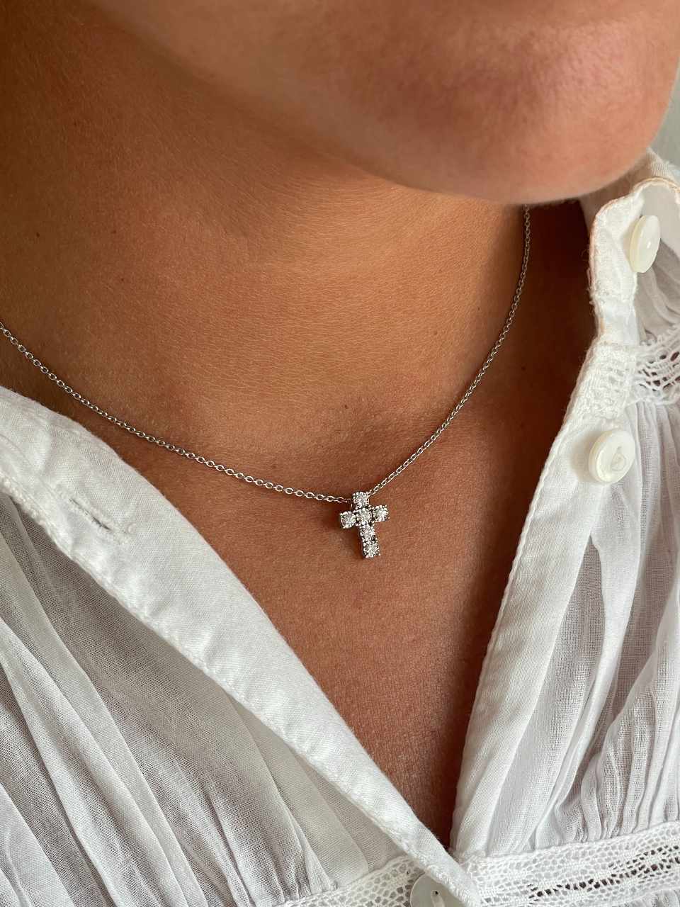 BASILEA is a small, very elegant cross made of 18-karat white gold . Its elegant and classic design features diamonds set in a diamond-encrusted base.