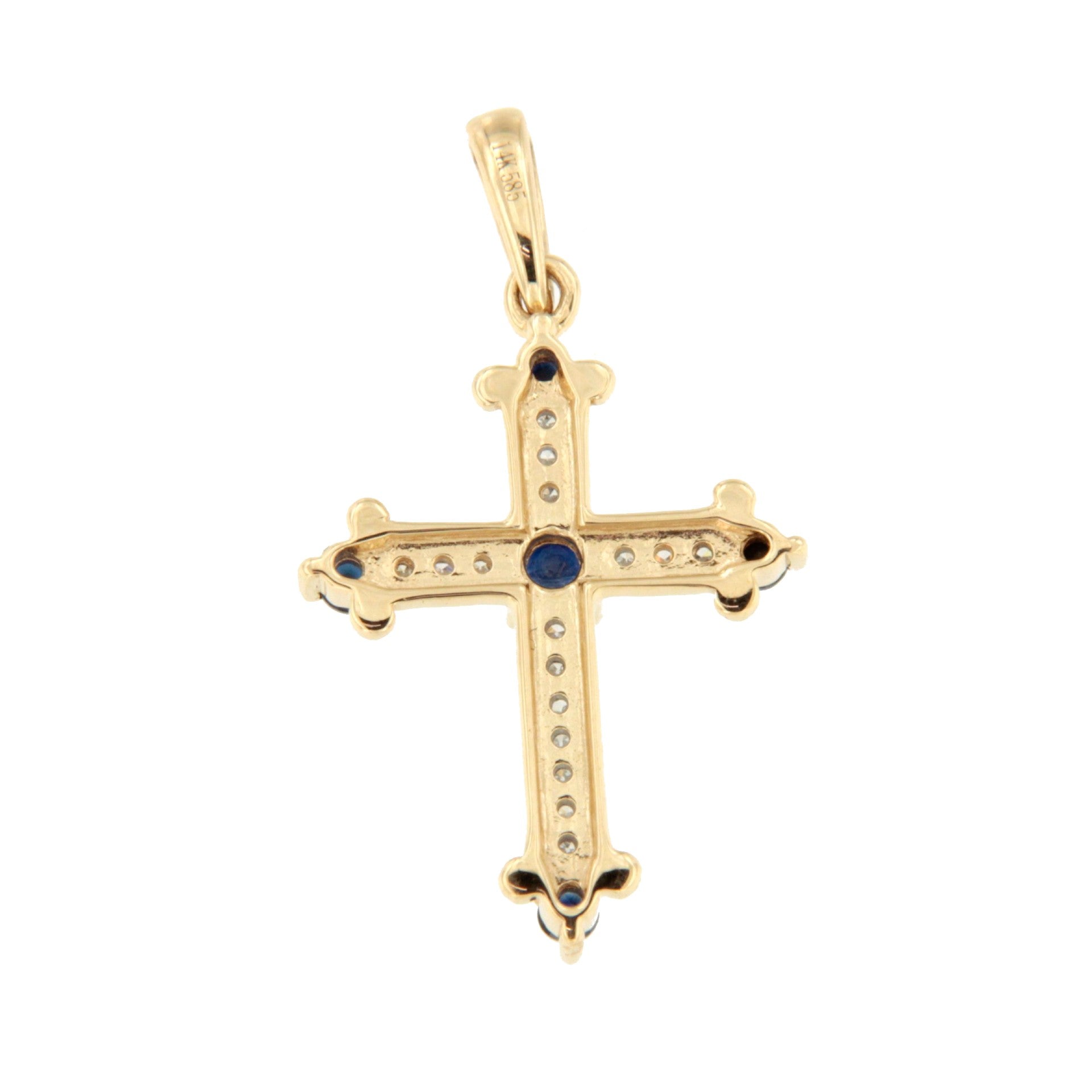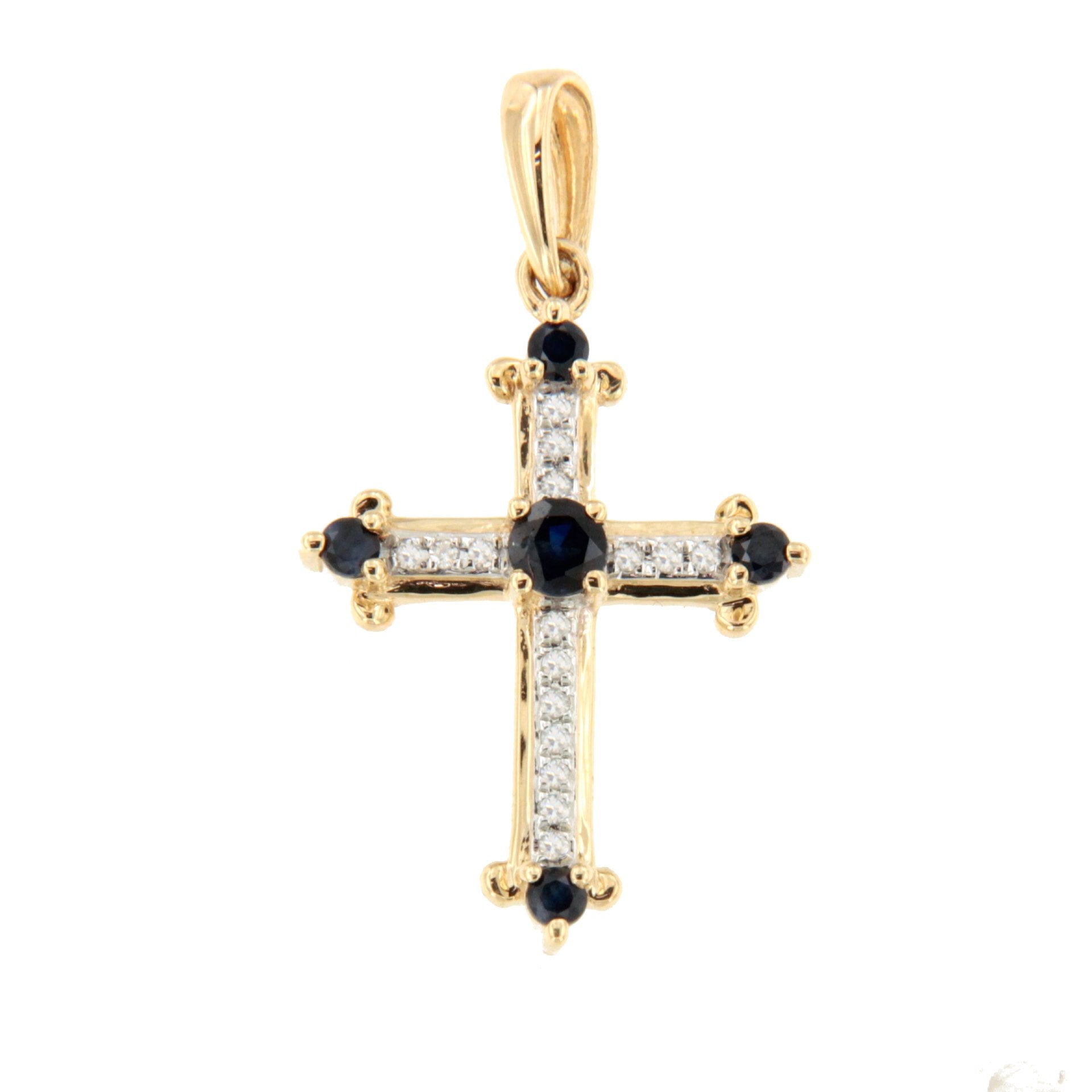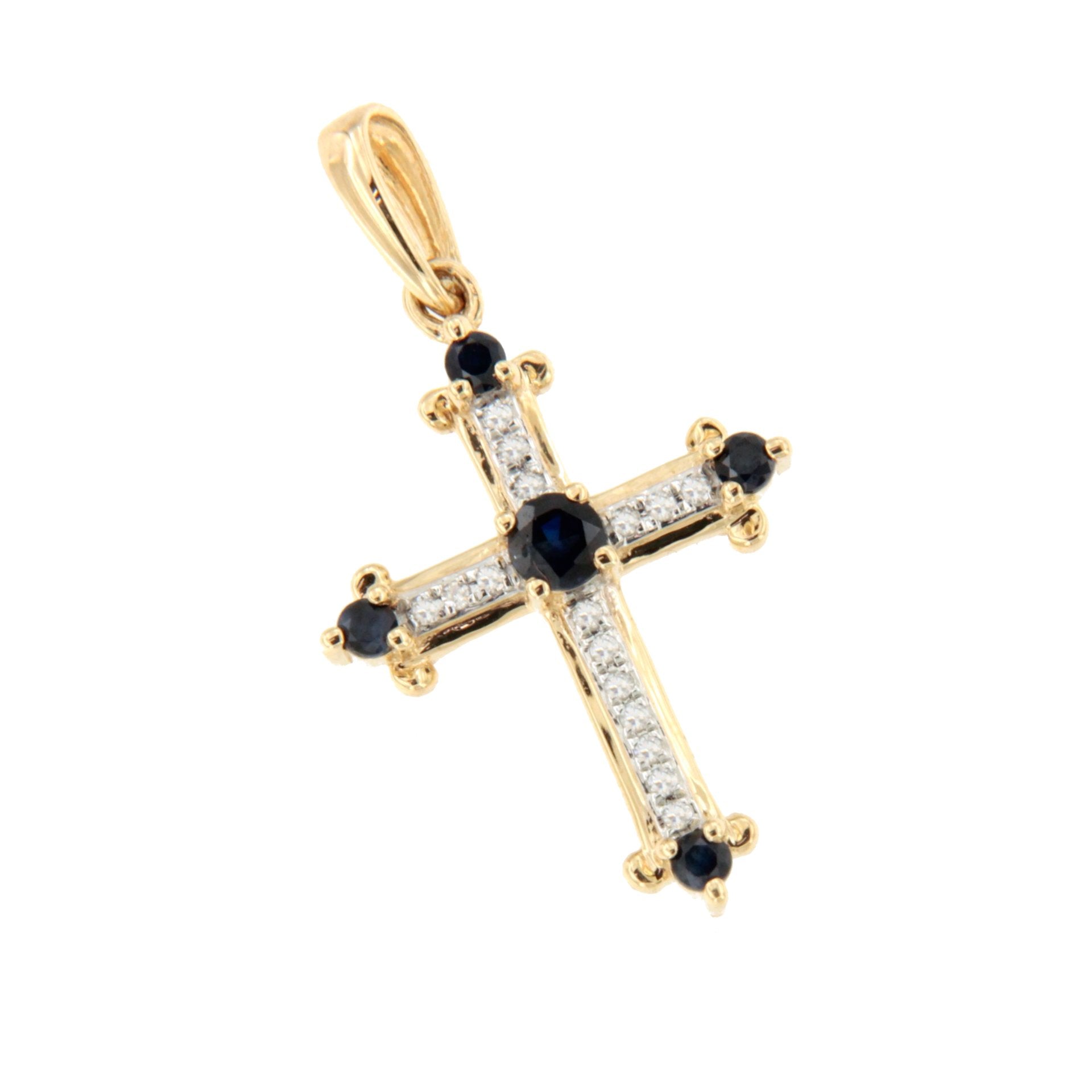 CLARIVA is a delicate cross crafted in 14-karat yellow gold. Its elegant design combines sapphire and emerald gems with brilliant-cut diamonds that add a touch of brilliance.