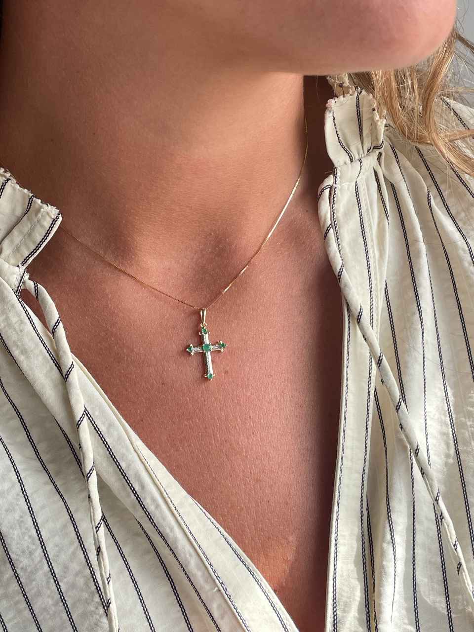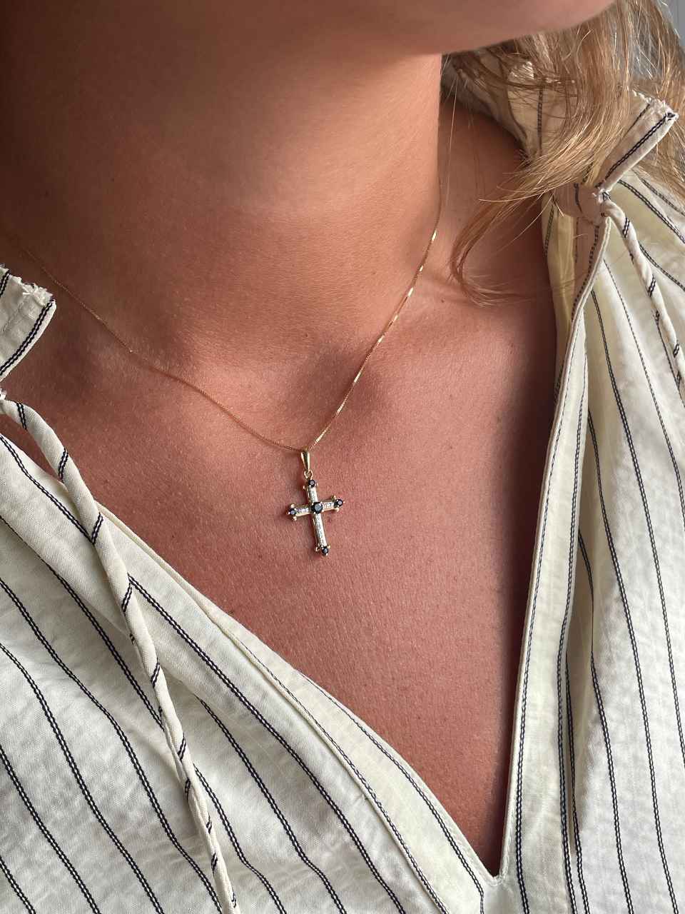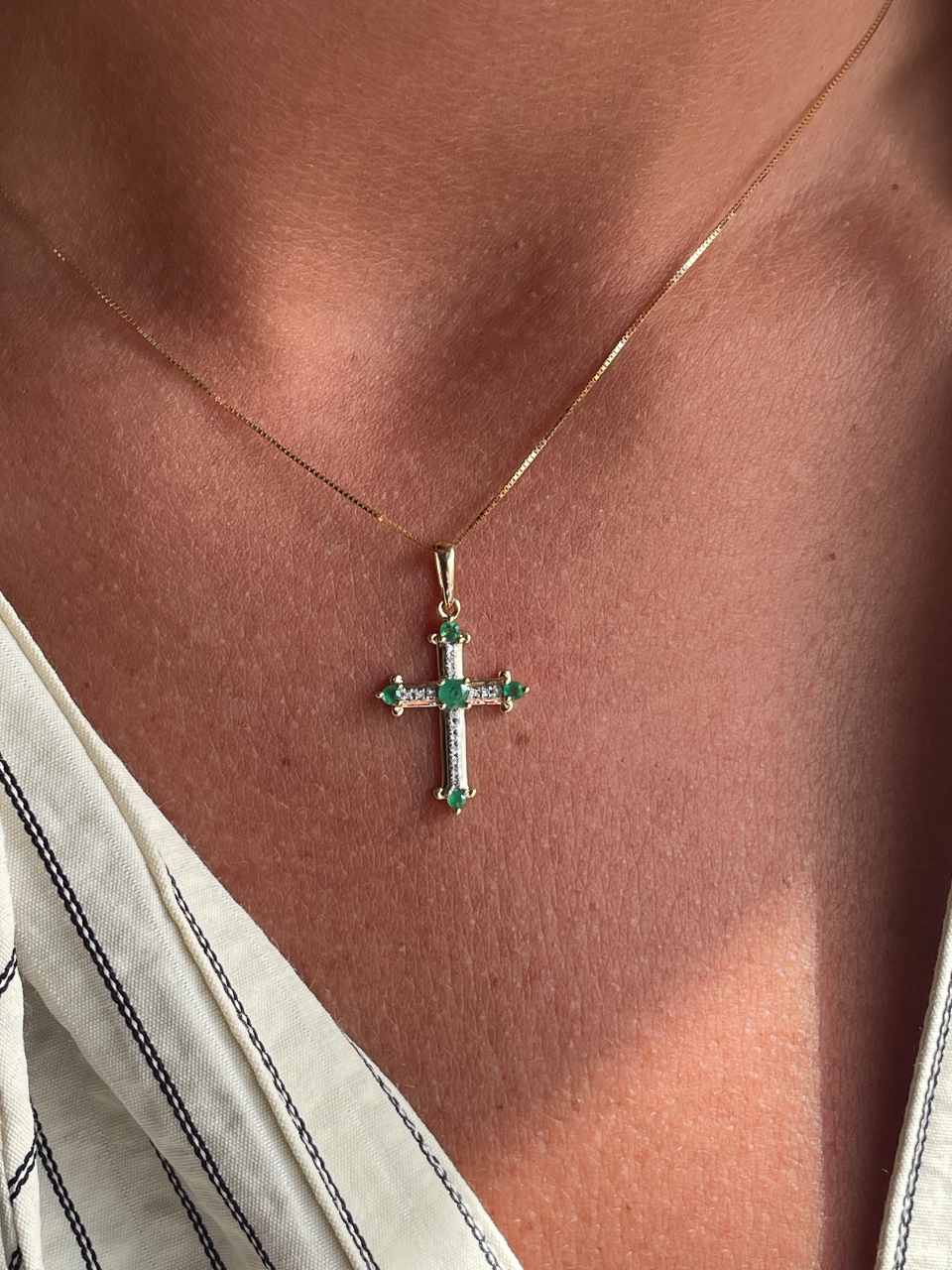 CLARIVA is a delicate cross crafted in 14-karat yellow gold. Its elegant design combines sapphire and emerald gems with brilliant-cut diamonds that add a touch of brilliance.