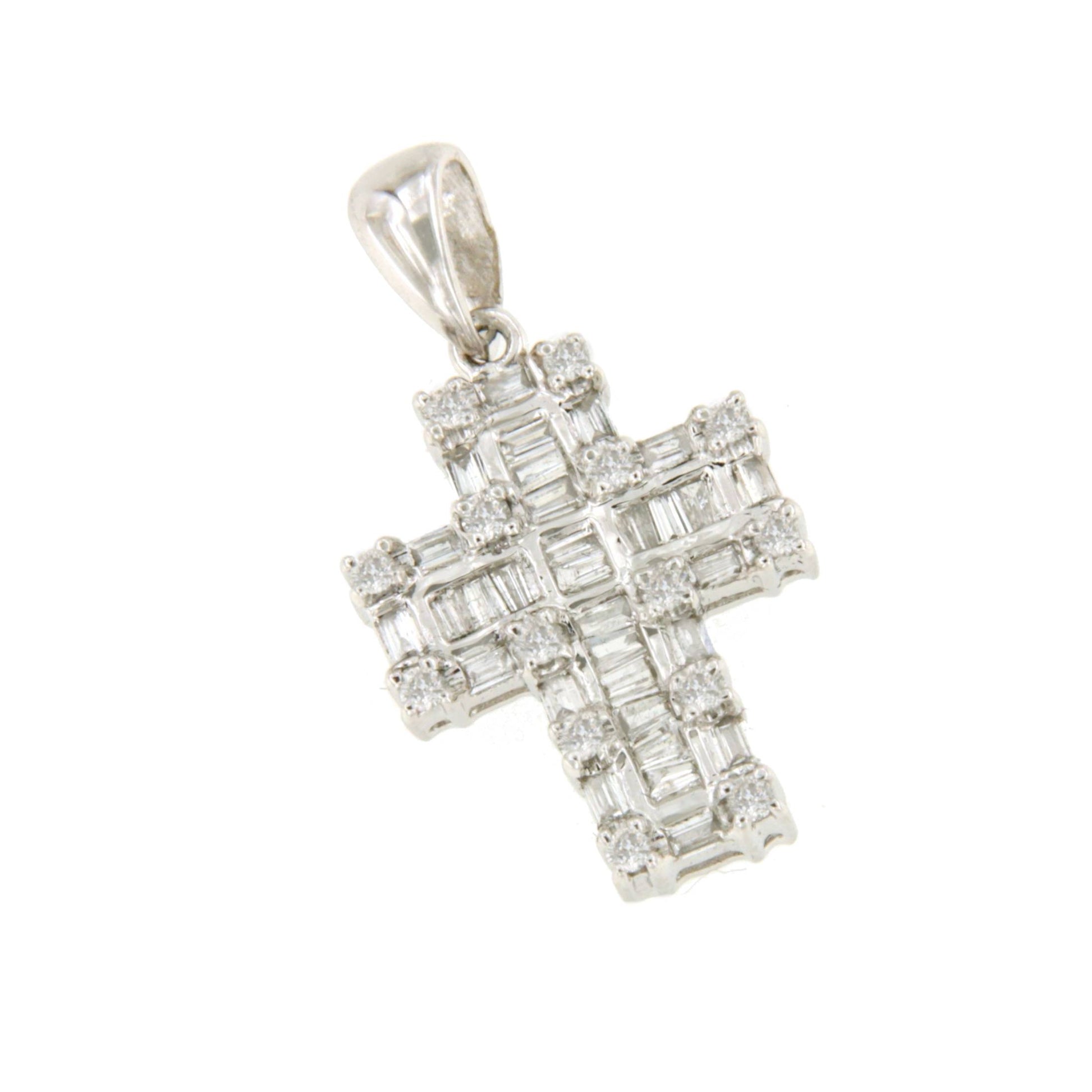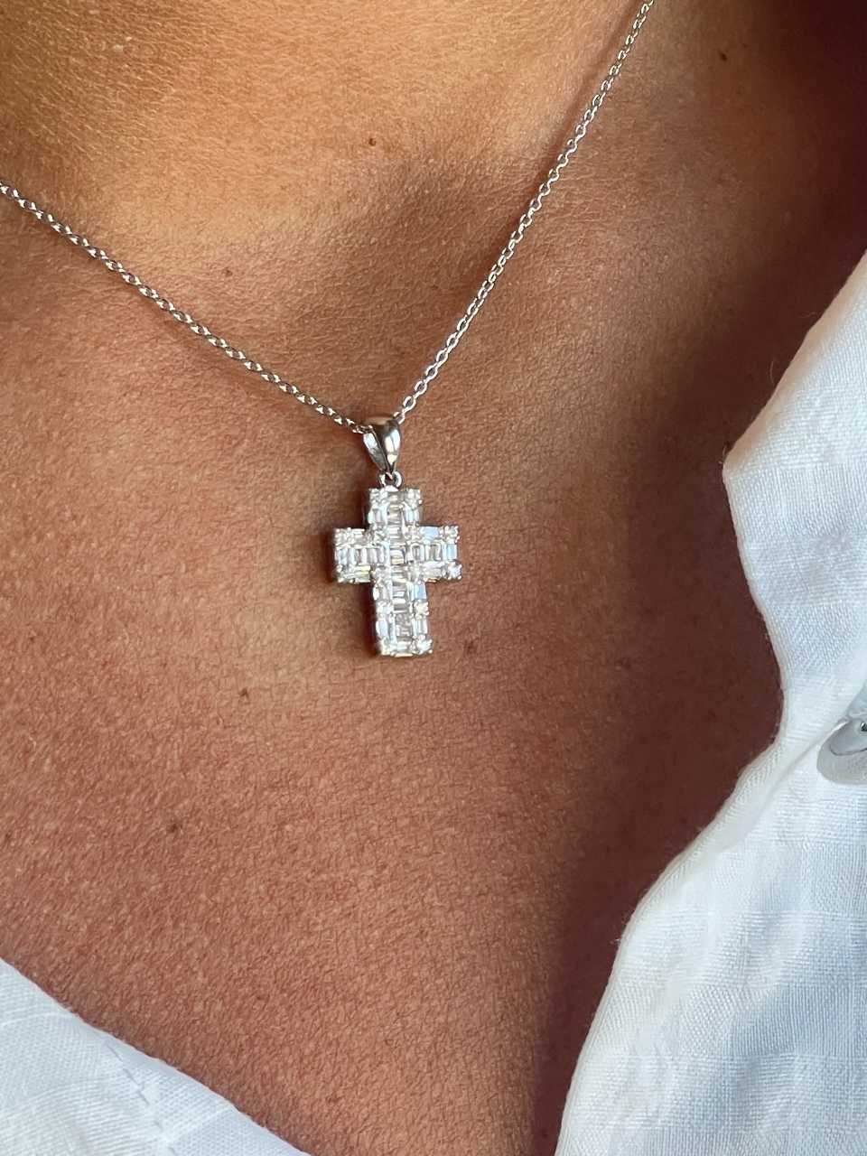 PARADA is a beautiful 18-karat white gold cross . Its design features tapestry and baguette stones in the center, surrounded by baguettes and diamonds. Ideal for everyday wear. The chain is not included in the price; see accessories.