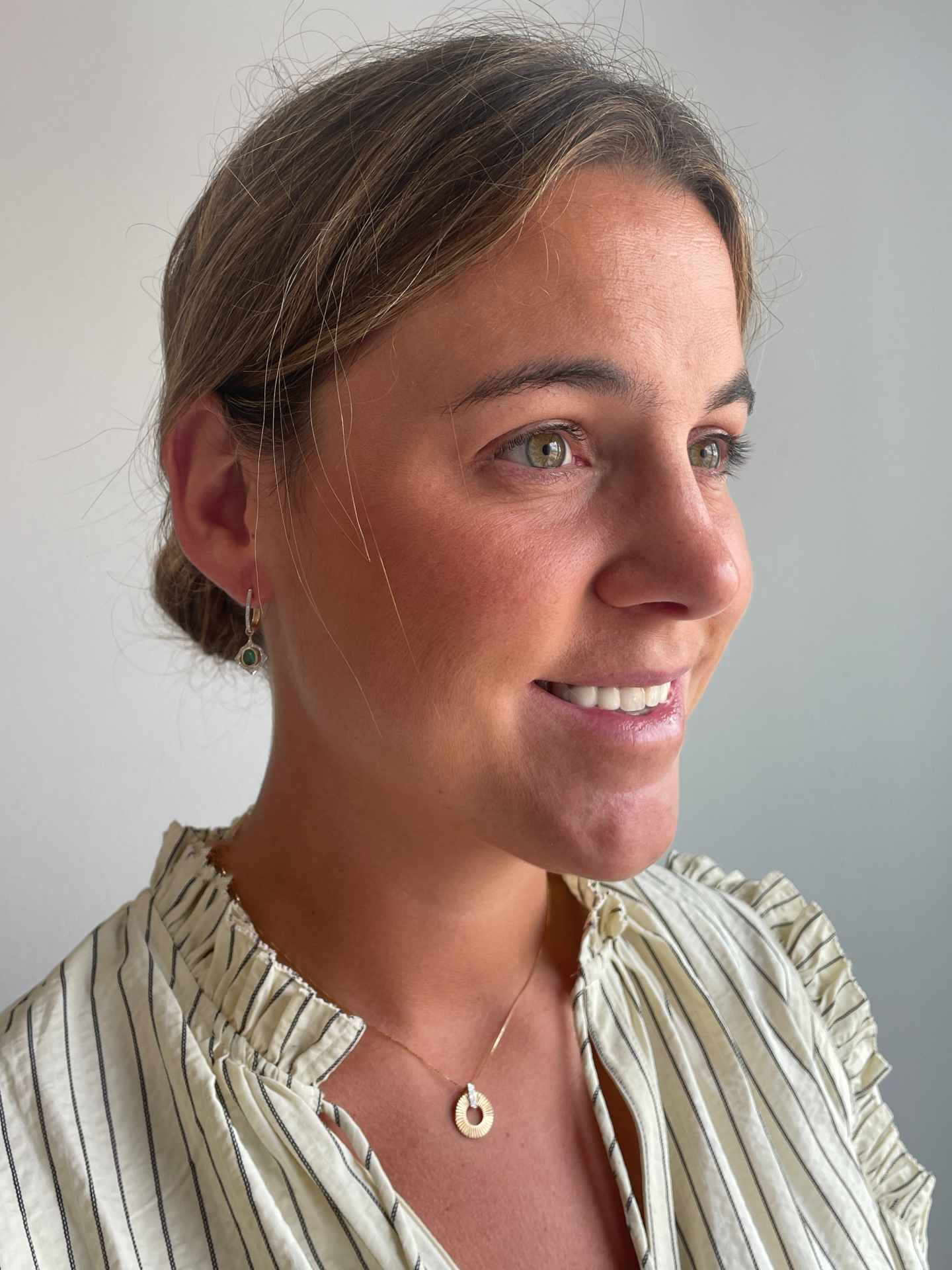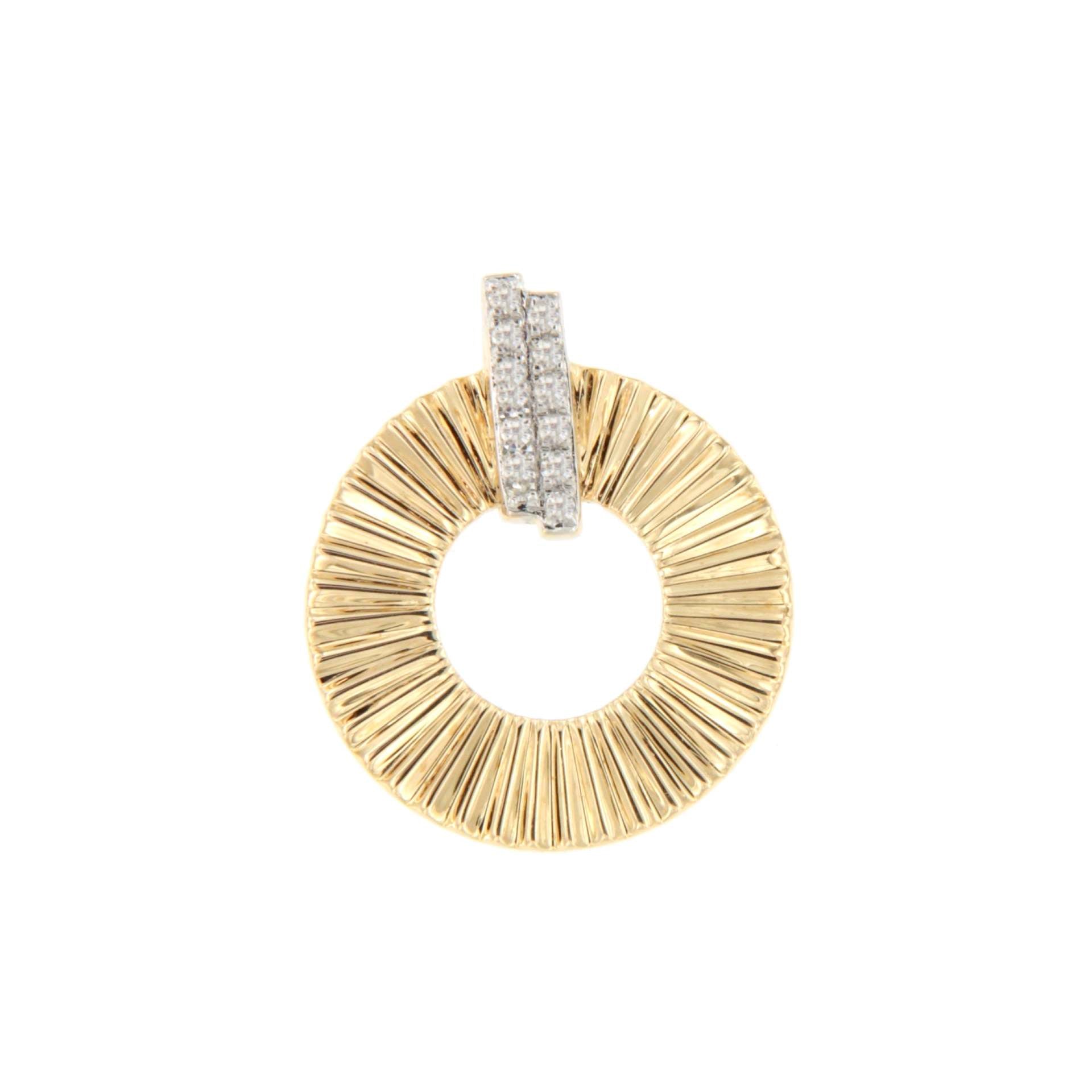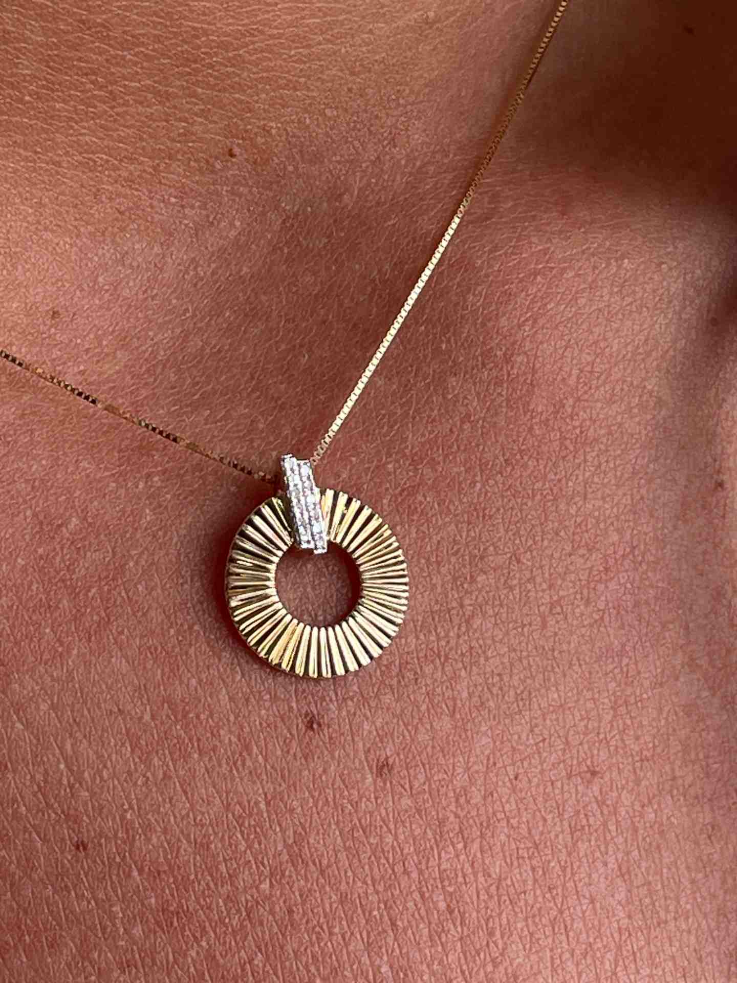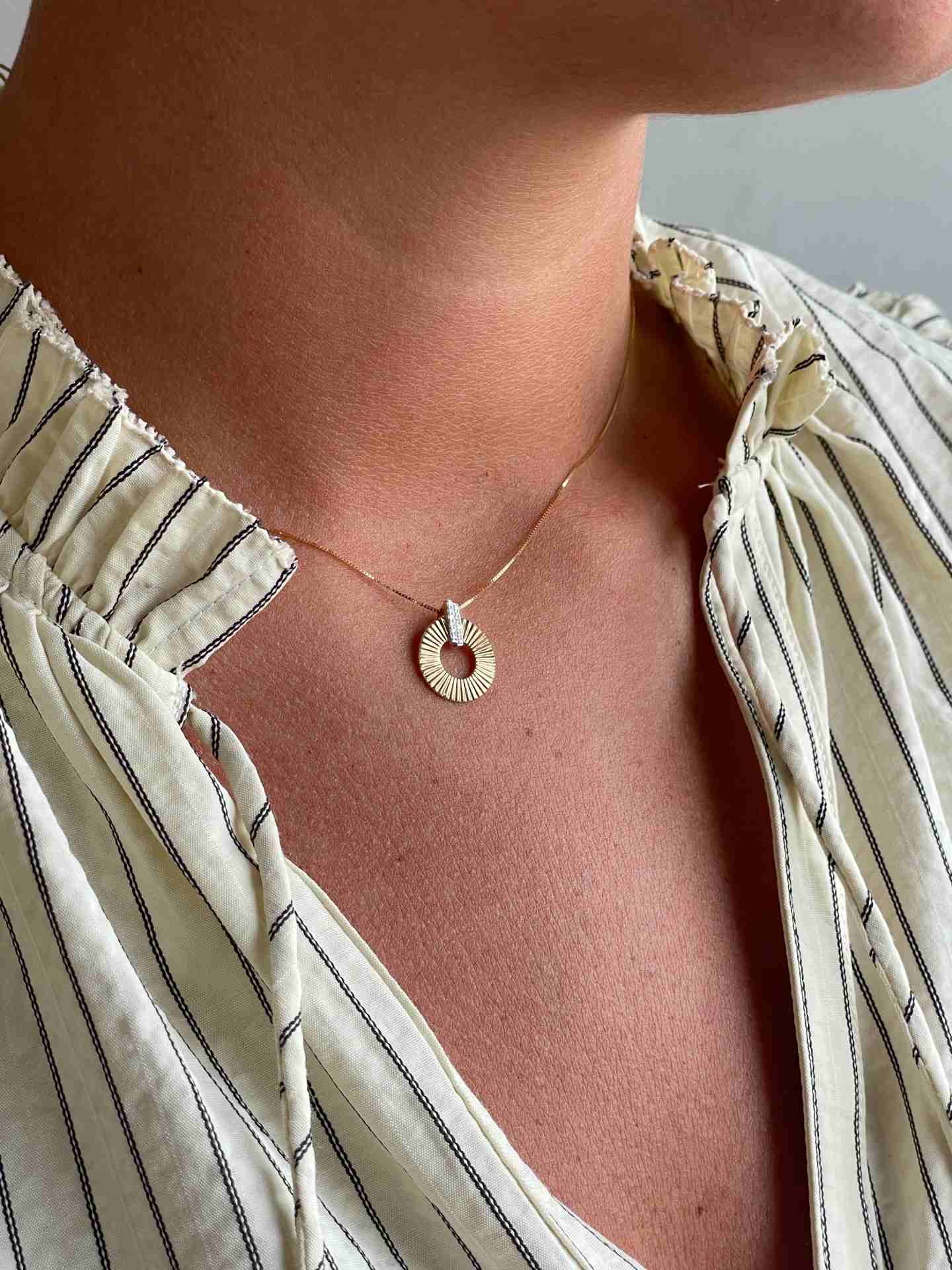 YALINA is a 14-karat yellow gold pendant with a circular design of radiant lines that capture the light with every movement.