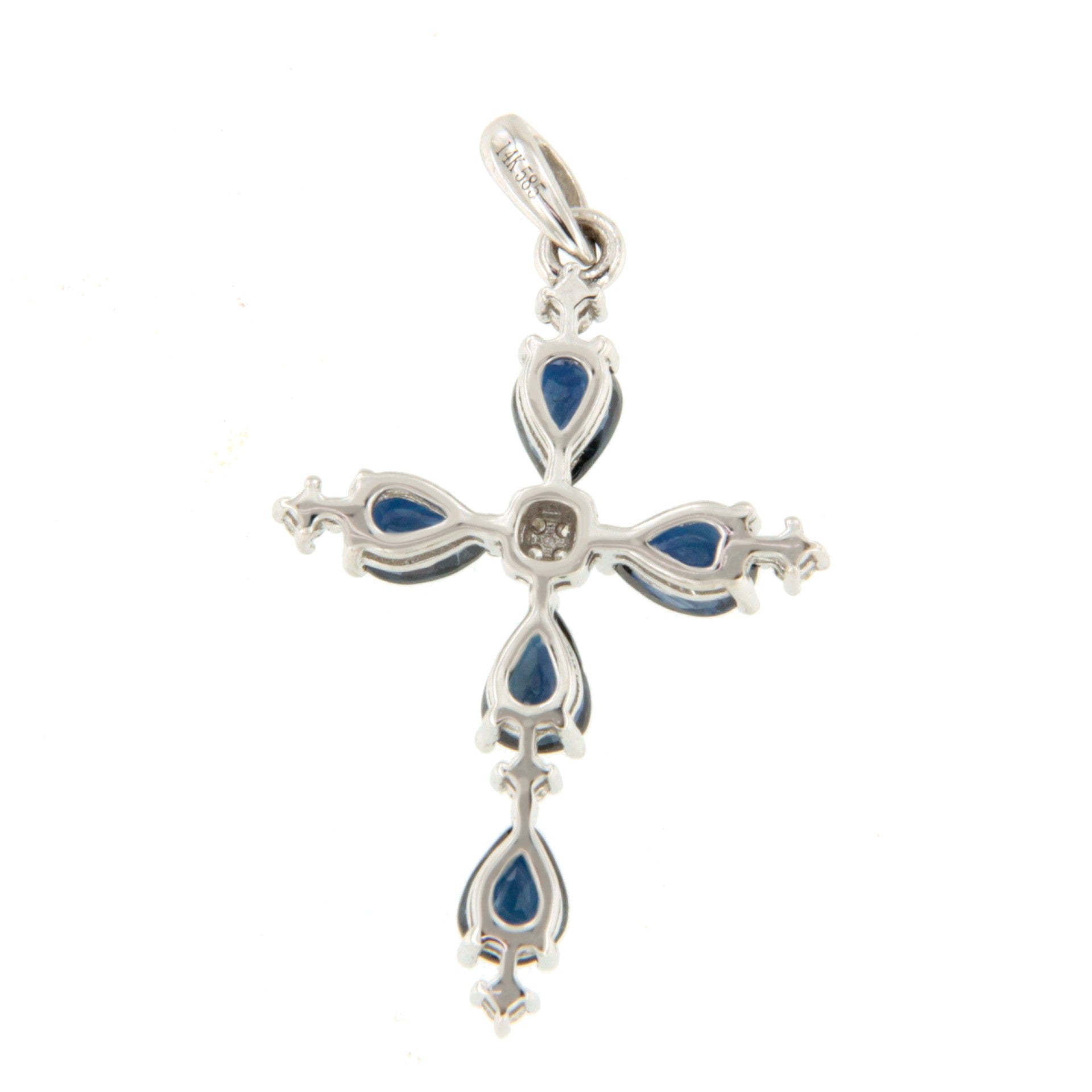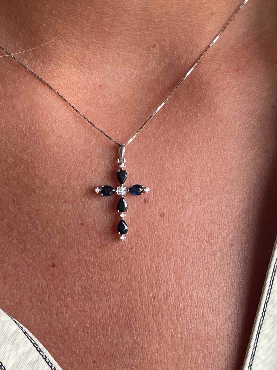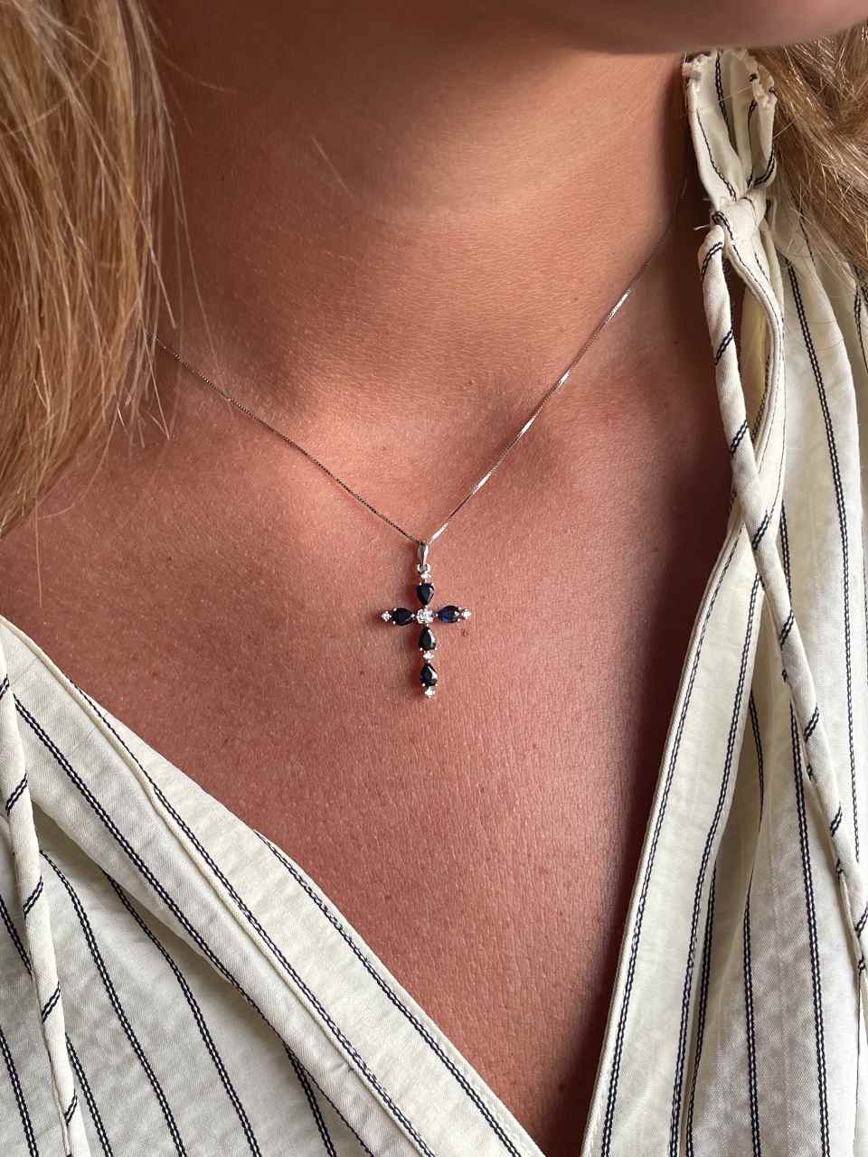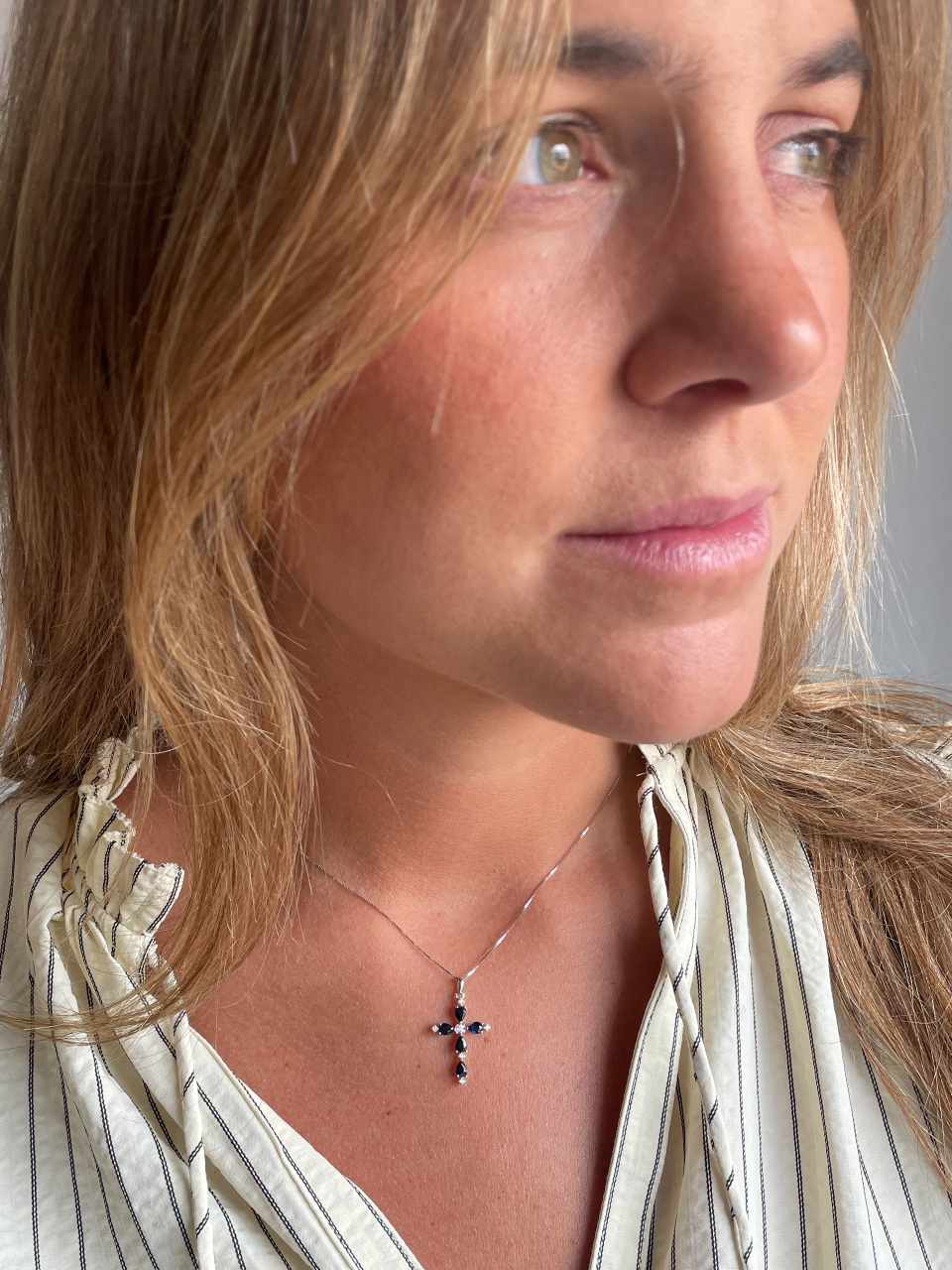 ZARELA is a delicate cross crafted in 14-karat gold. Its elegant design combines teardrop-shaped gems with small diamonds that add light and harmony.