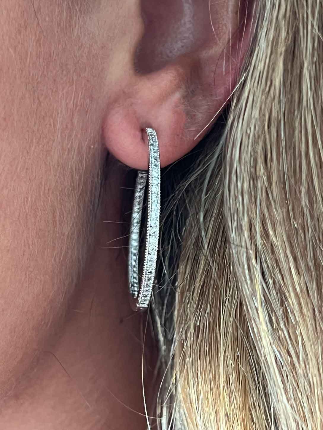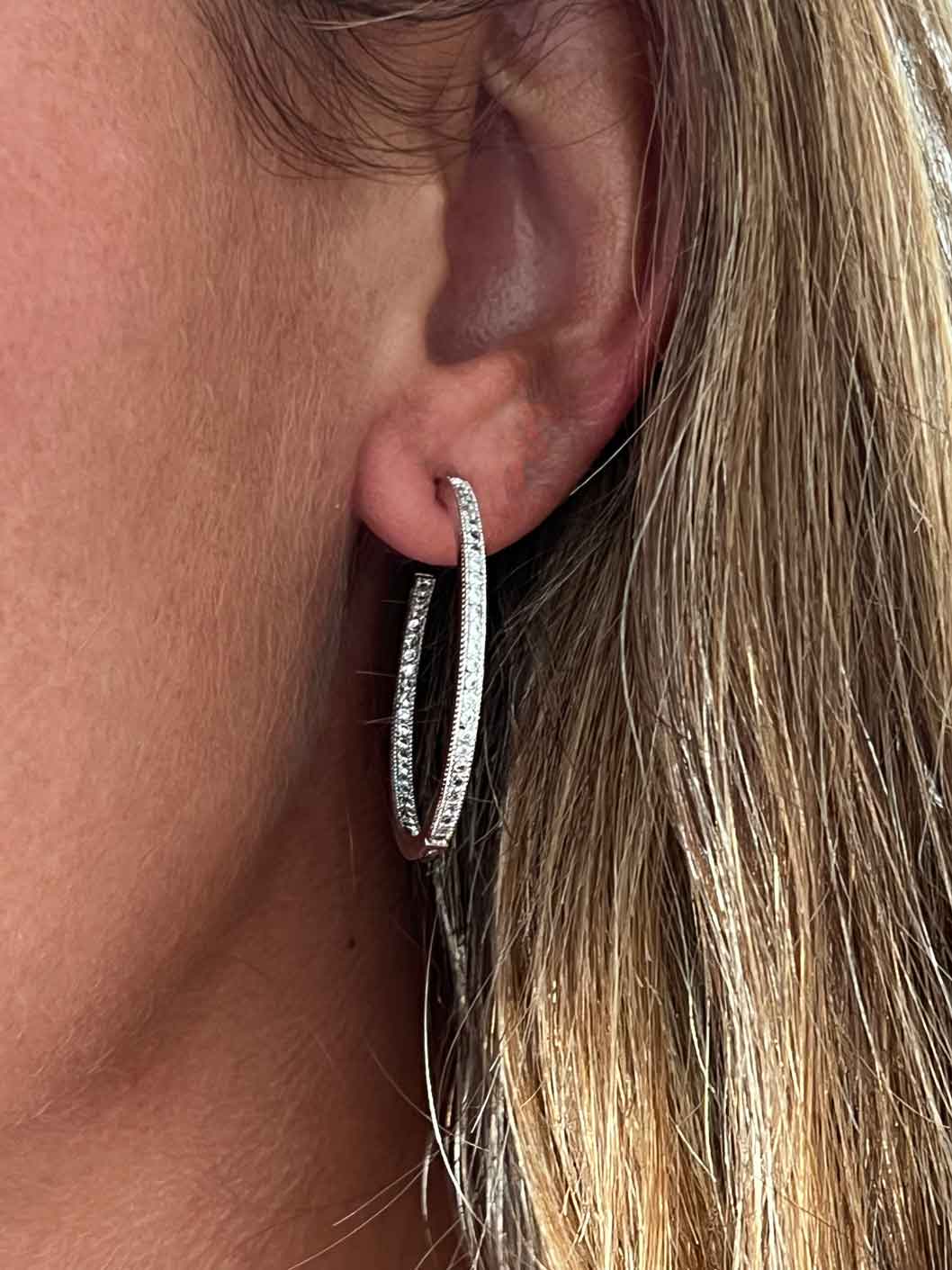 Large rhodium-plated sterling silver hoop earrings with a row of cubic zirconia stones set throughout. They measure 3.5 cm in diameter.