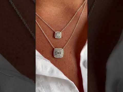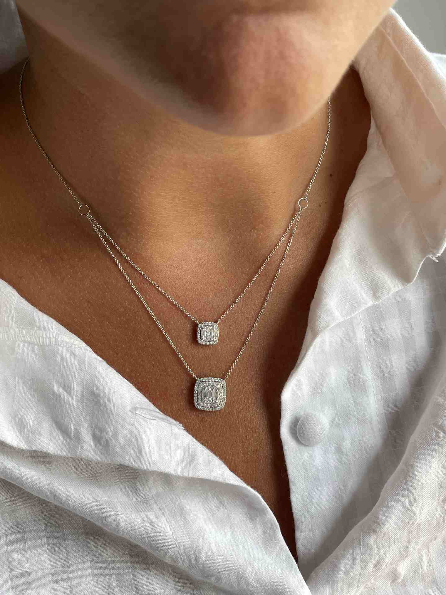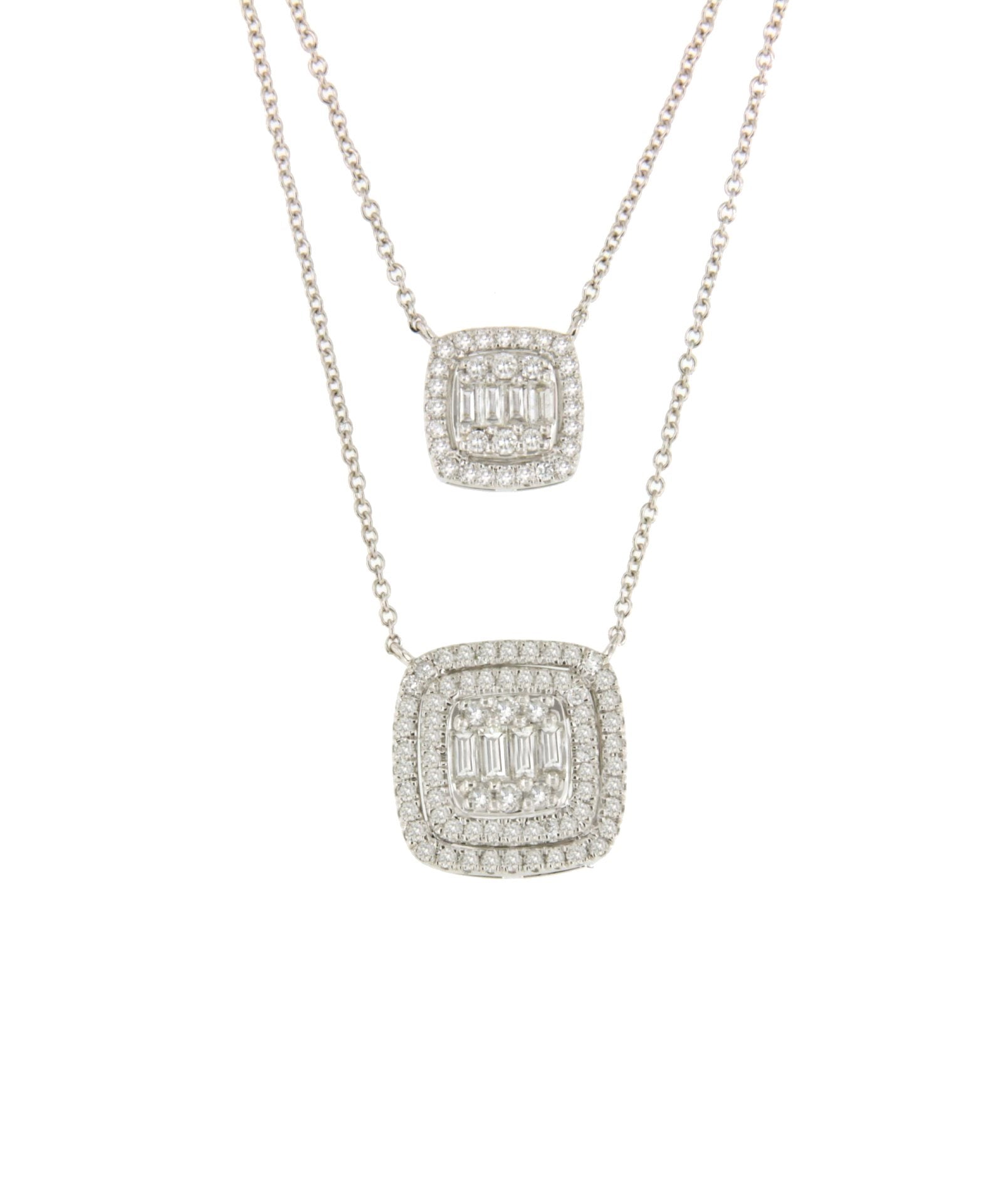 DIJON is a double chain with 2 pendants of different sizes in baguette cut diamonds and brilliants surrounded by borders also in brilliants and made in 18k white gold.