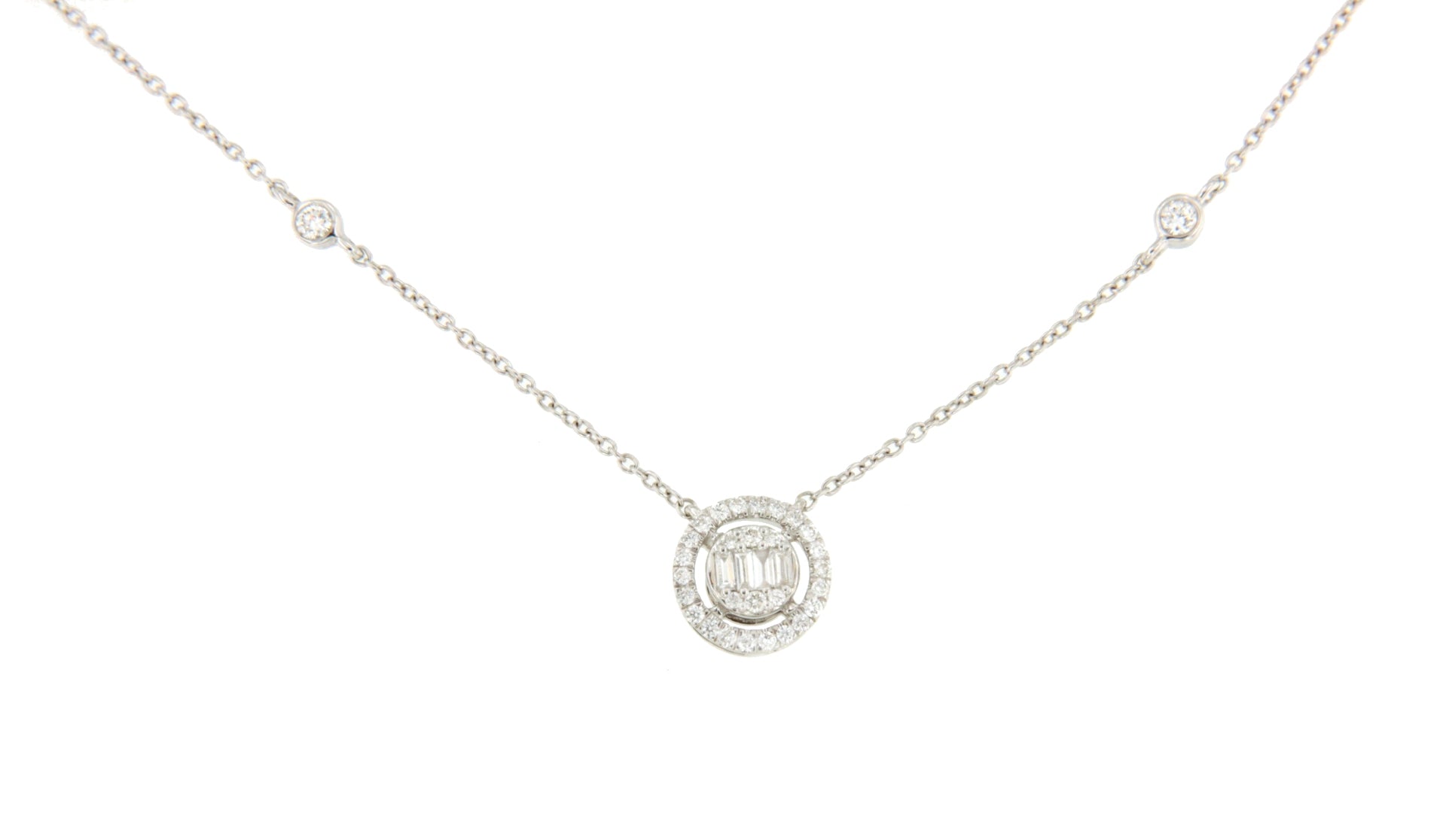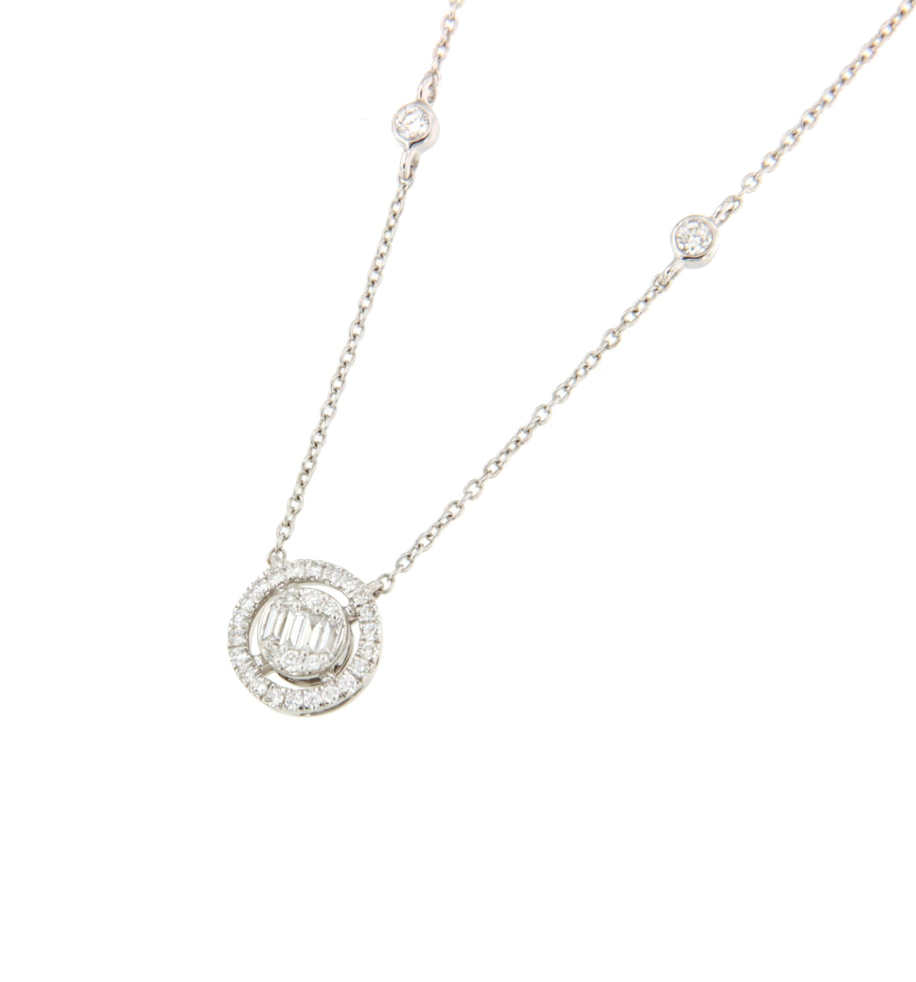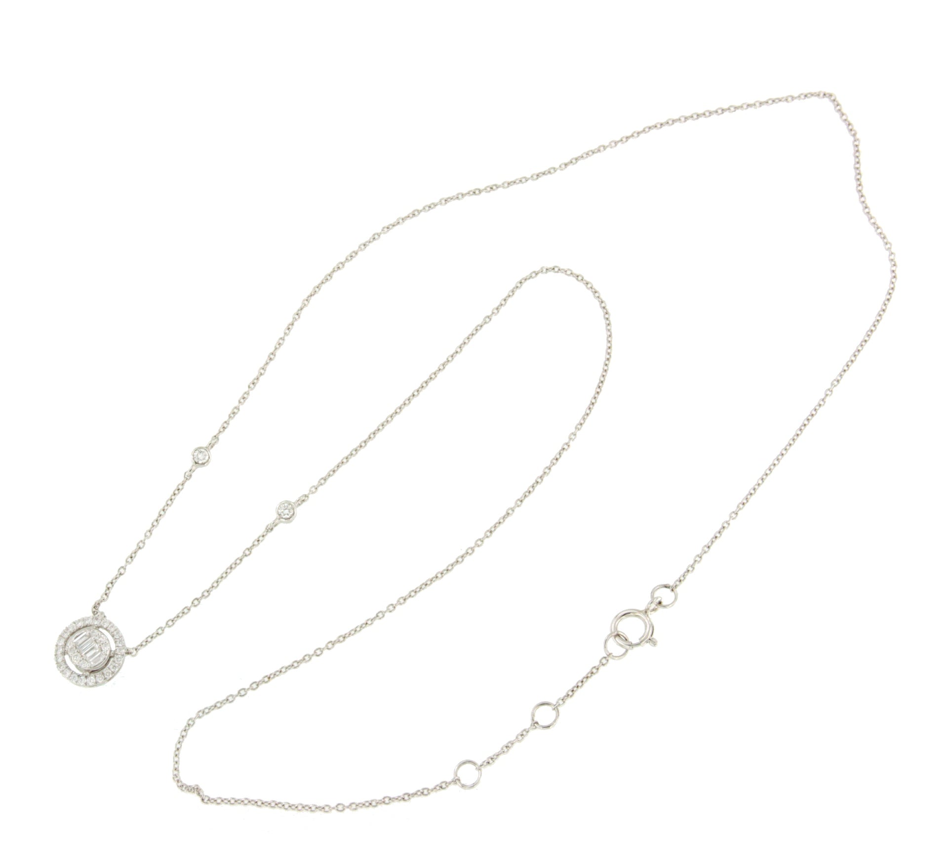 OULU is a delicate choker with a chain and two diamonds, from which hangs a round centerpiece with baguette stones and diamonds . It is crafted in 18k white gold and has a very contemporary design.
