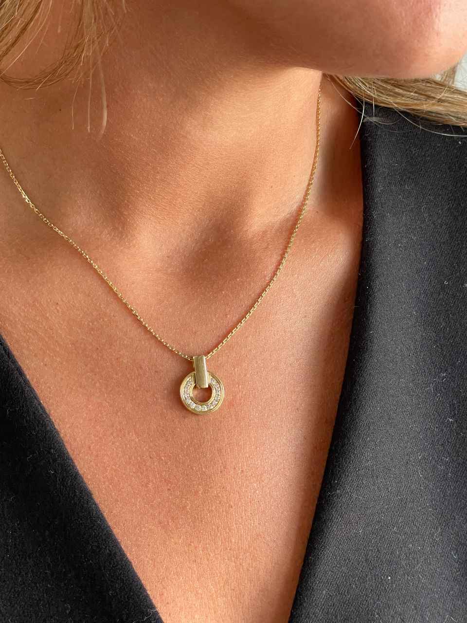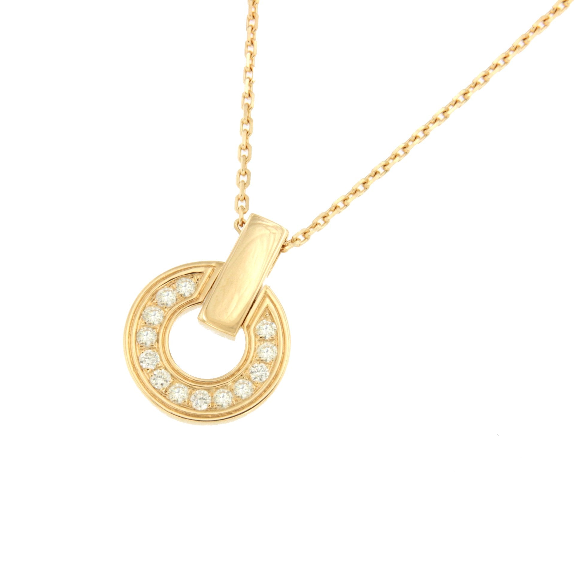 POMELO is a choker with a pendant hanging from a chain. It has a smooth clasp with a diamond disc inside. It is made of 18-karat yellow gold .