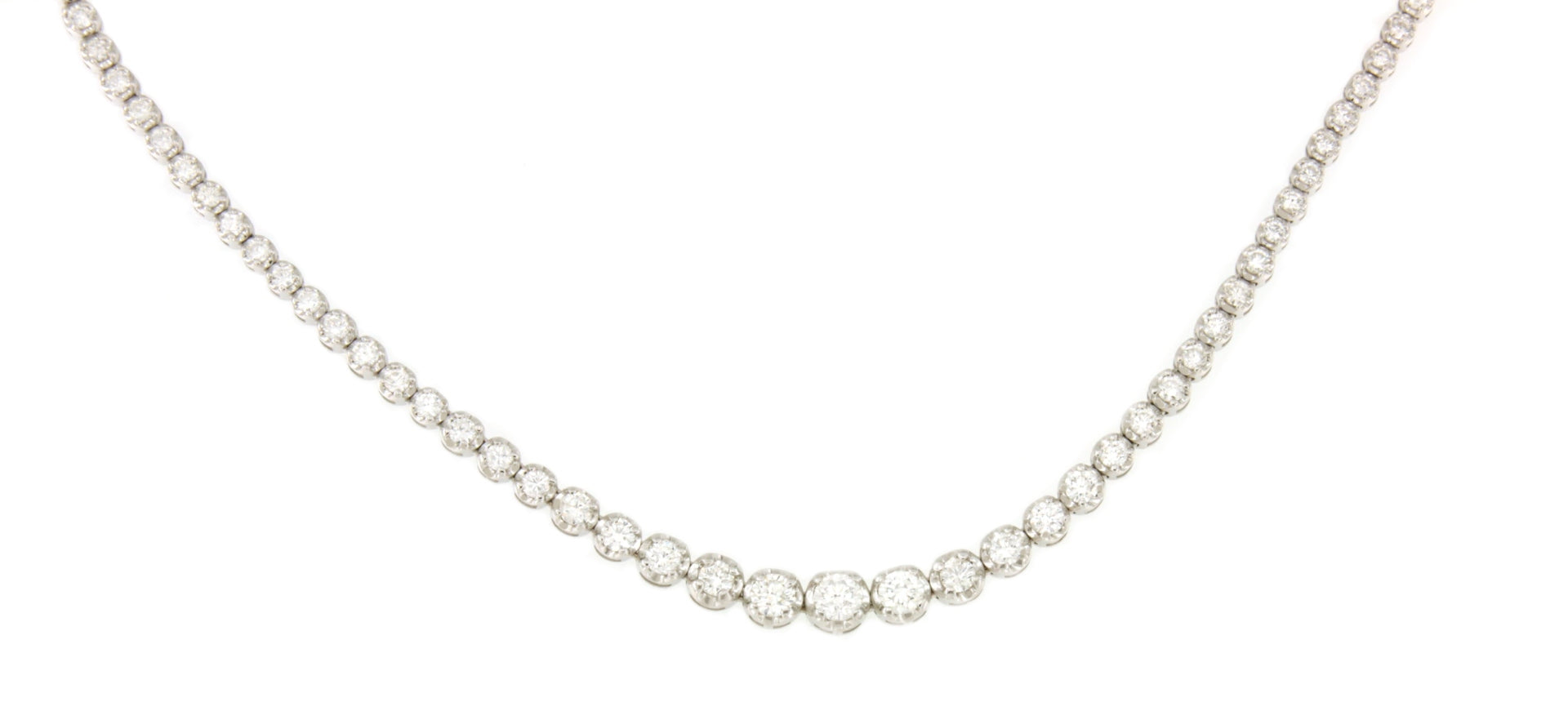 TROYES is a beautiful and elegant riviere of diamonds set with an illusion view that enhances them and all mounted in 18k white gold in diminishing increments .