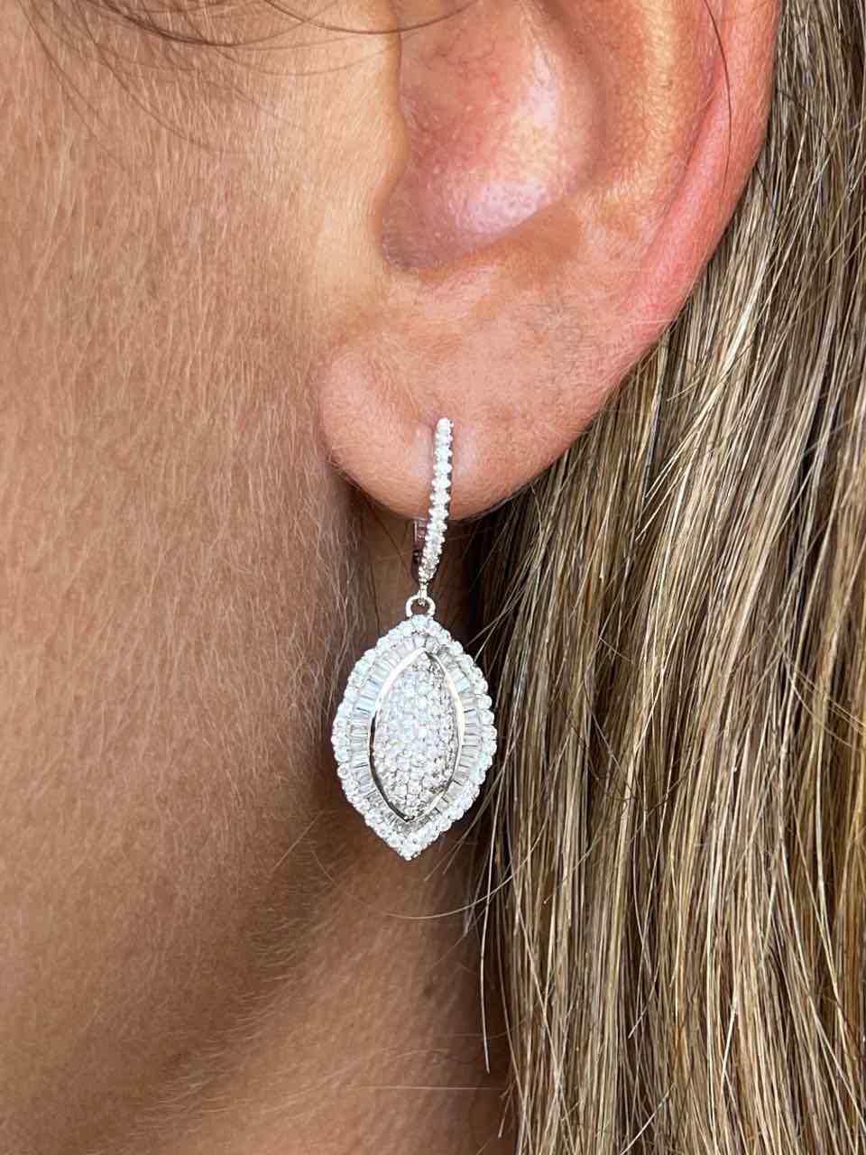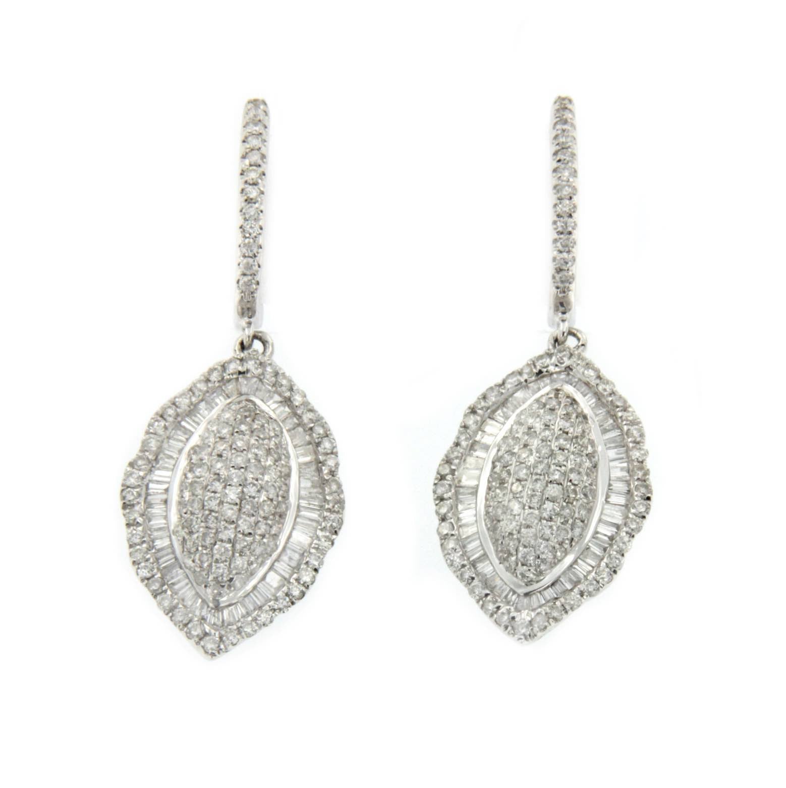 18kt white gold earrings with 225 brilliant cut diamonds of 0.93 cts and 80 baguette cut diamonds of 0.53 cts.