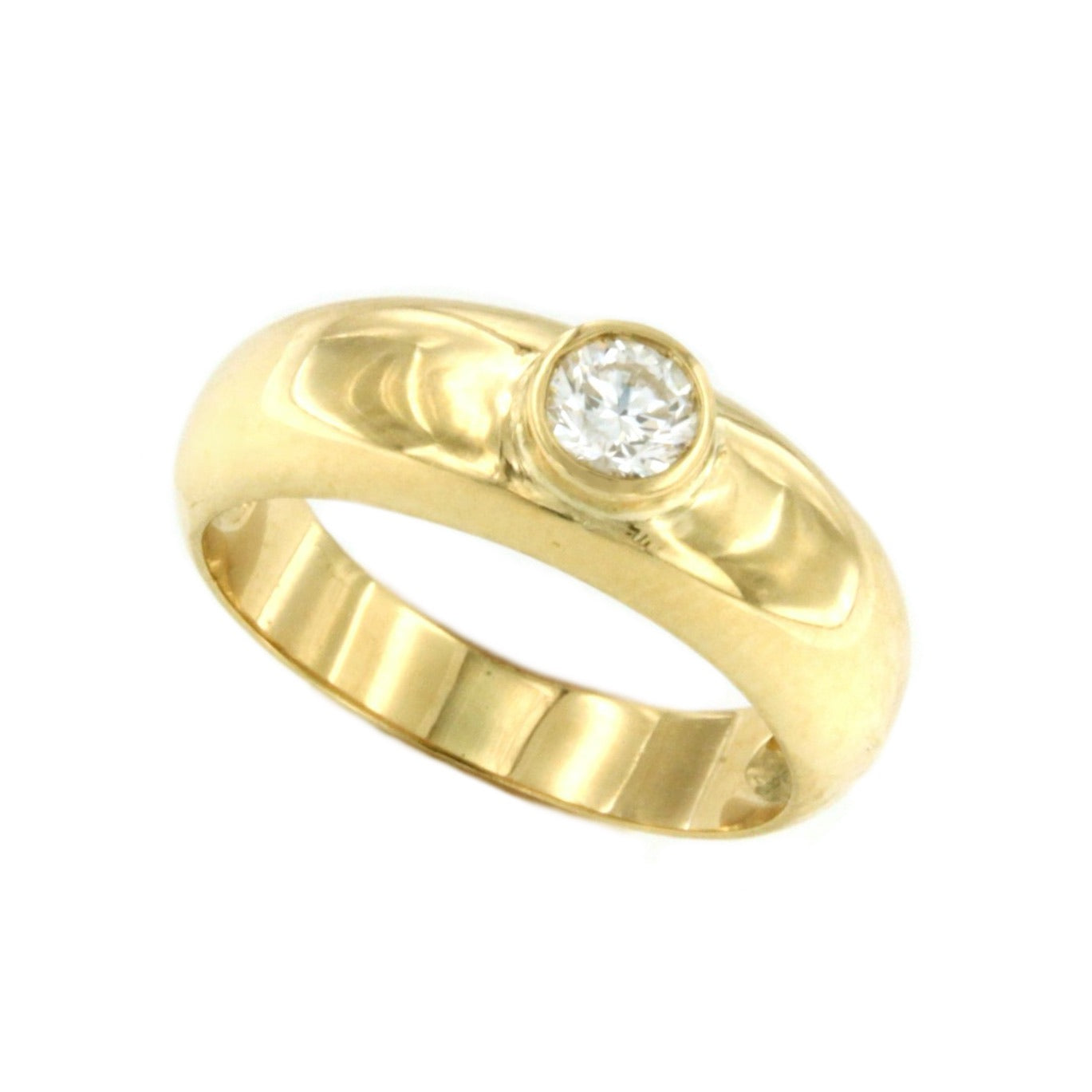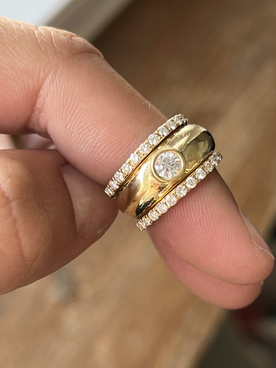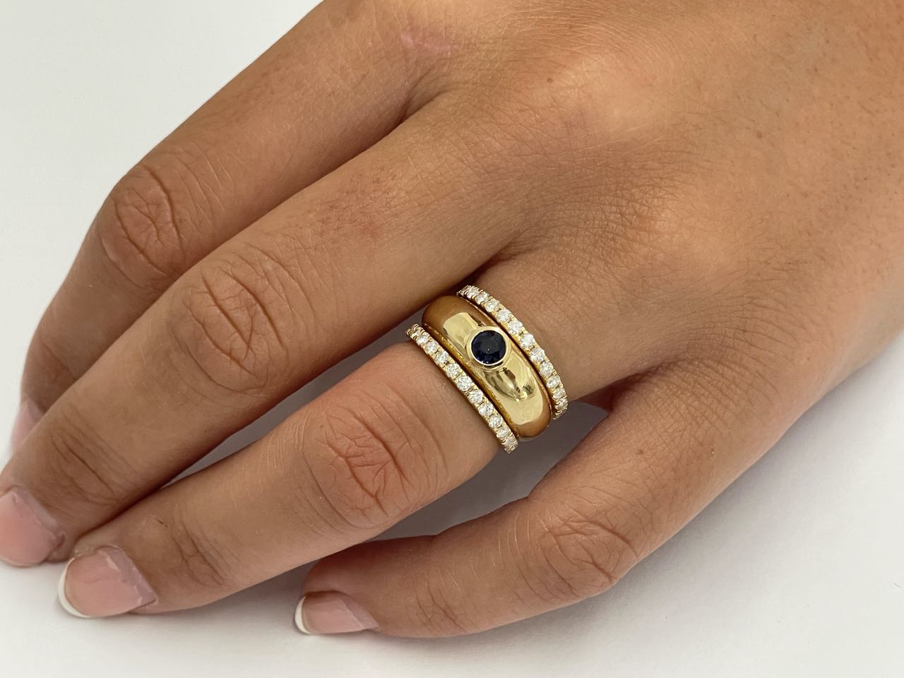 LEMOS is an 18-karat yellow gold ring, also available in white gold, with a central nozzle for a diamond or sapphire, which can be complemented with diamond bands on both sides as an accessory.