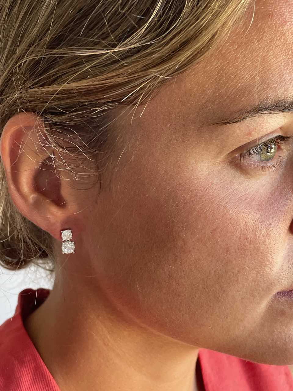 ALCANTARA earrings feature two rosettes of diamonds of different sizes set in 18-karat white gold, with a dynamic and dynamic design. Their design mimics diamonds with four prongs at the ends.