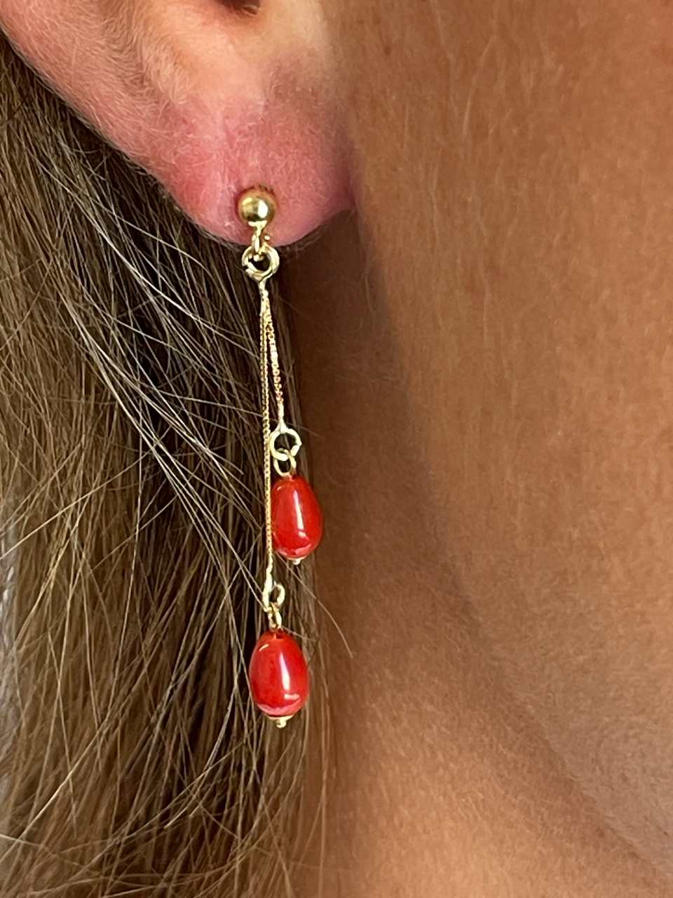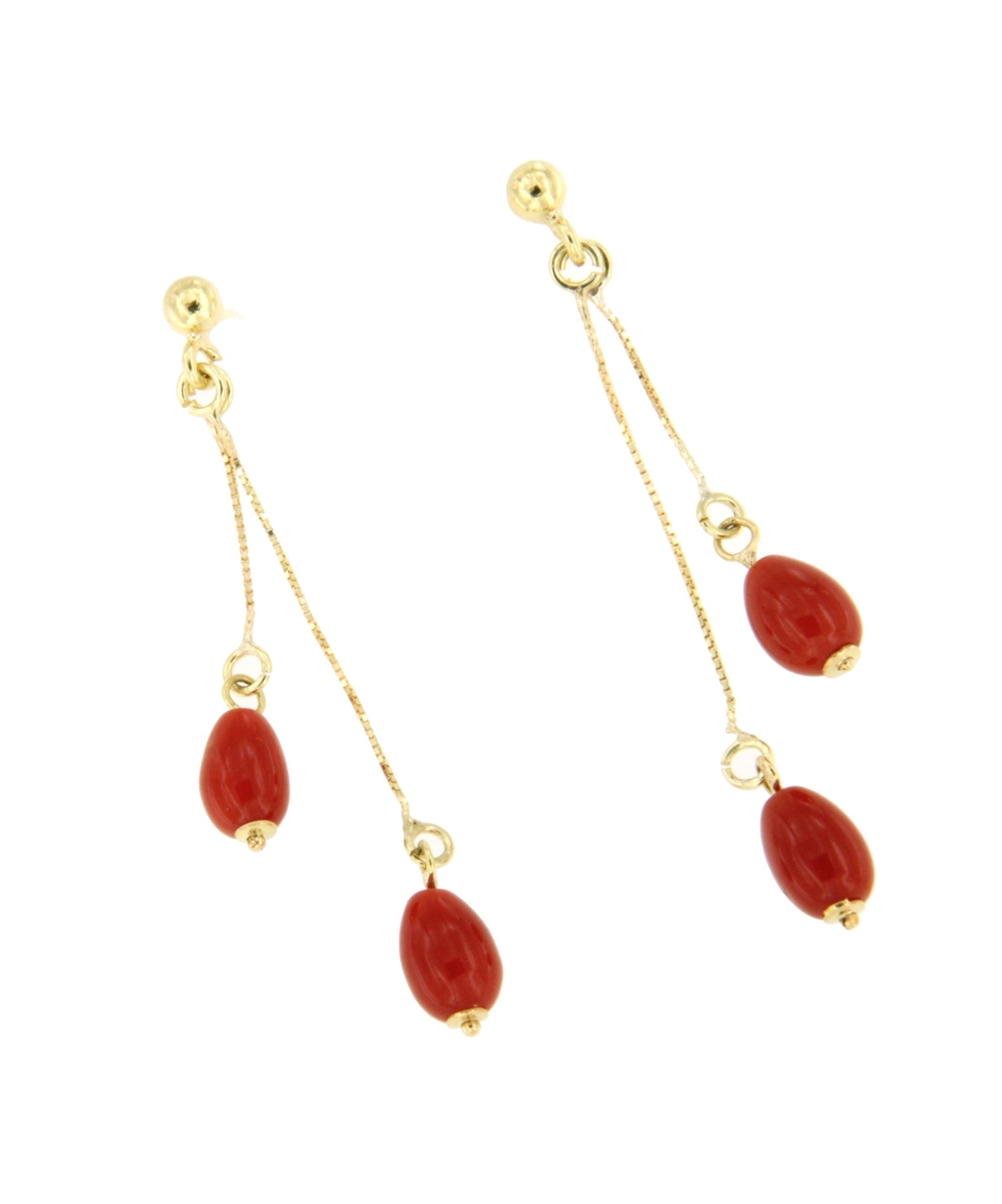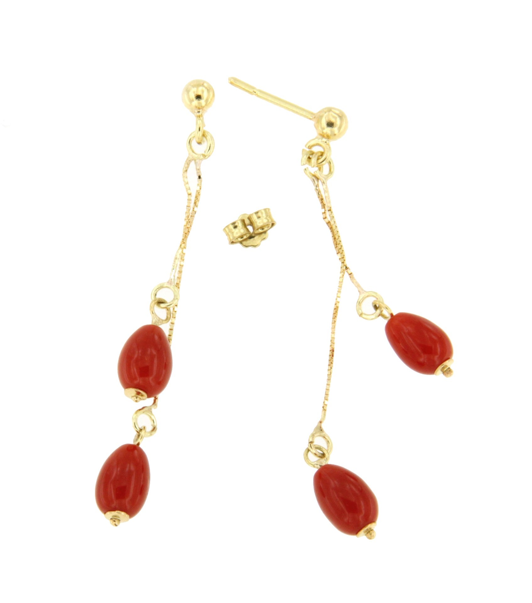 AMBU is a coral earring set in 18-karat yellow gold . Its design features a small gold ball from which two delicate chains hang , each adorned with a coral pear at a different height . Exquisite!