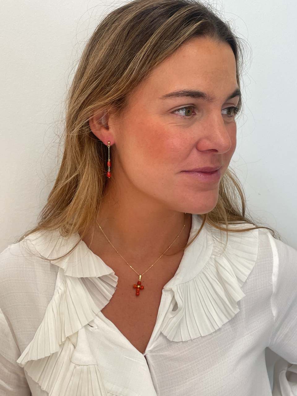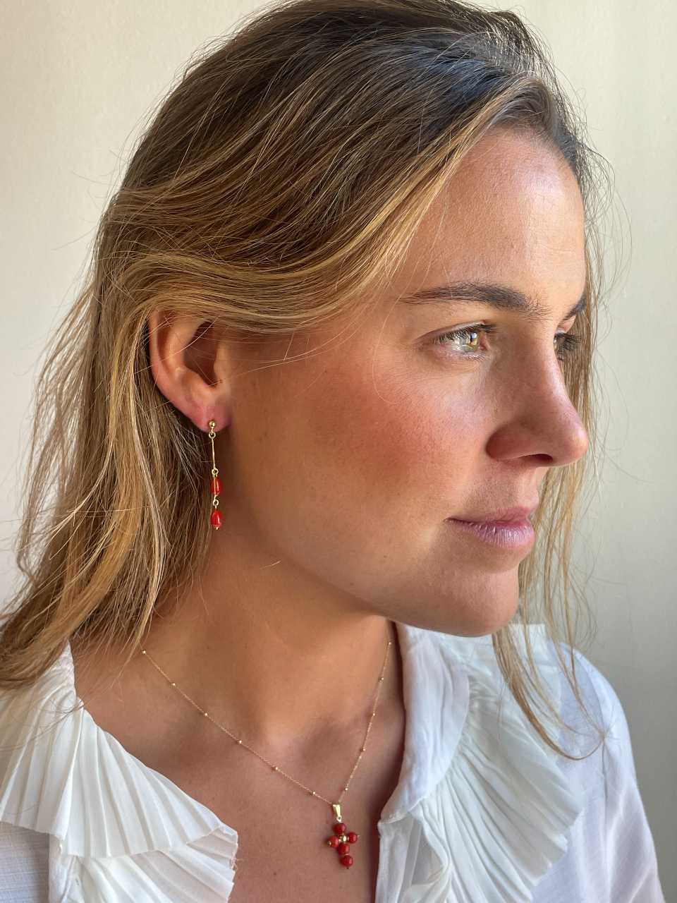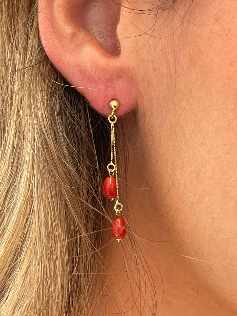 AMBU is a coral earring set in 18-karat yellow gold . Its design features a small gold ball from which two delicate chains hang , each adorned with a coral pear at a different height . Exquisite!