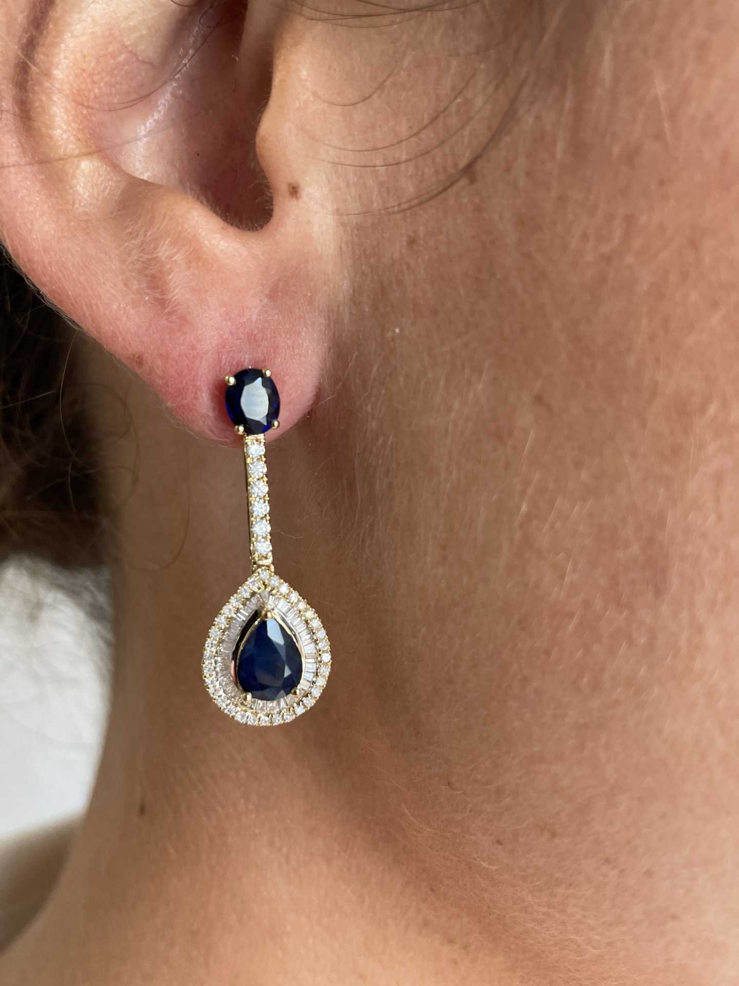 BOSTON are long earrings in 18-karat yellow gold mounted with pear-shaped and oval sapphires surrounded by taupes and diamonds.