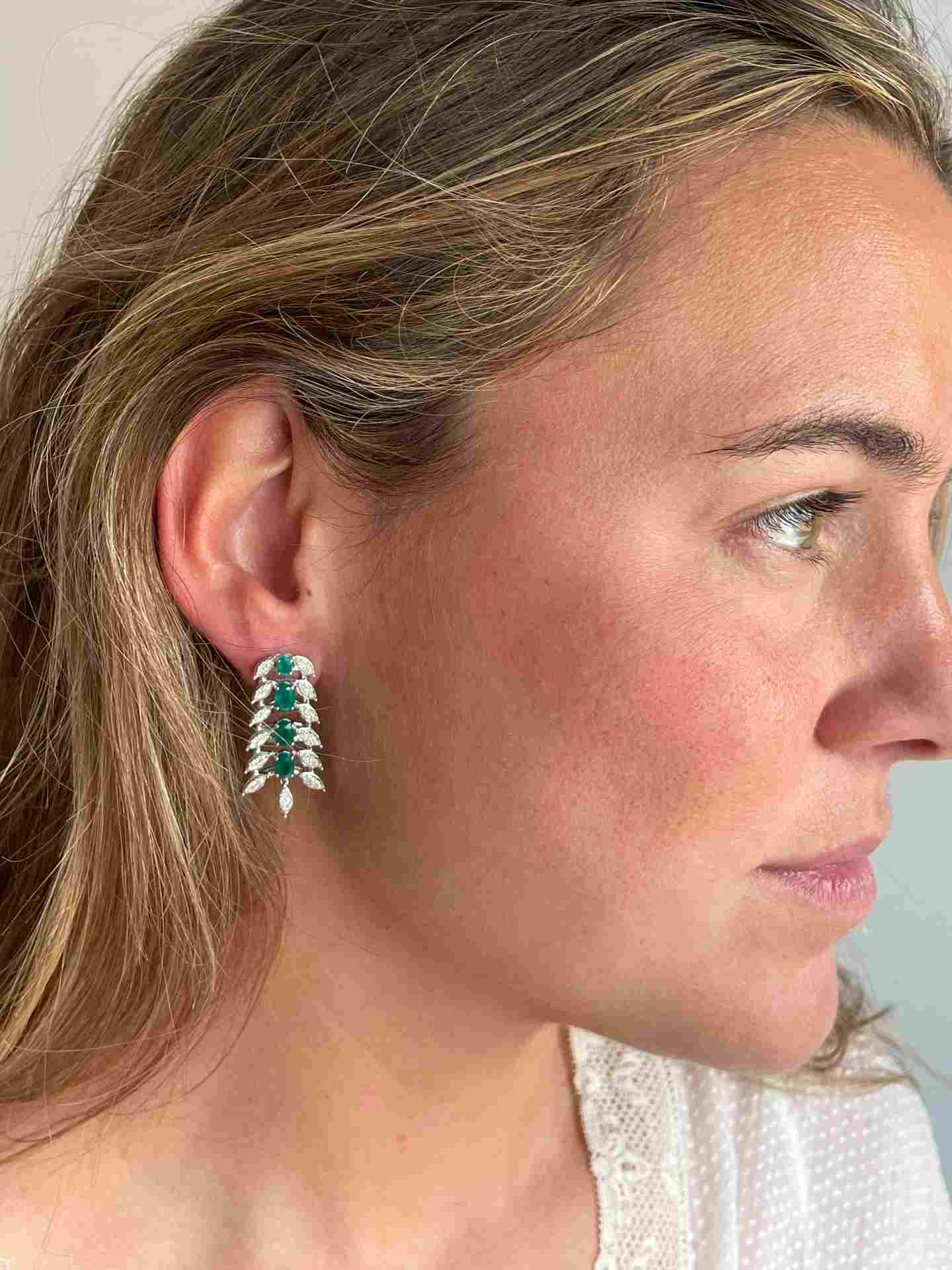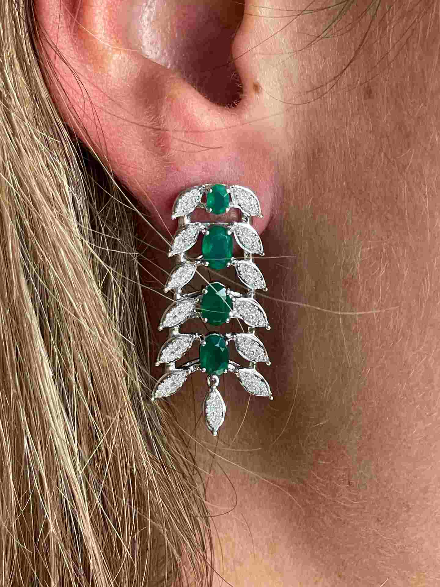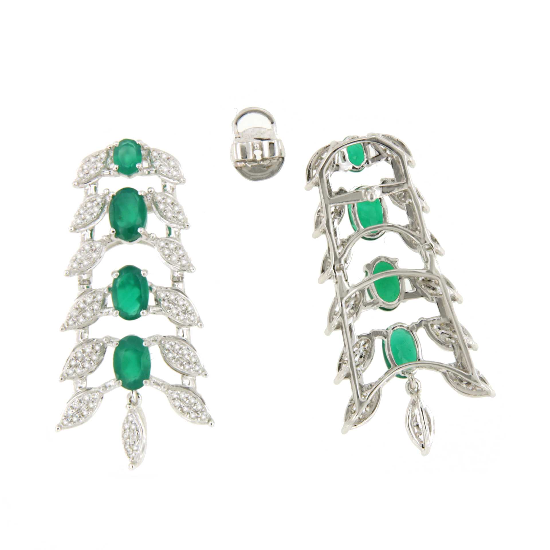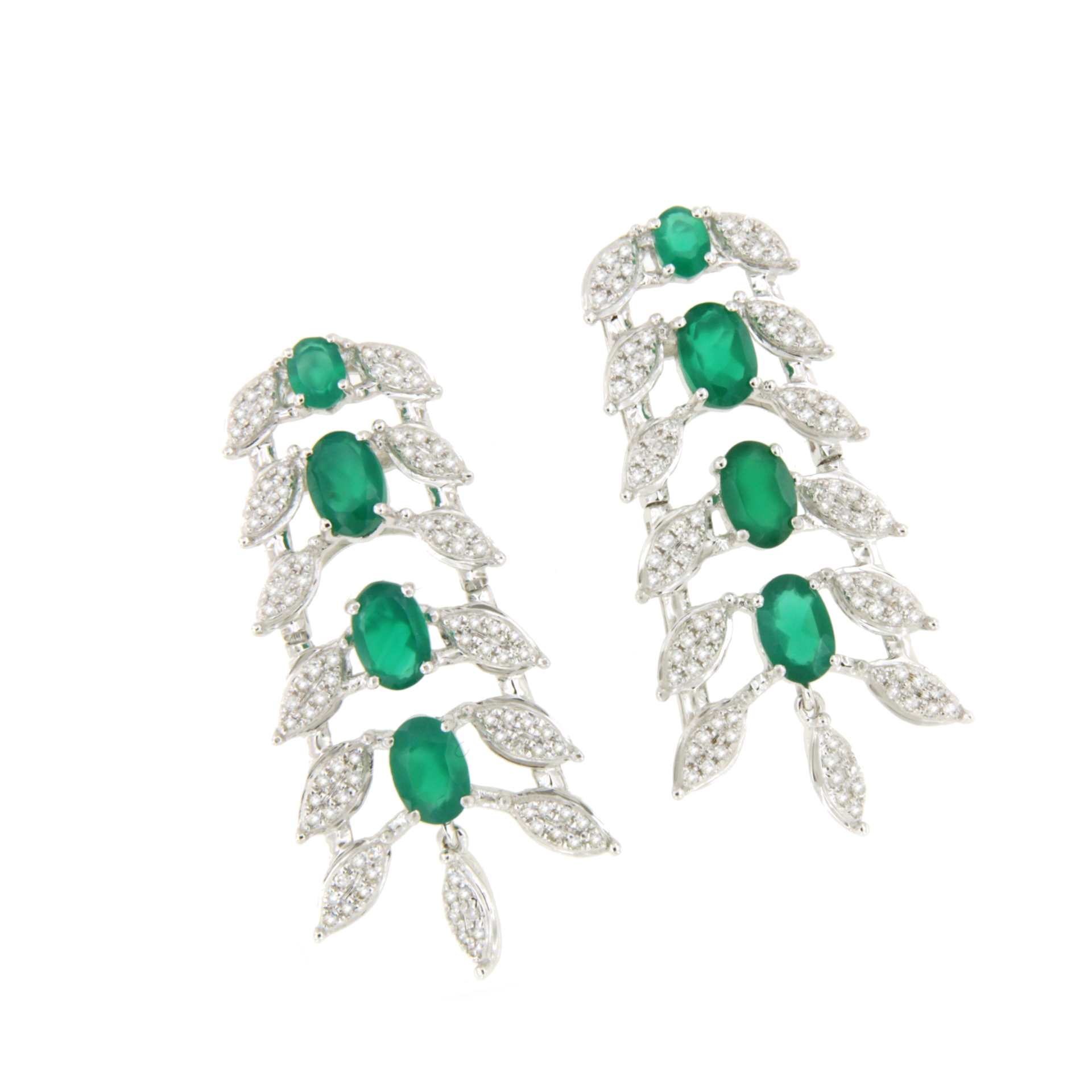CASCABEL is a very flattering earring , made in 18-karat white gold with diamonds and long emerald-colored green onyx .