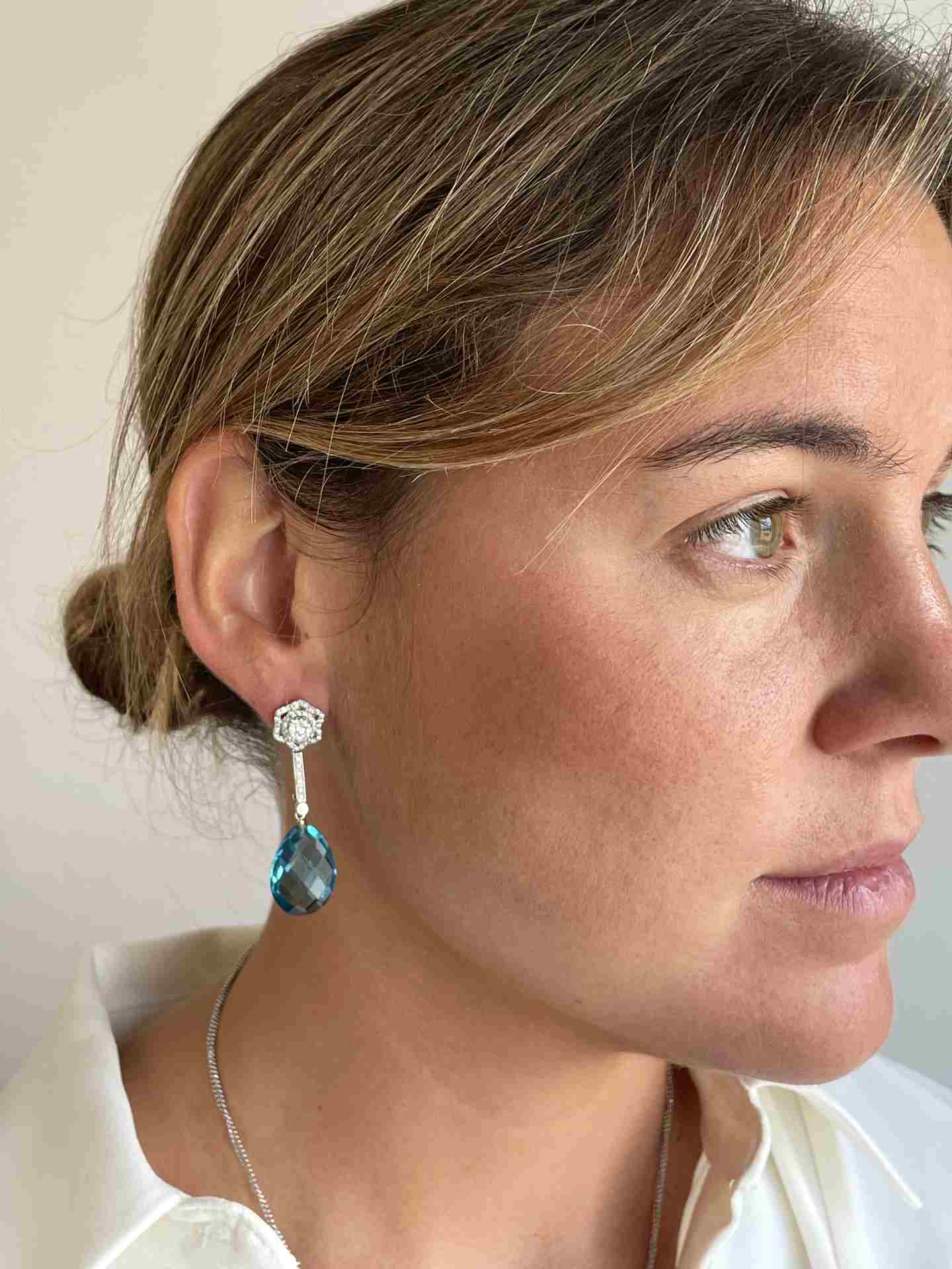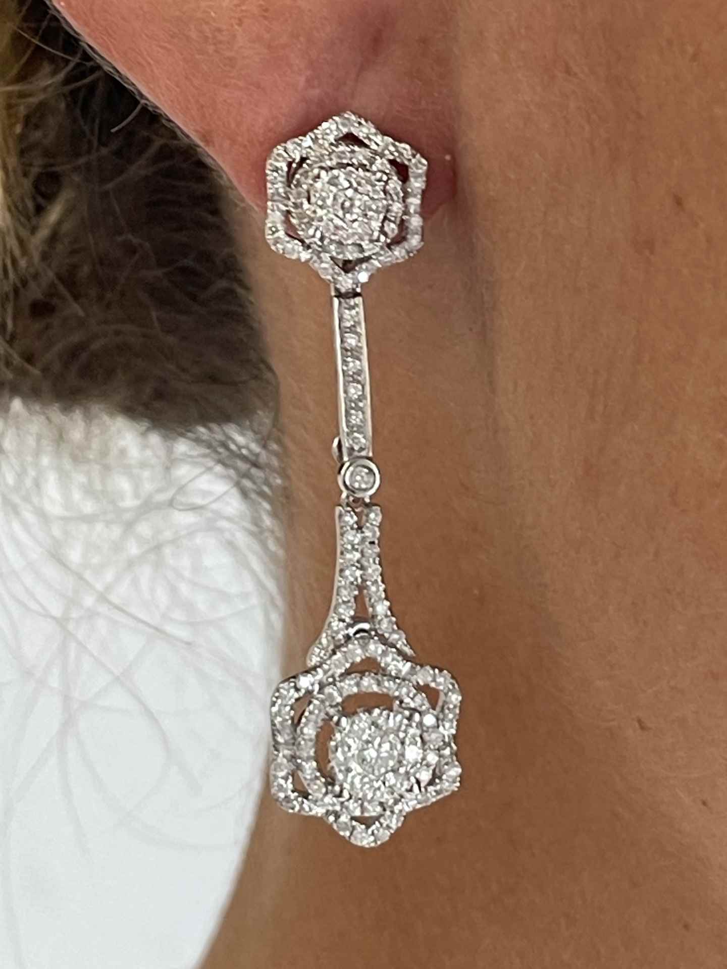 CELIA are detachable diamond earrings in 18-karat white gold . They consist of two flower-shaped rosettes that hang from a double row of diamonds.