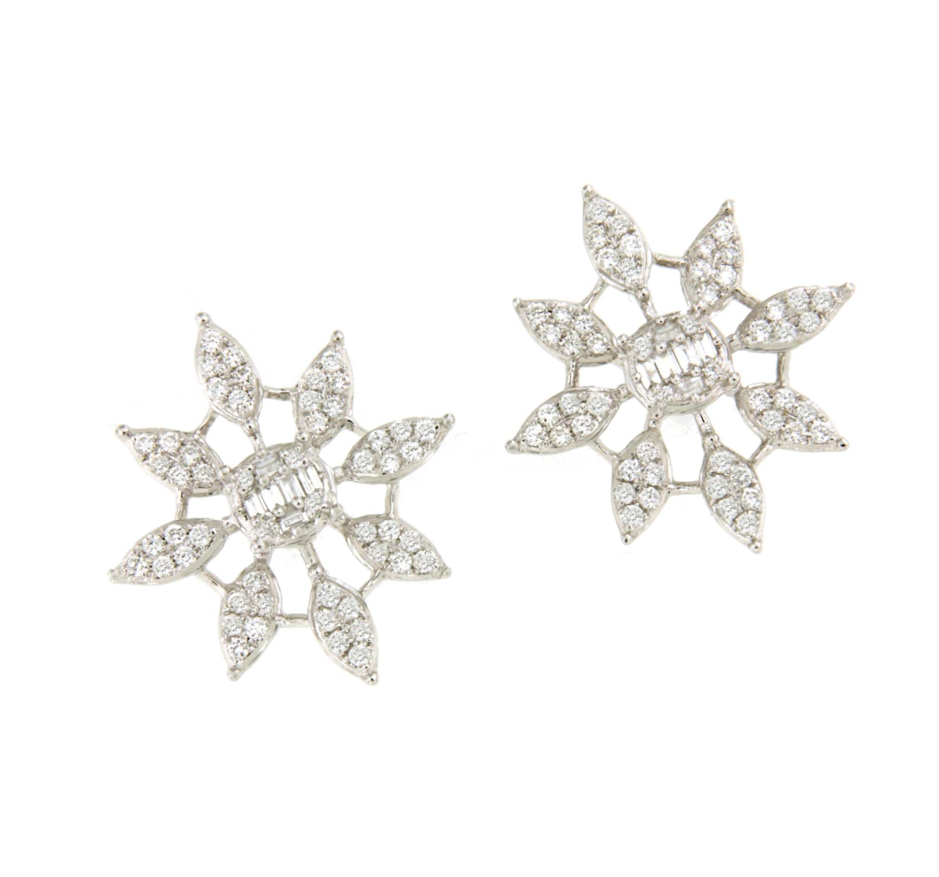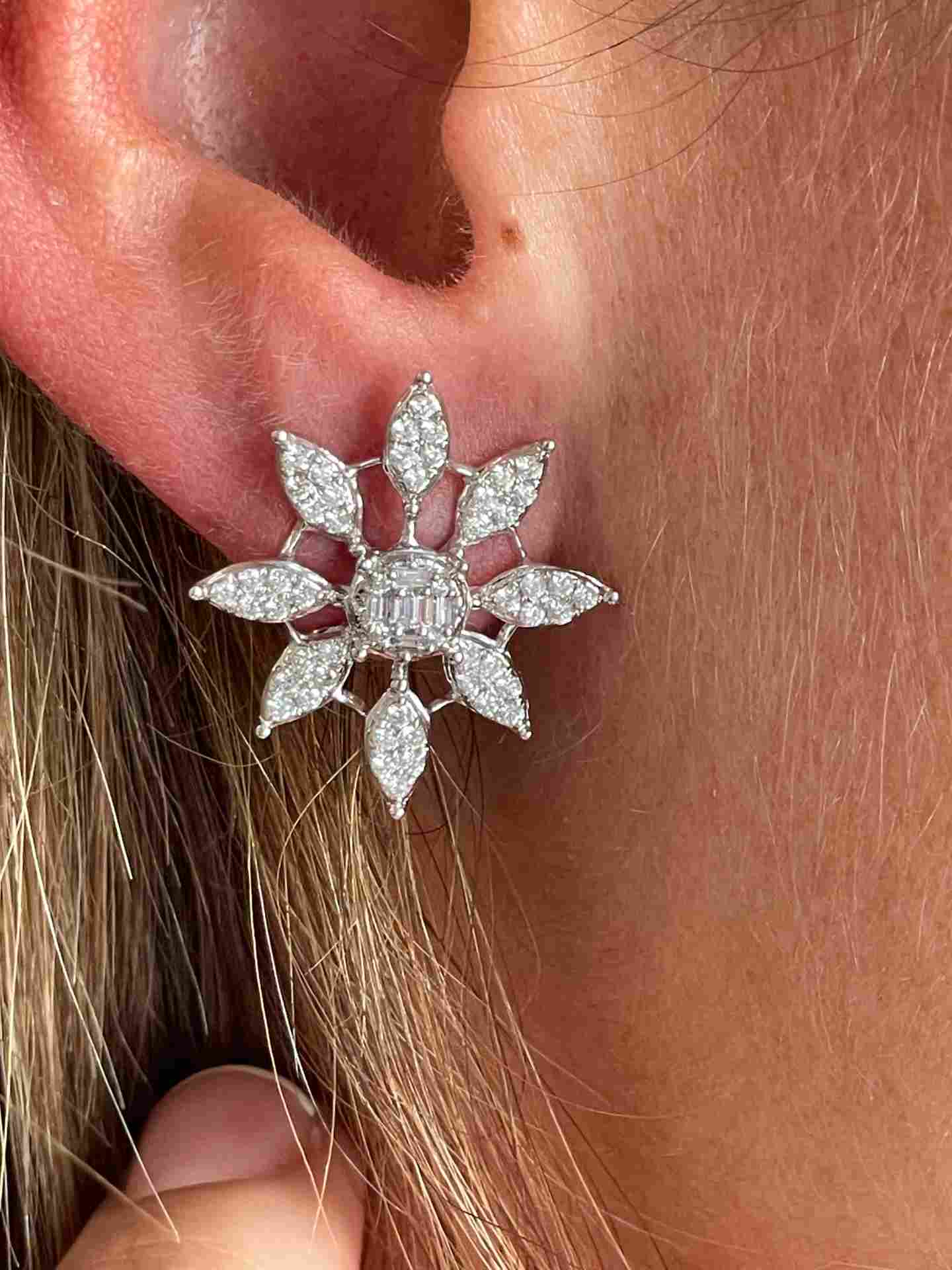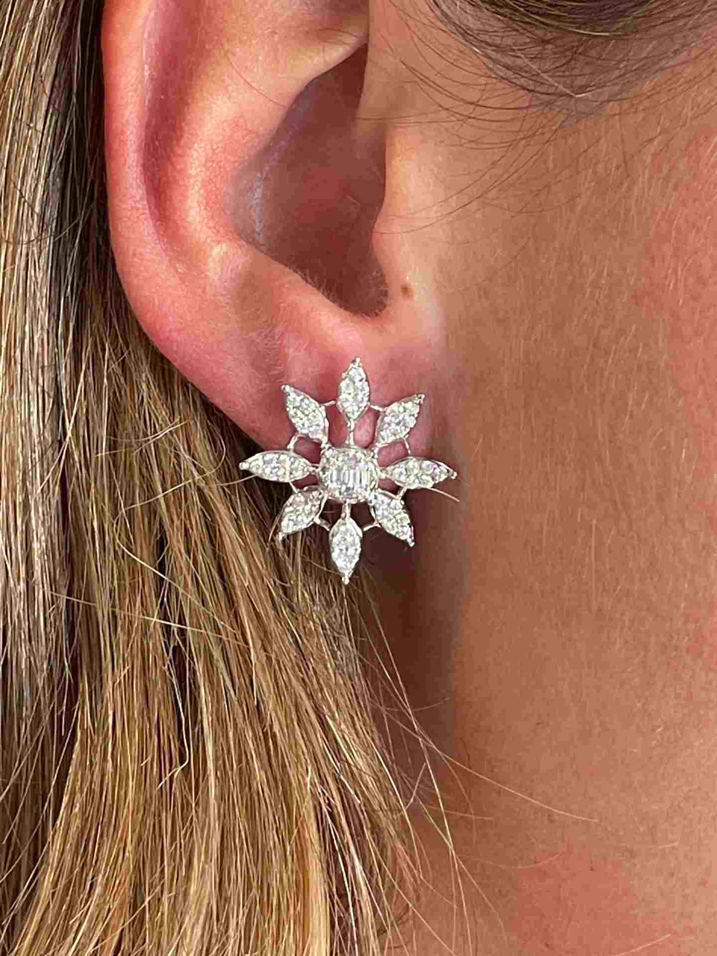 CLARINERO is a super flattering earring that exudes style, made in 18-karat white gold with baguette-cut diamonds and brilliants.