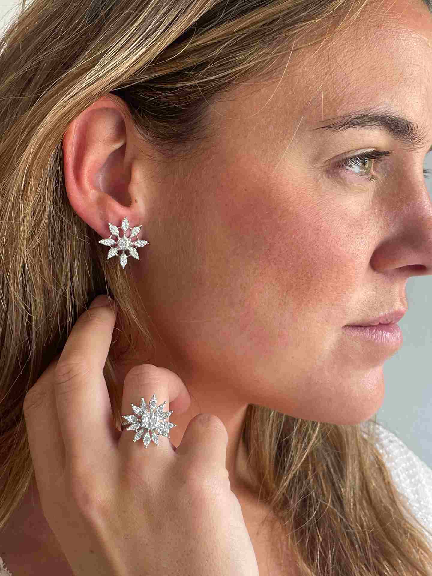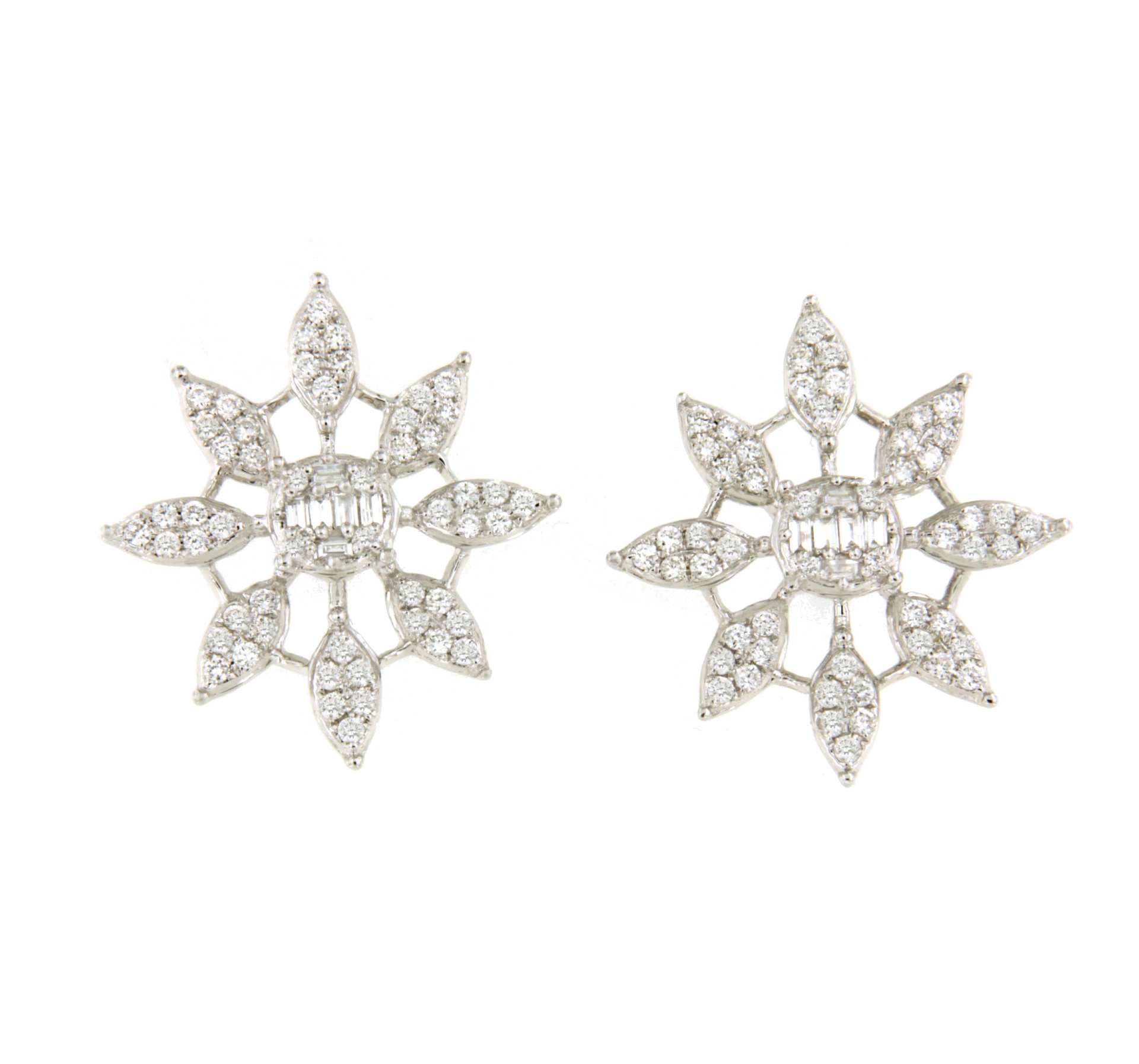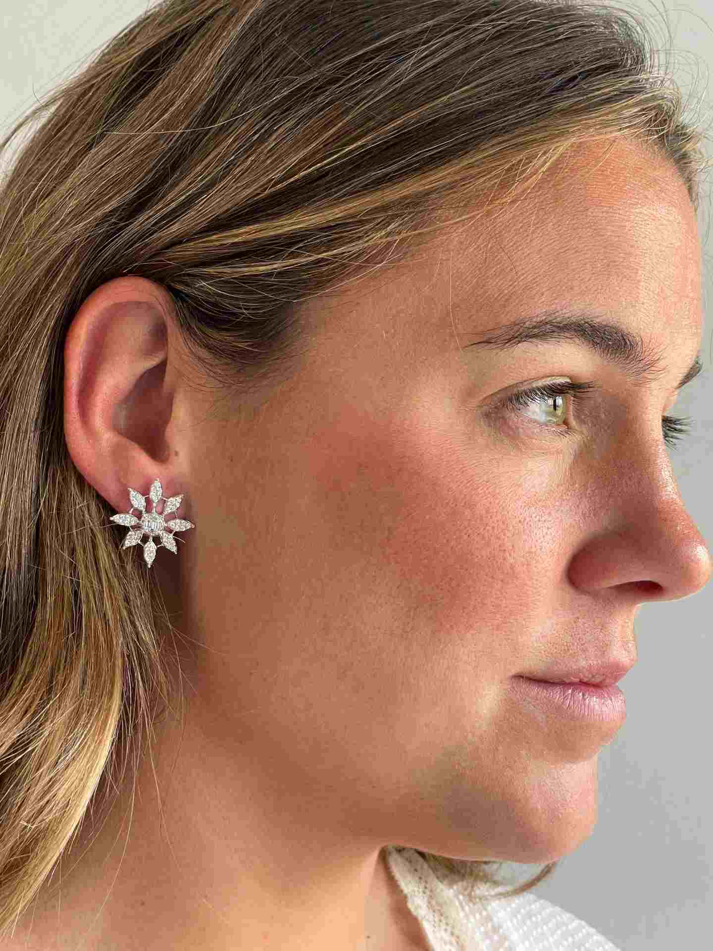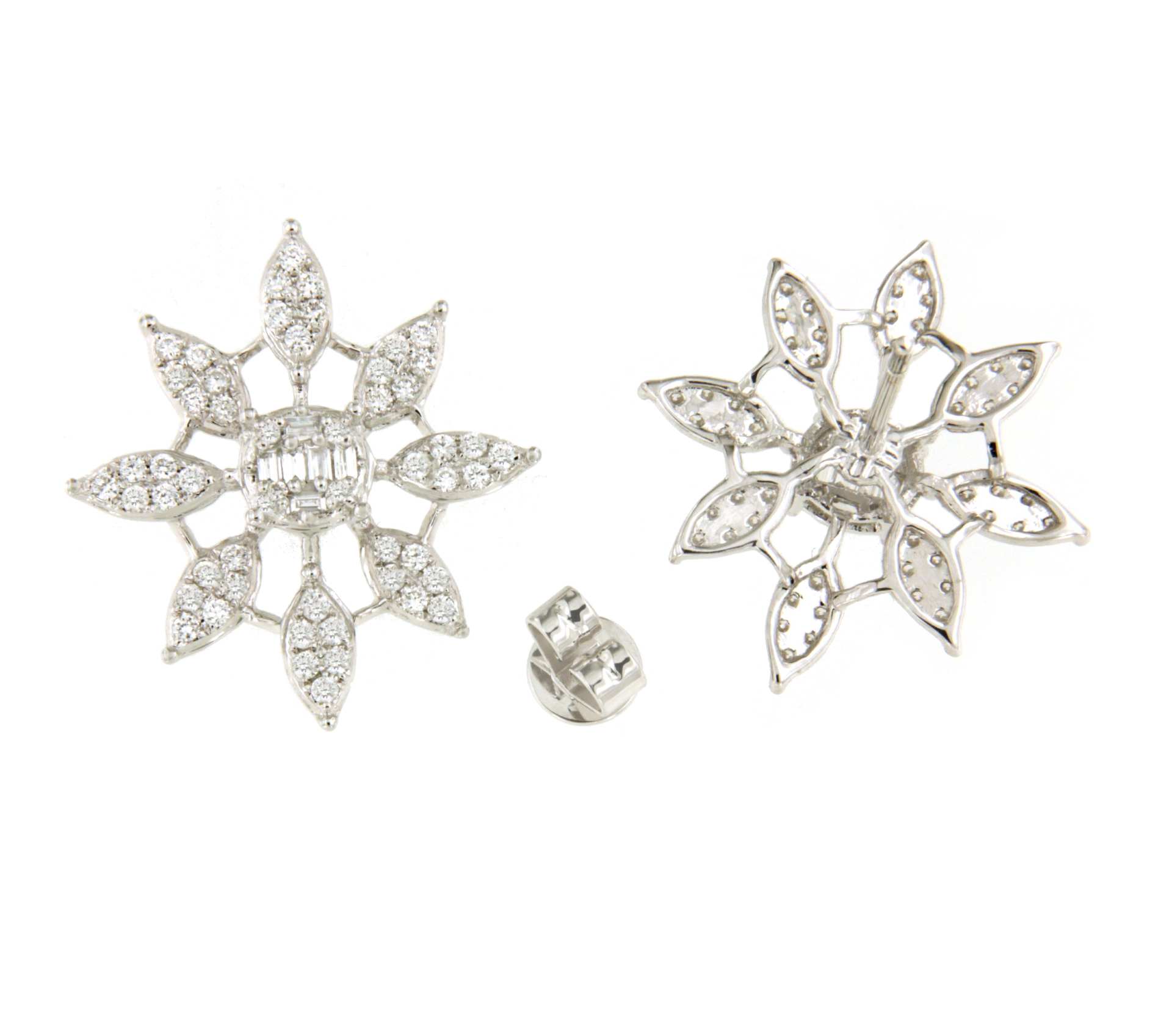 CLARINERO is a super flattering earring that exudes style, made in 18-karat white gold with baguette-cut diamonds and brilliants.
