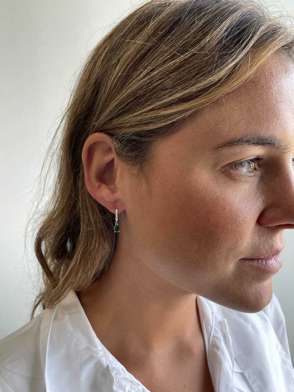 FIFI is a beautiful hoop-type pendant earring , in 18-karat white gold mounted with pear-shaped emerald or sapphire quartz crystals and cubic zirconia with a lot of movement.