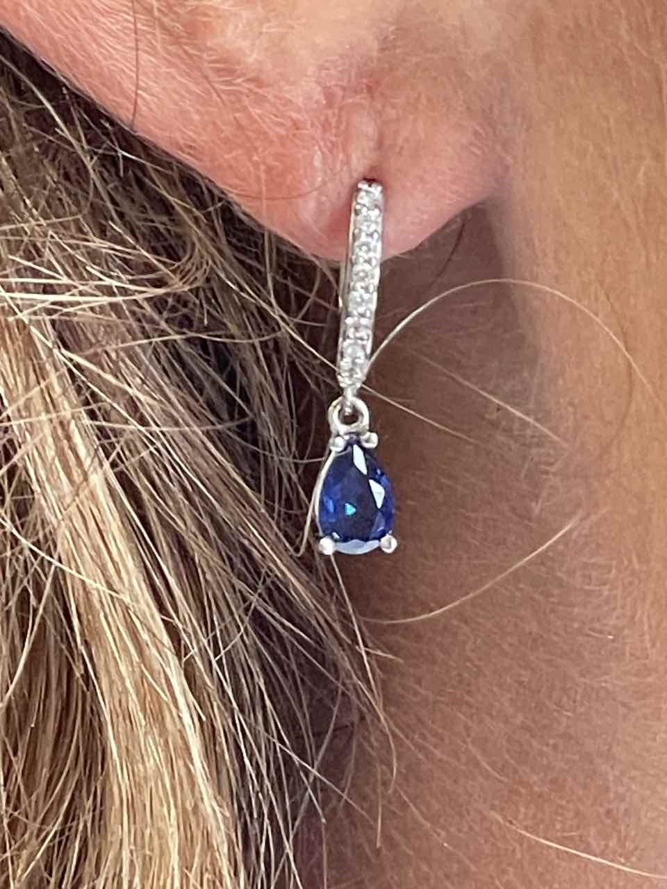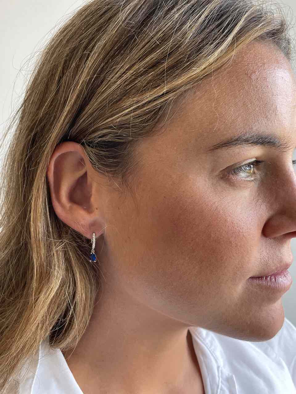 The FIFI earring is a dangling earring in 18-karat white gold with pear-shaped green/blue quartz stones similar in color to emerald/sapphire and cubic zirconia stones with a lot of movement.