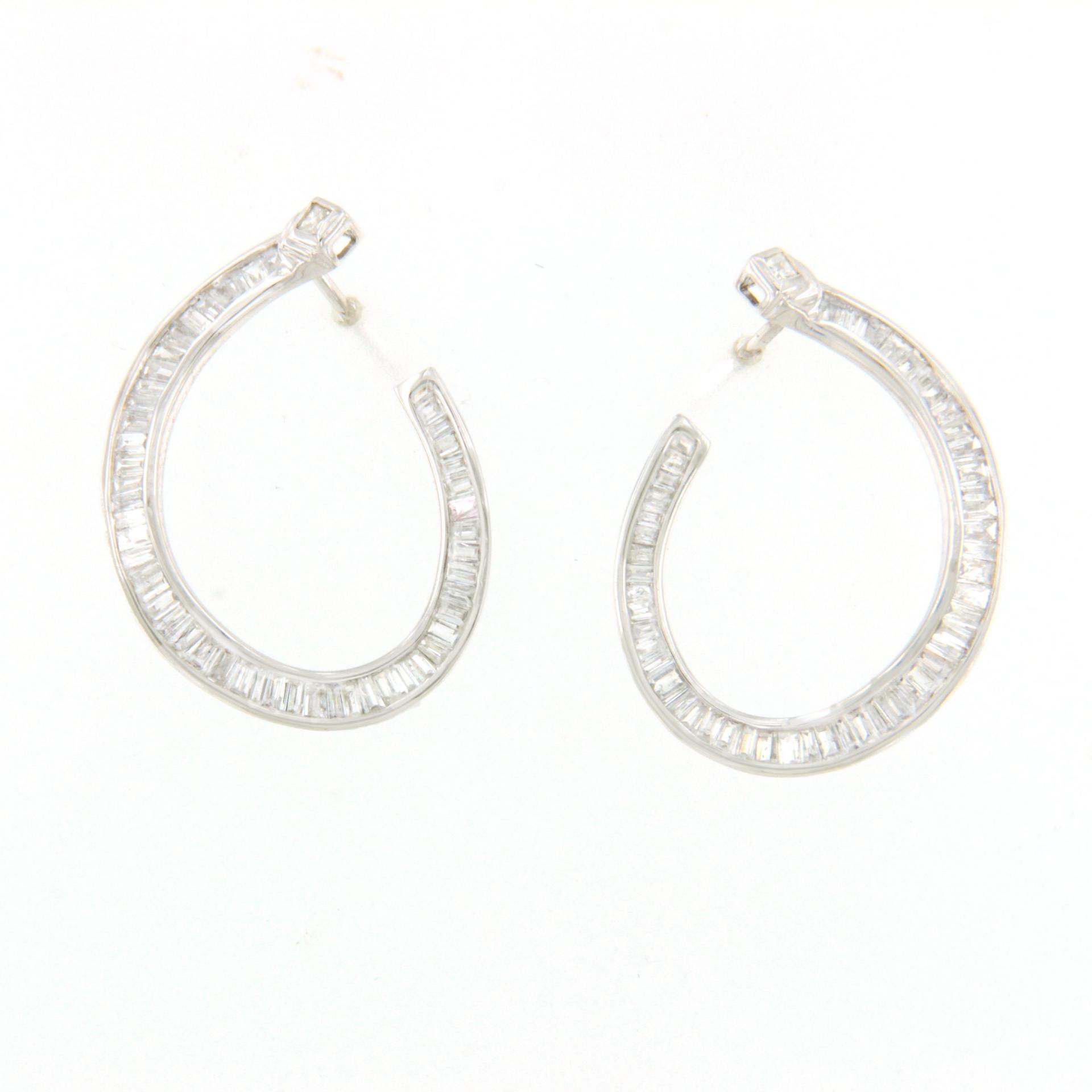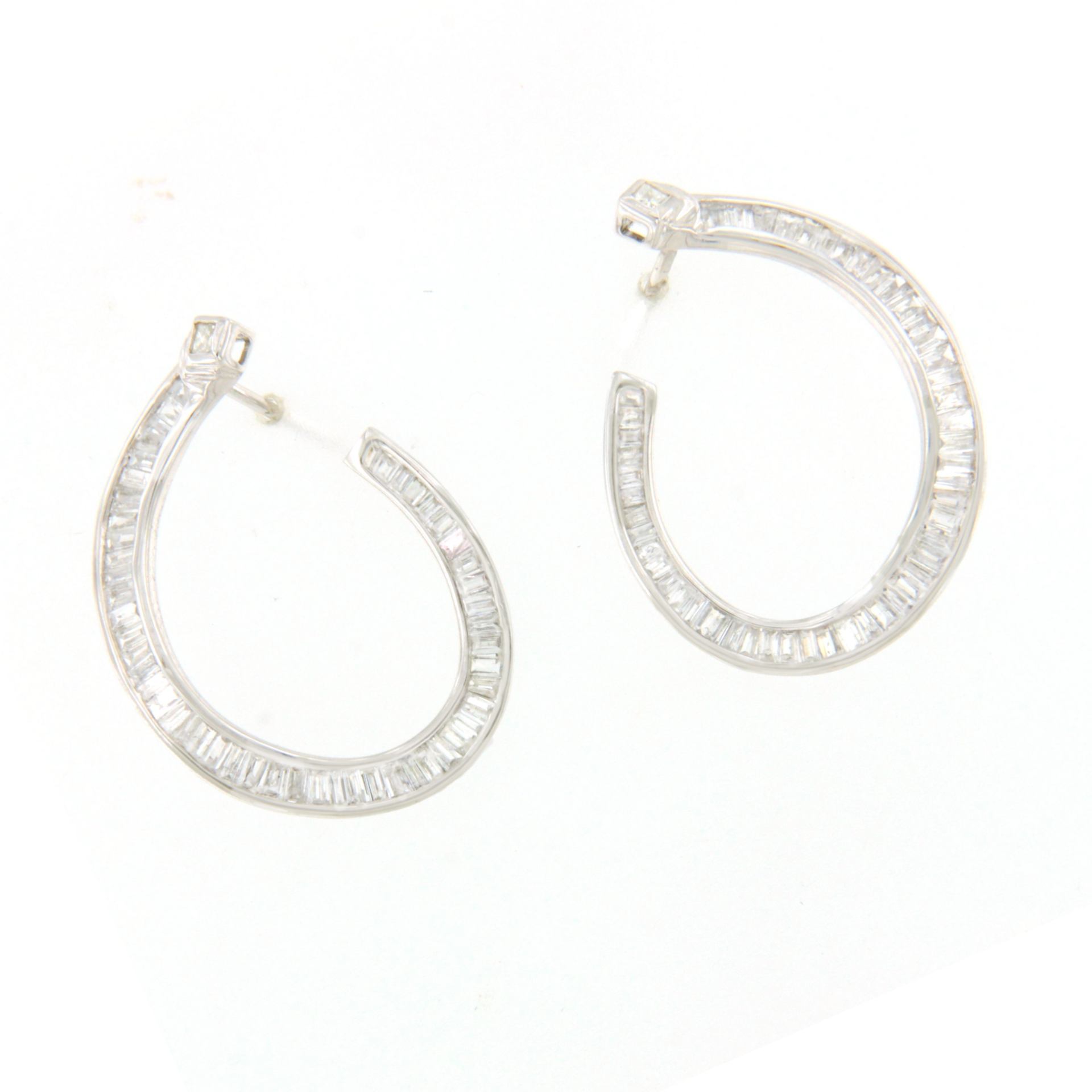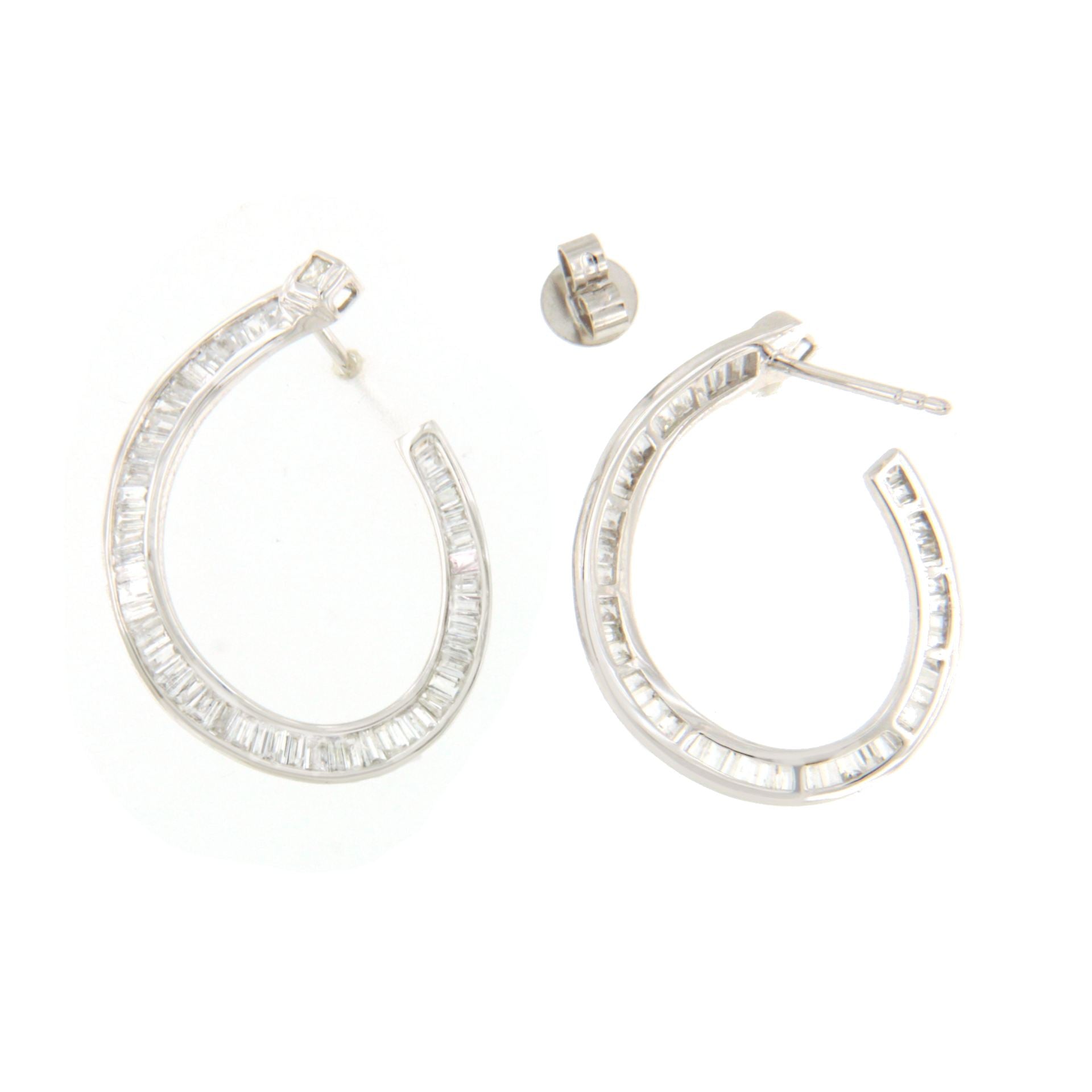 DATIL, modern earrings in a typical Italian style. They consist of an open 18k white gold hoop mounted with baguette bands on a polished, smooth gold edge, giving them a touch of originality. They have a classic push-back closure.