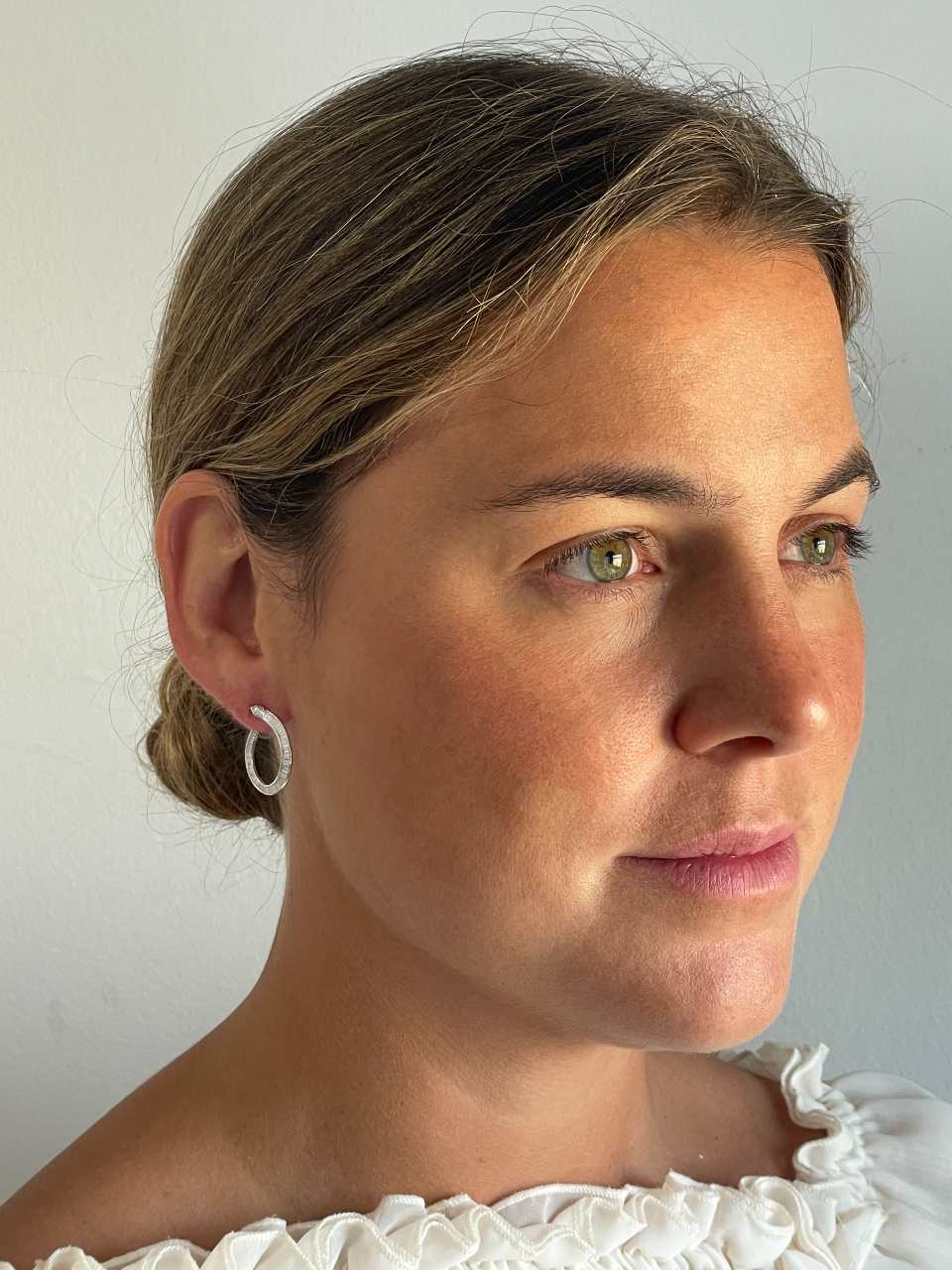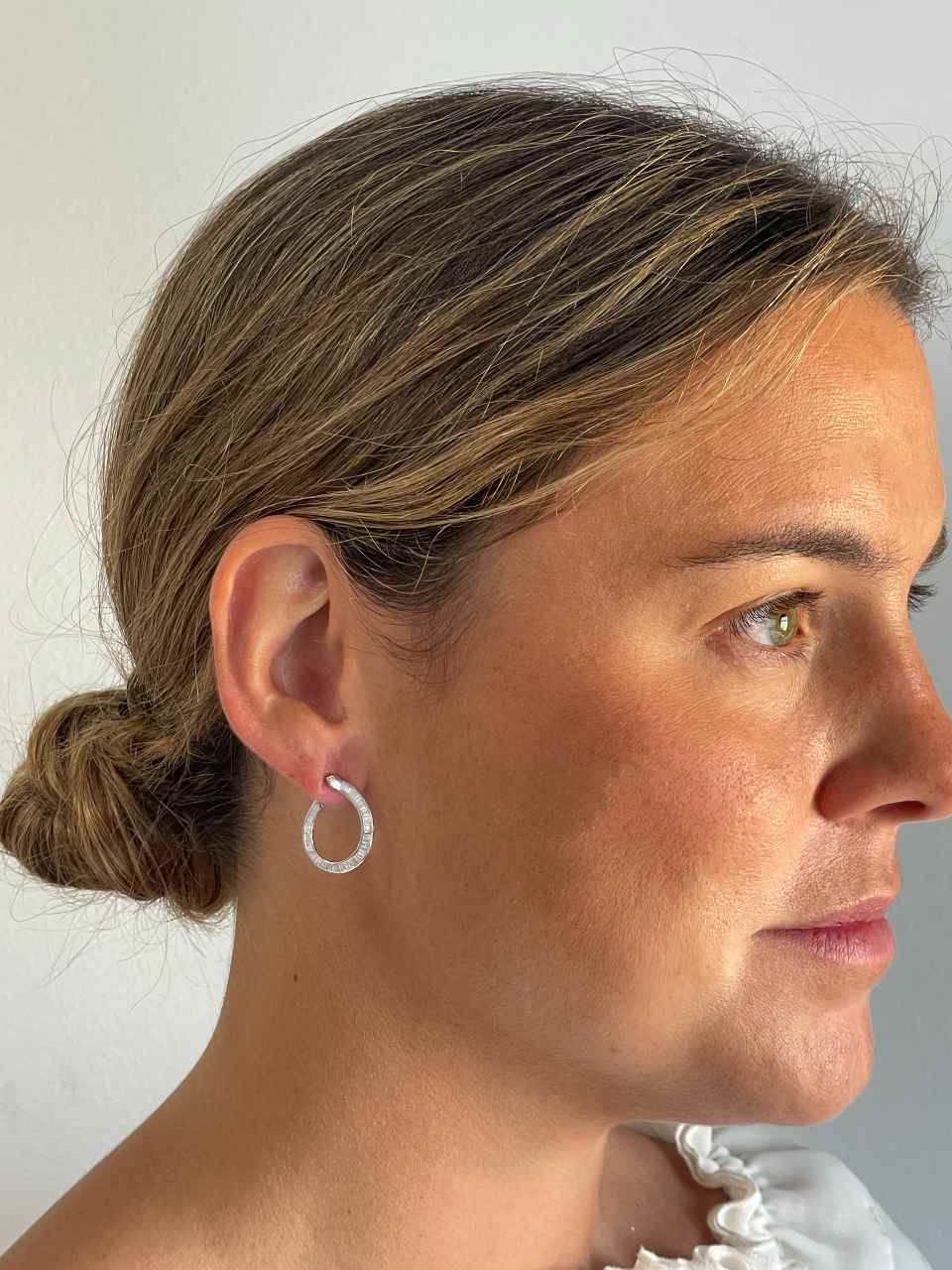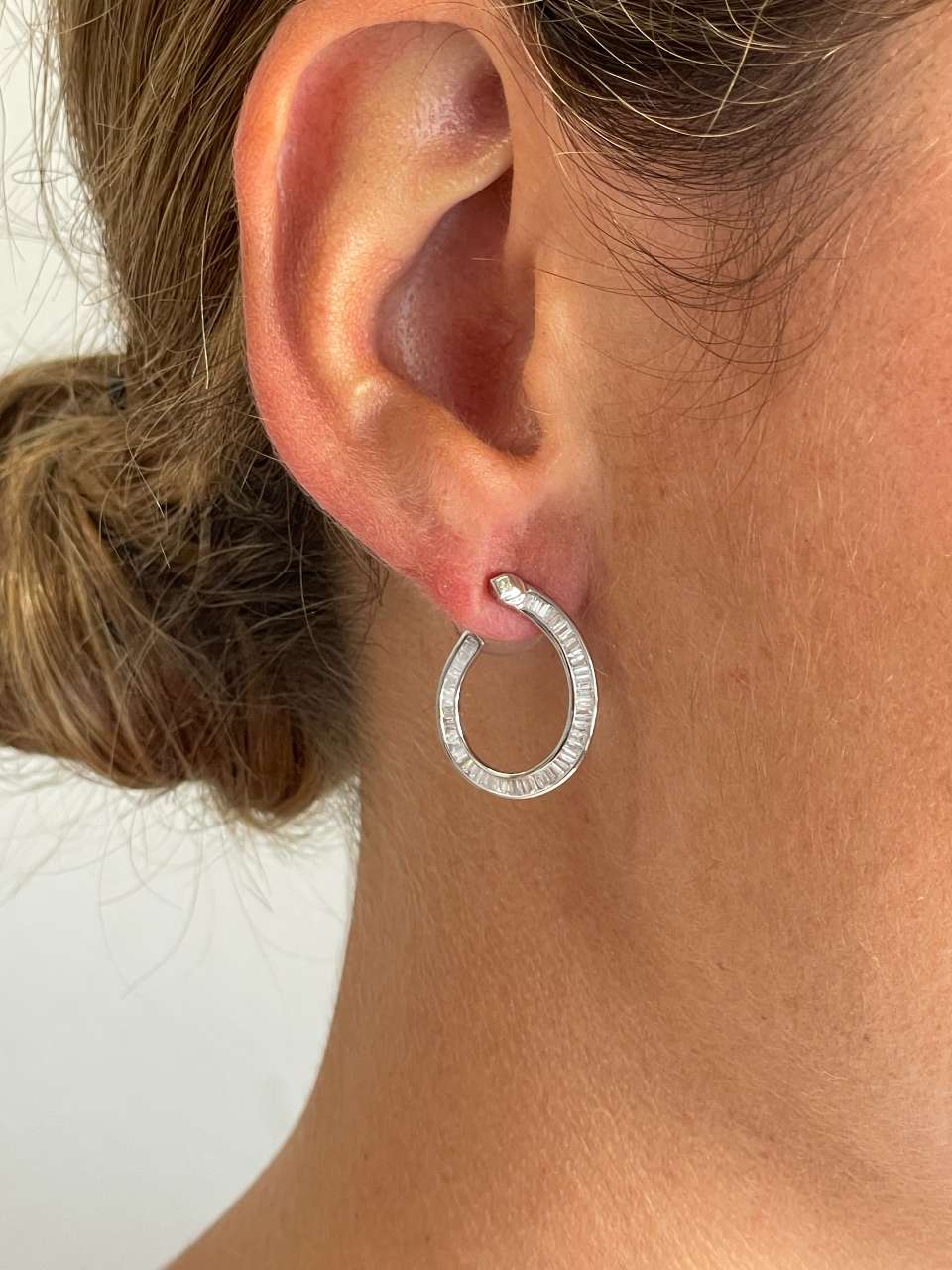 DATIL, modern earrings in a typical Italian style. They consist of an open 18k white gold hoop mounted with baguette bands on a polished, smooth gold edge, giving them a touch of originality. They have a classic push-back closure.