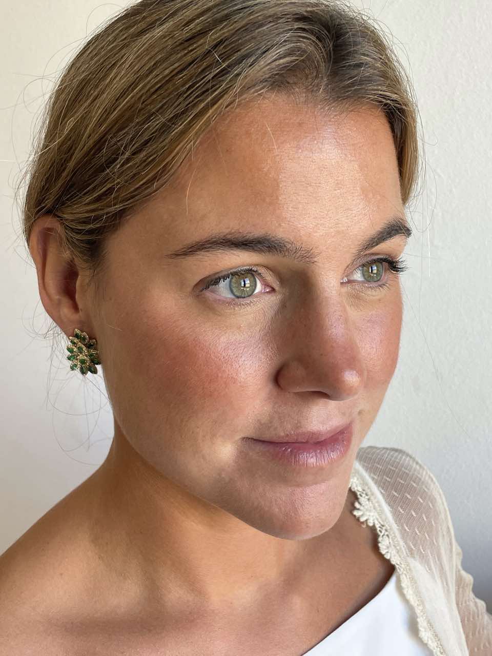 EMERITO , overlapping leaf earrings set in 18-karat yellow gold with emeralds and diamonds . Very original; optionally available for pre-order in white gold.