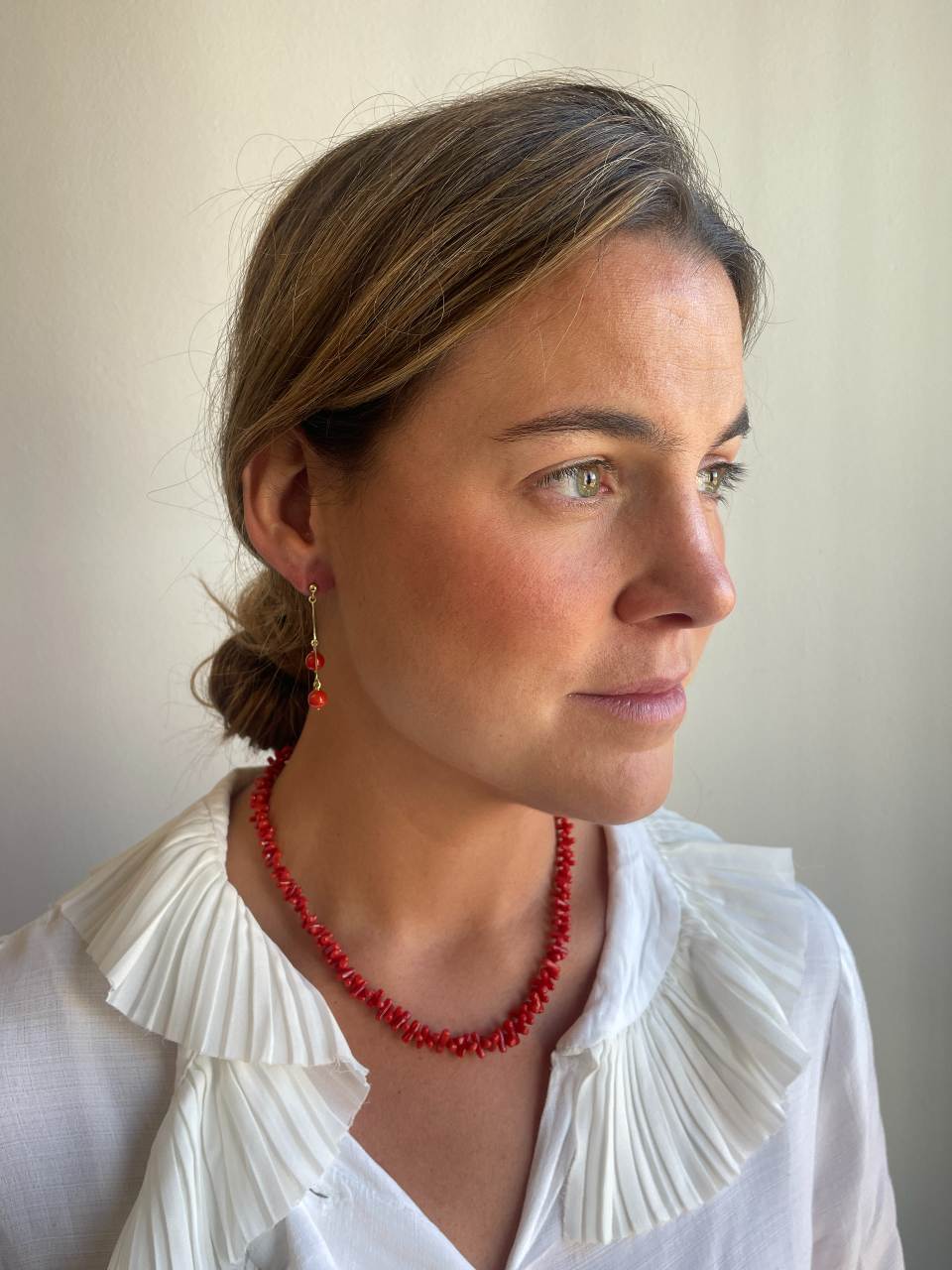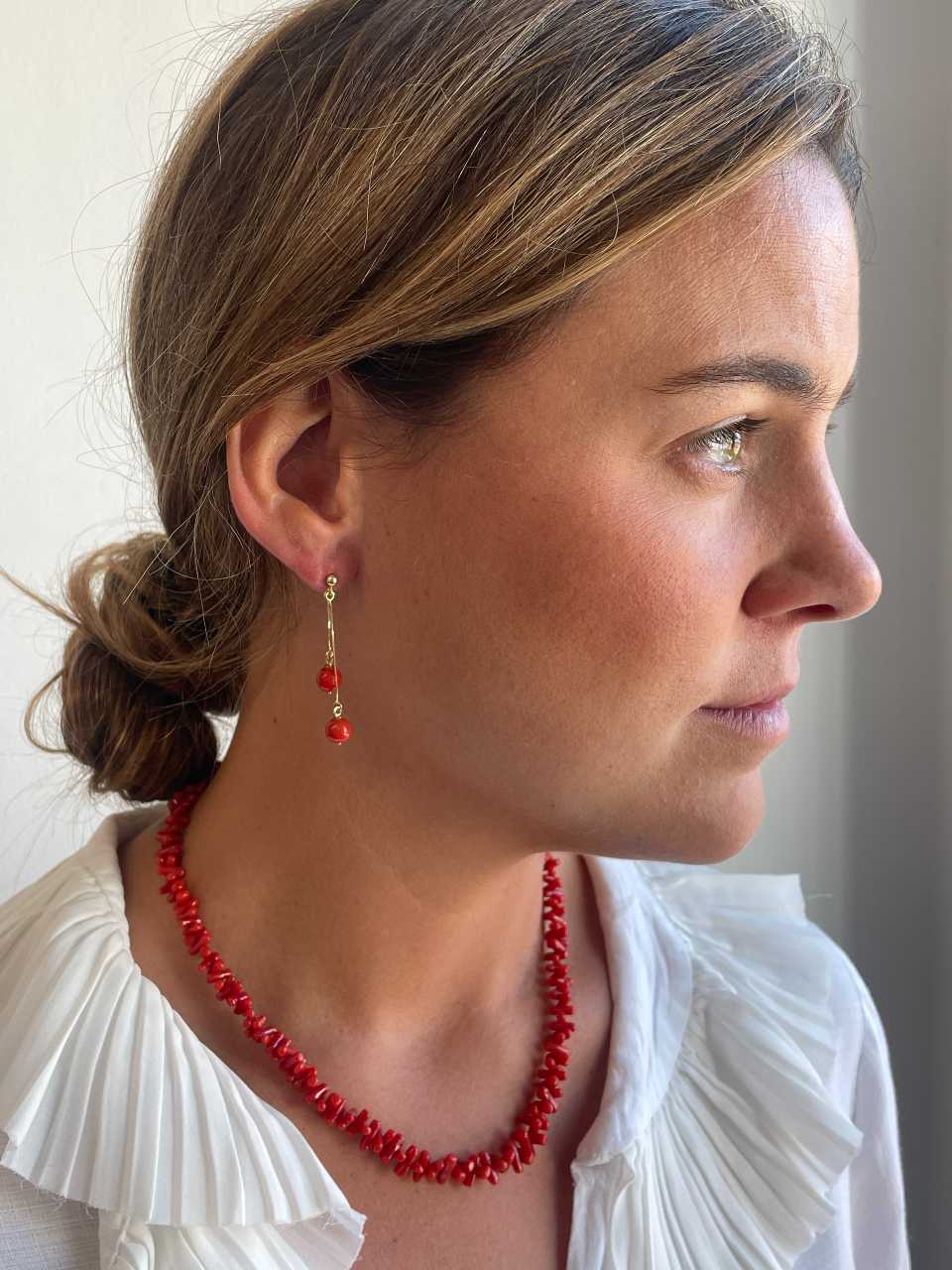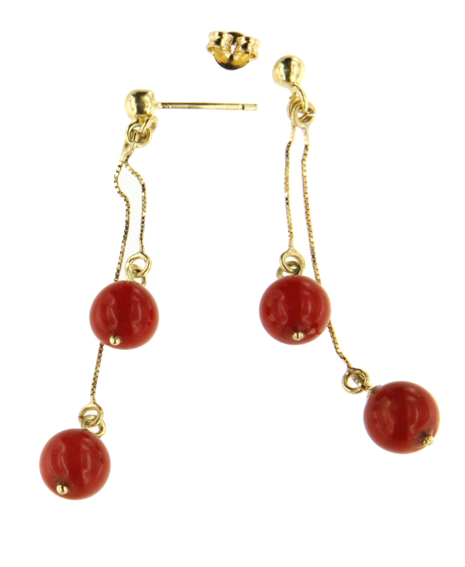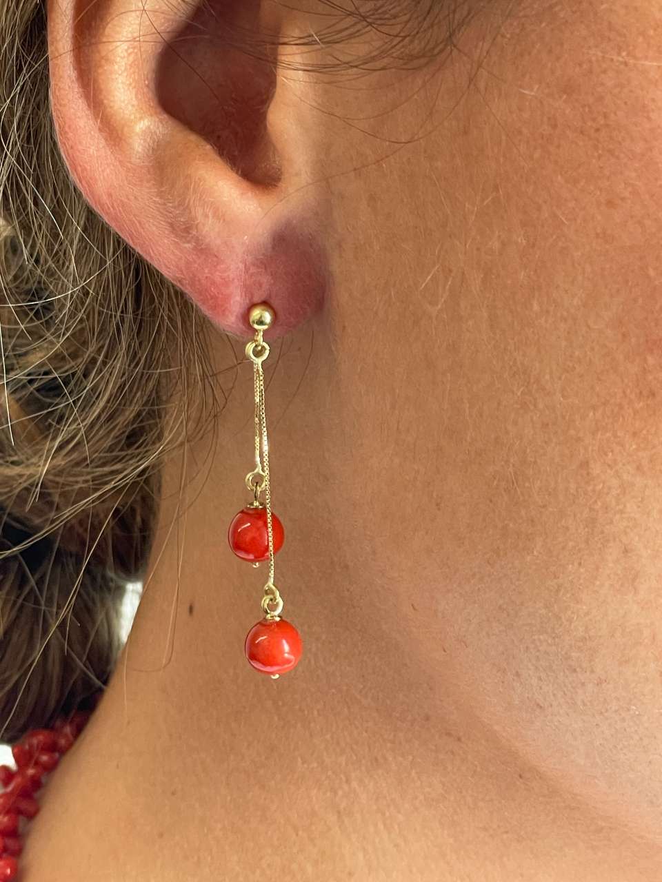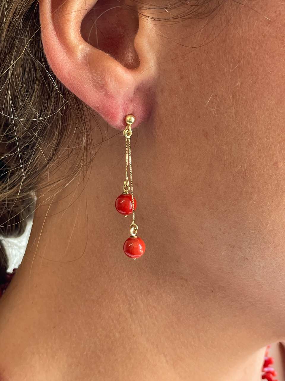 FINGI is a coral earring set in 18-karat yellow gold . Its design features a small gold ball from which two delicate chains hang, each adorned with a round coral bead at a different height . Absolutely perfect!